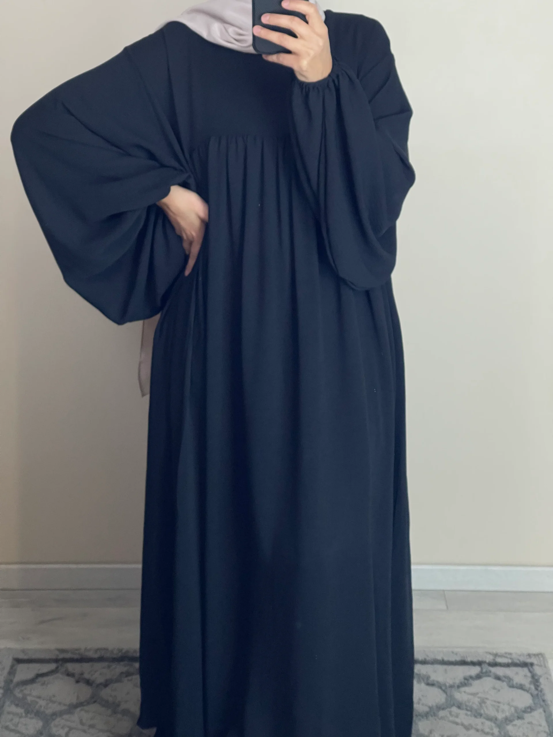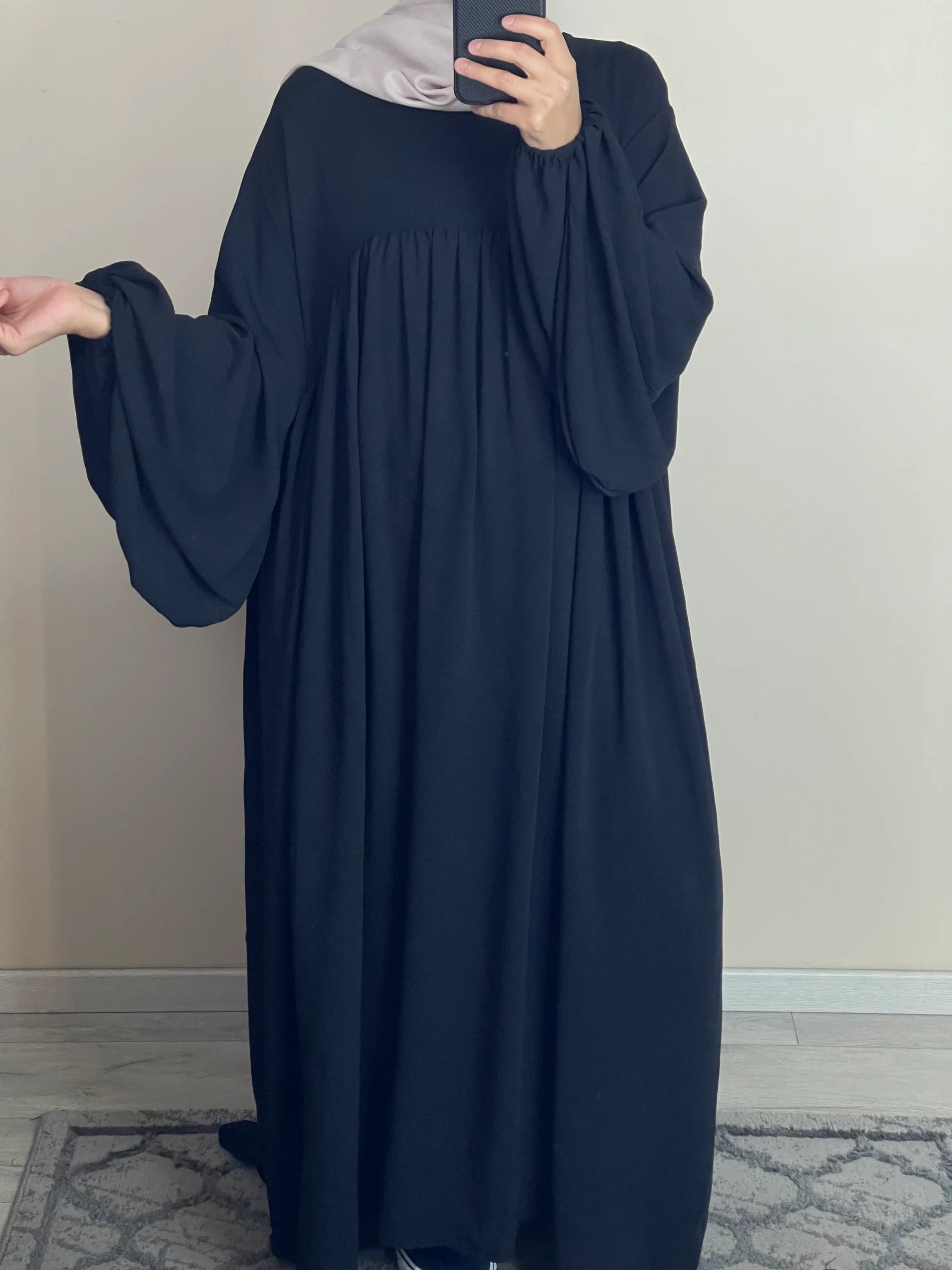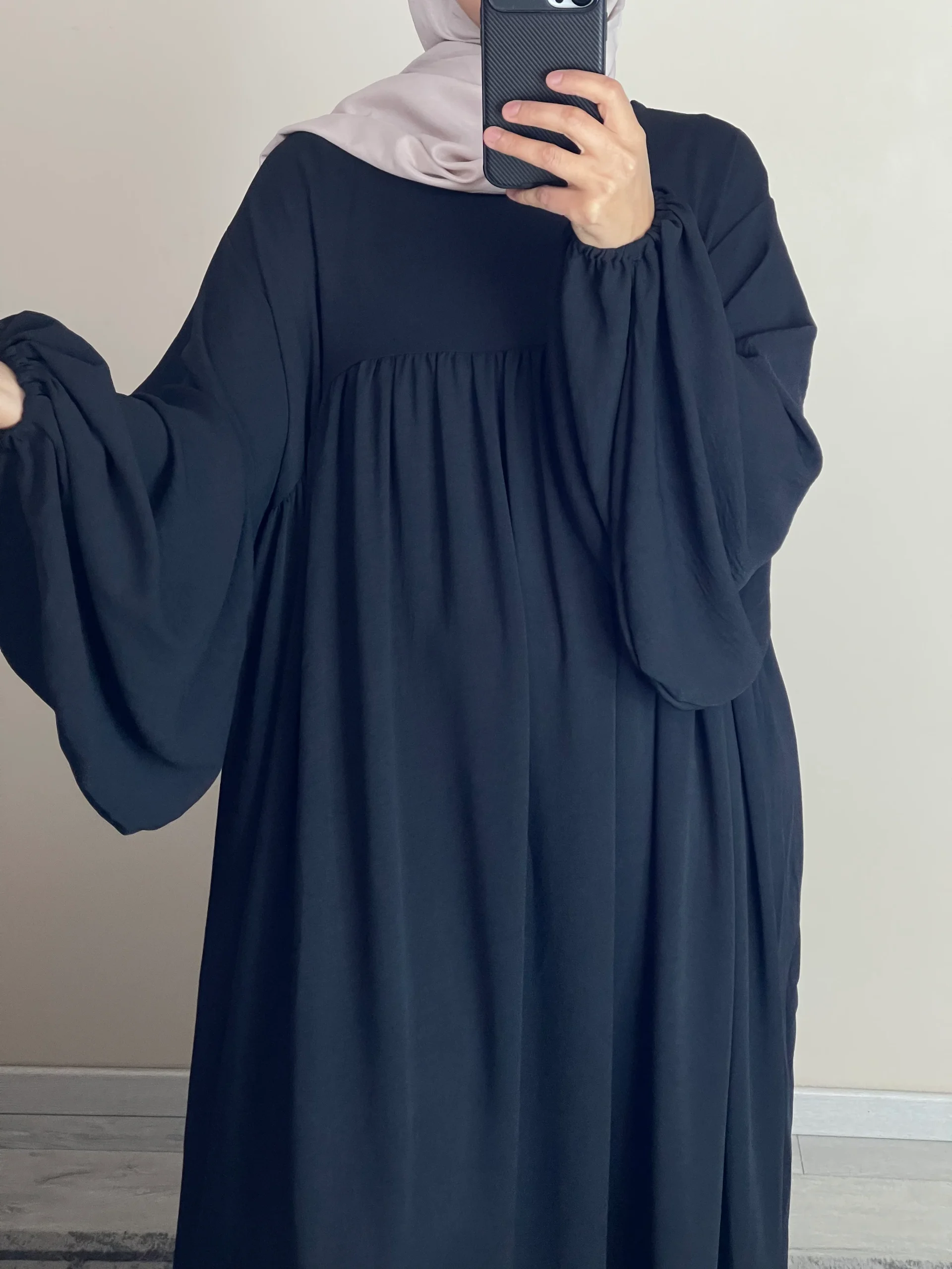 Maxi abaya taille unique Manche bouffantes Tissu Jazz Convient du 36 au 50 voir plus ( coupe très large) qualité +++ Existe en plusieurs couleurs La mannequin mesure 1M68 blanc légèrement transparent 2211
