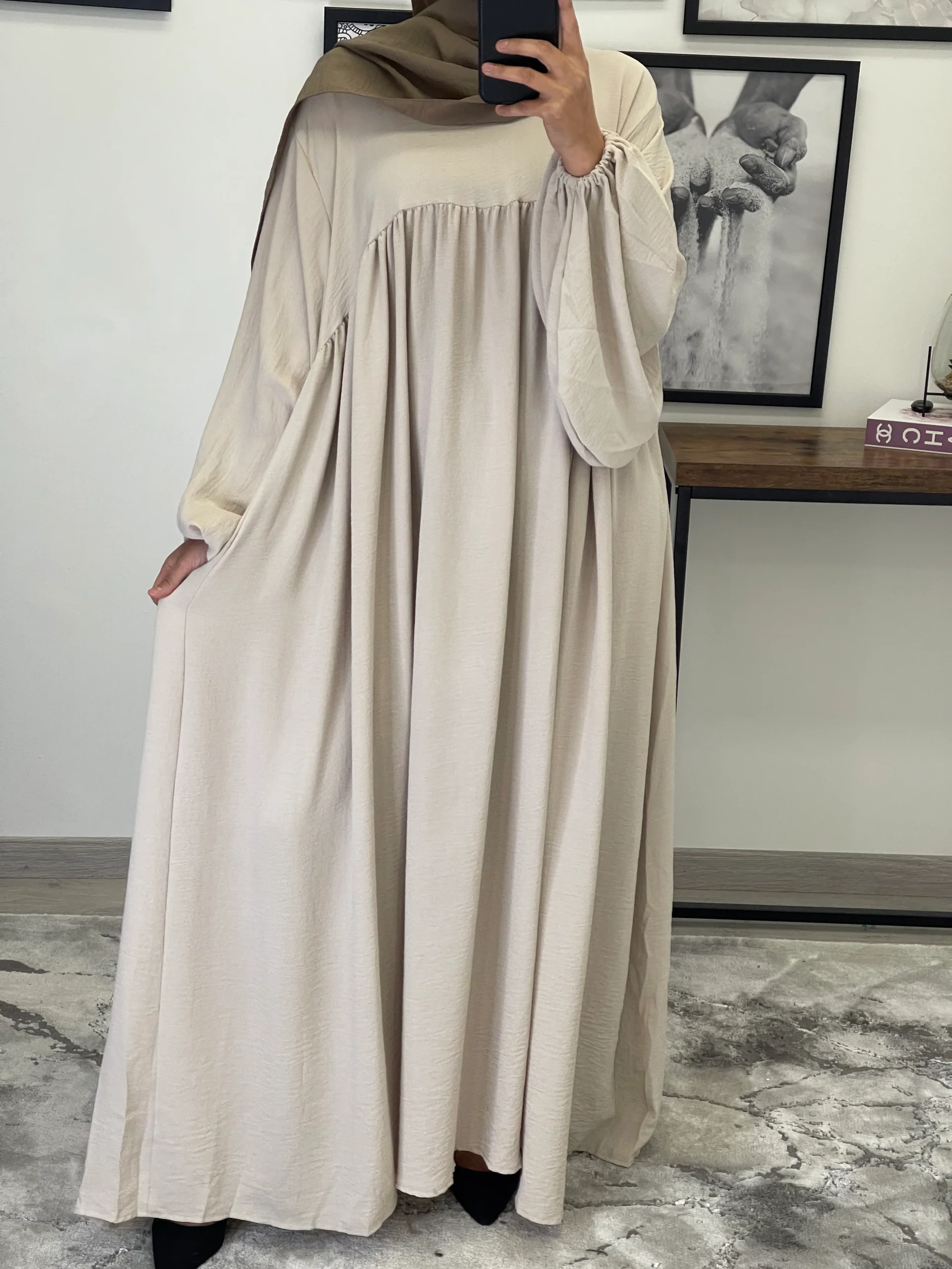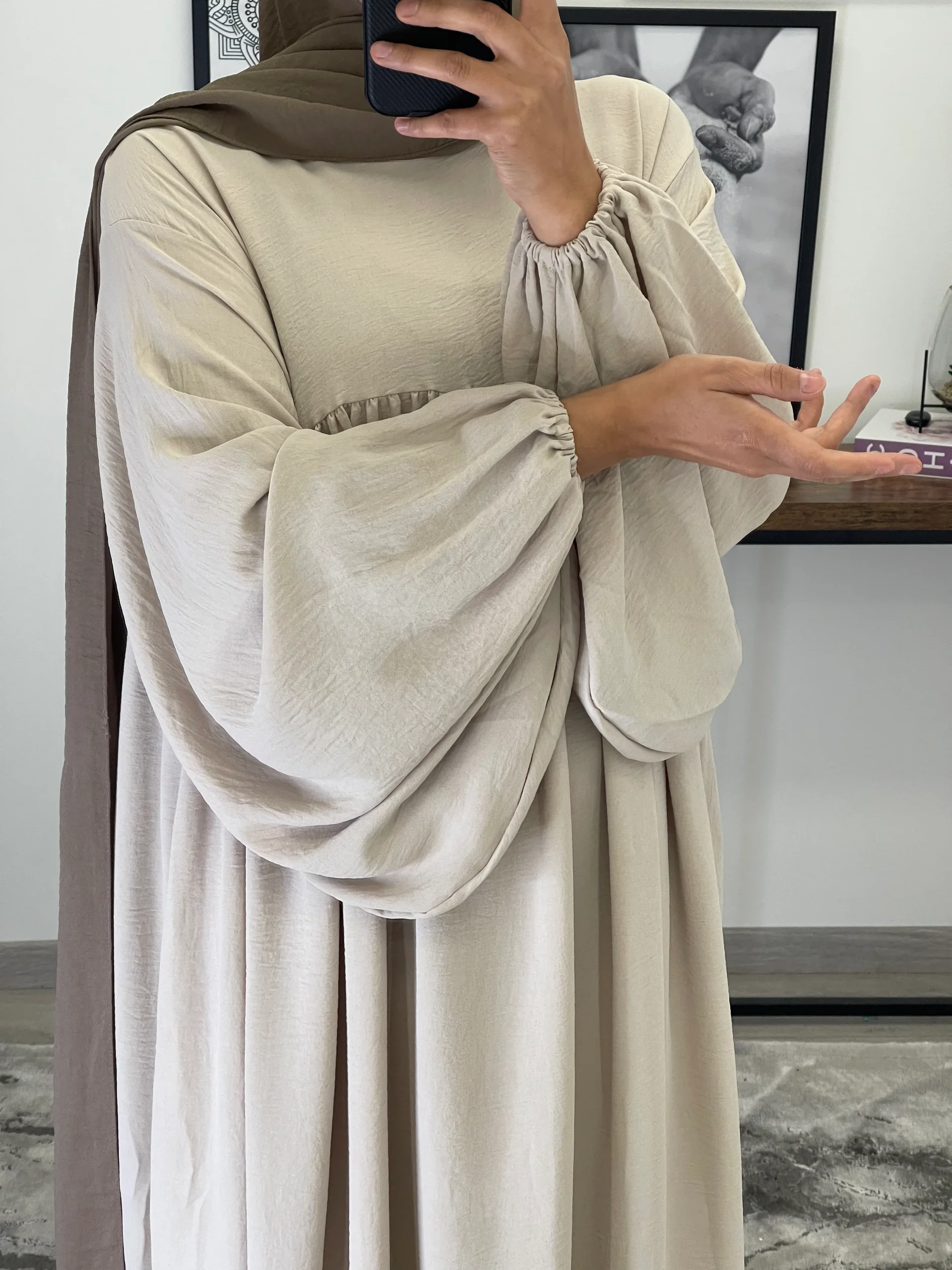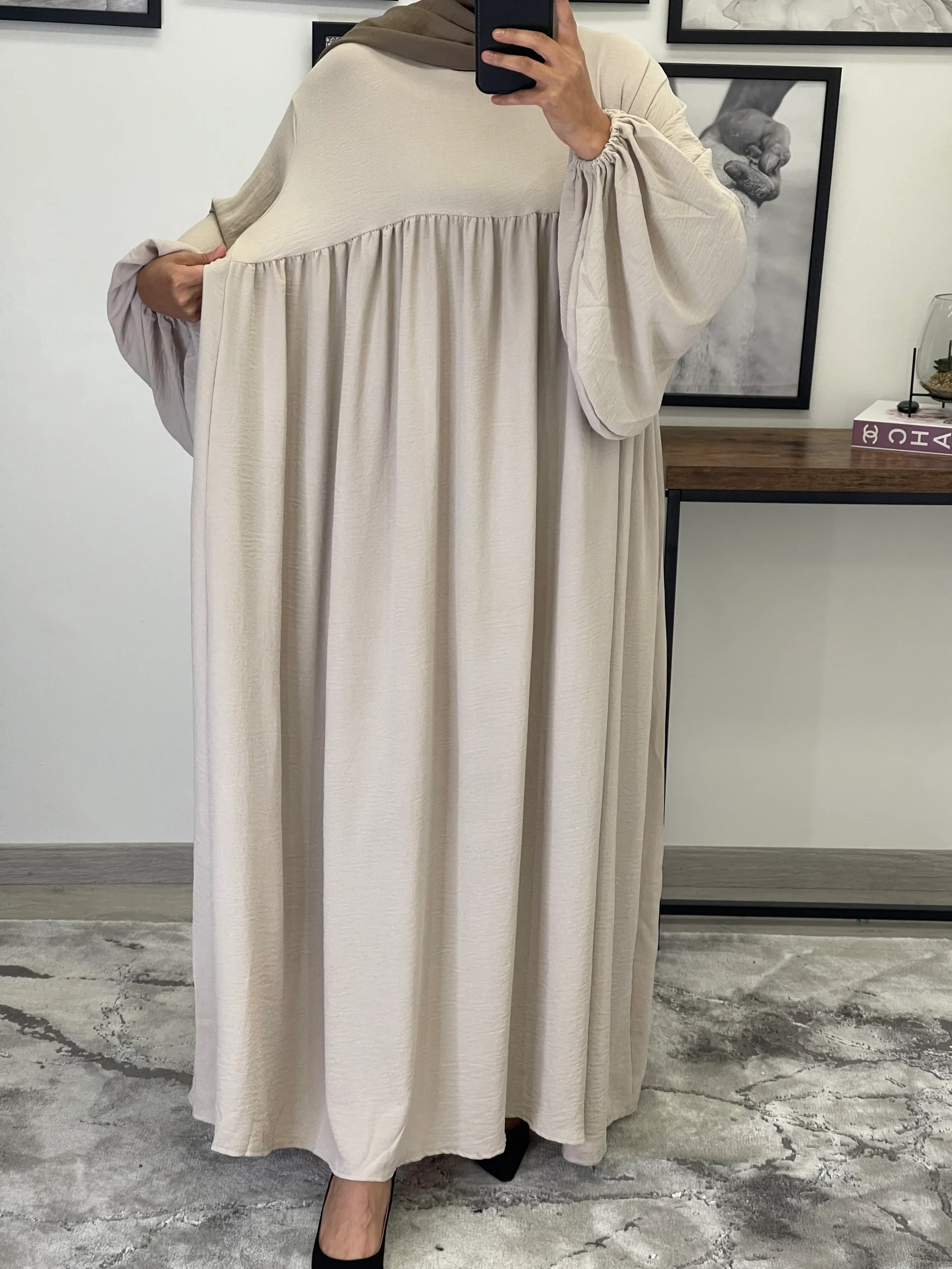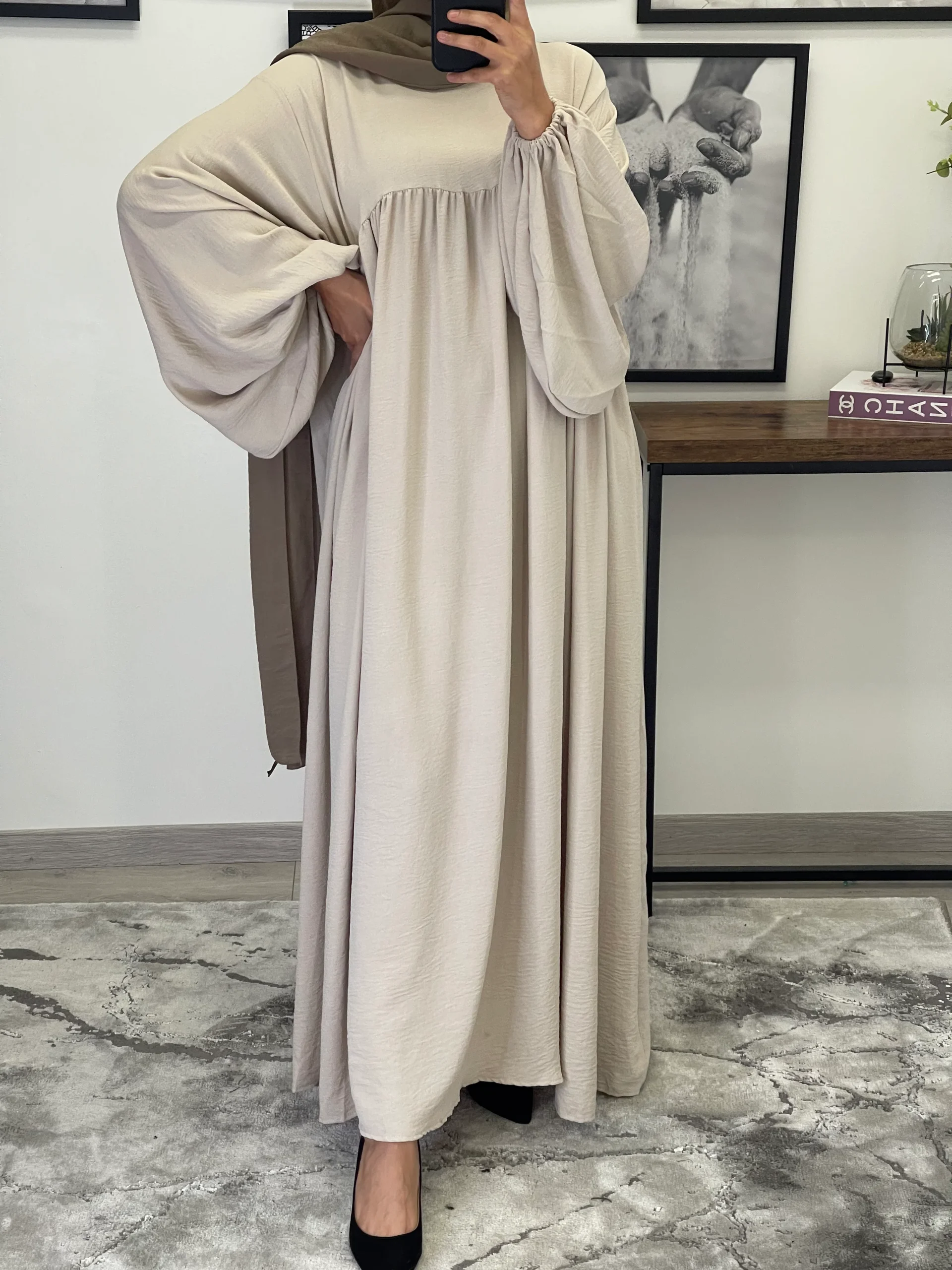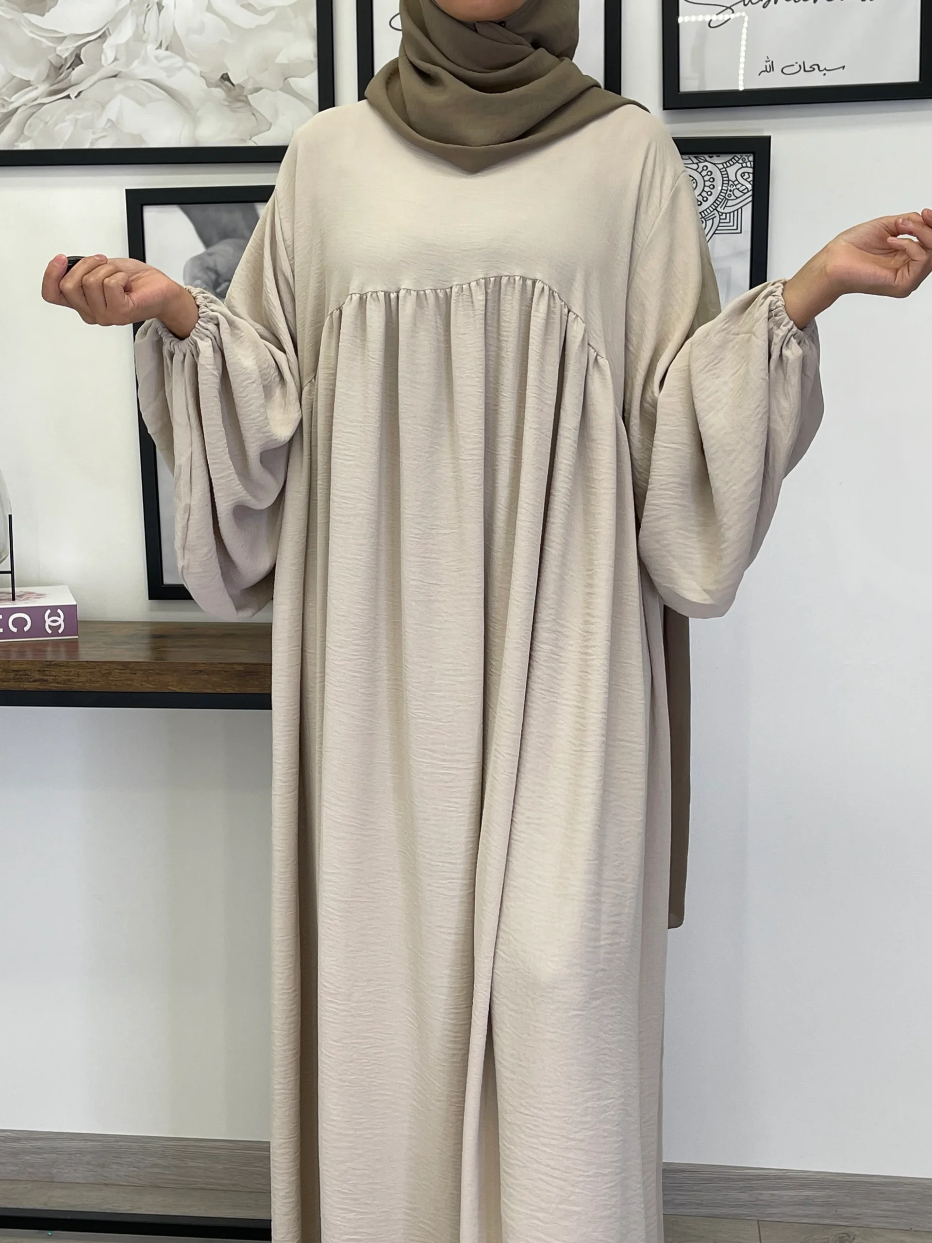 Maxi abaya taille unique Manche bouffantes Tissu Jazz Convient du 36 au 50 voir plus ( coupe très large) qualité +++ Existe en plusieurs couleurs La mannequin mesure 1M68