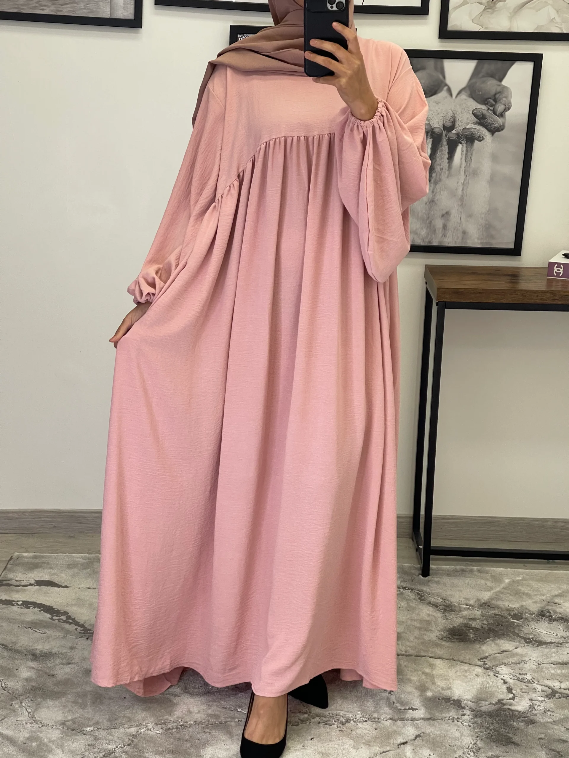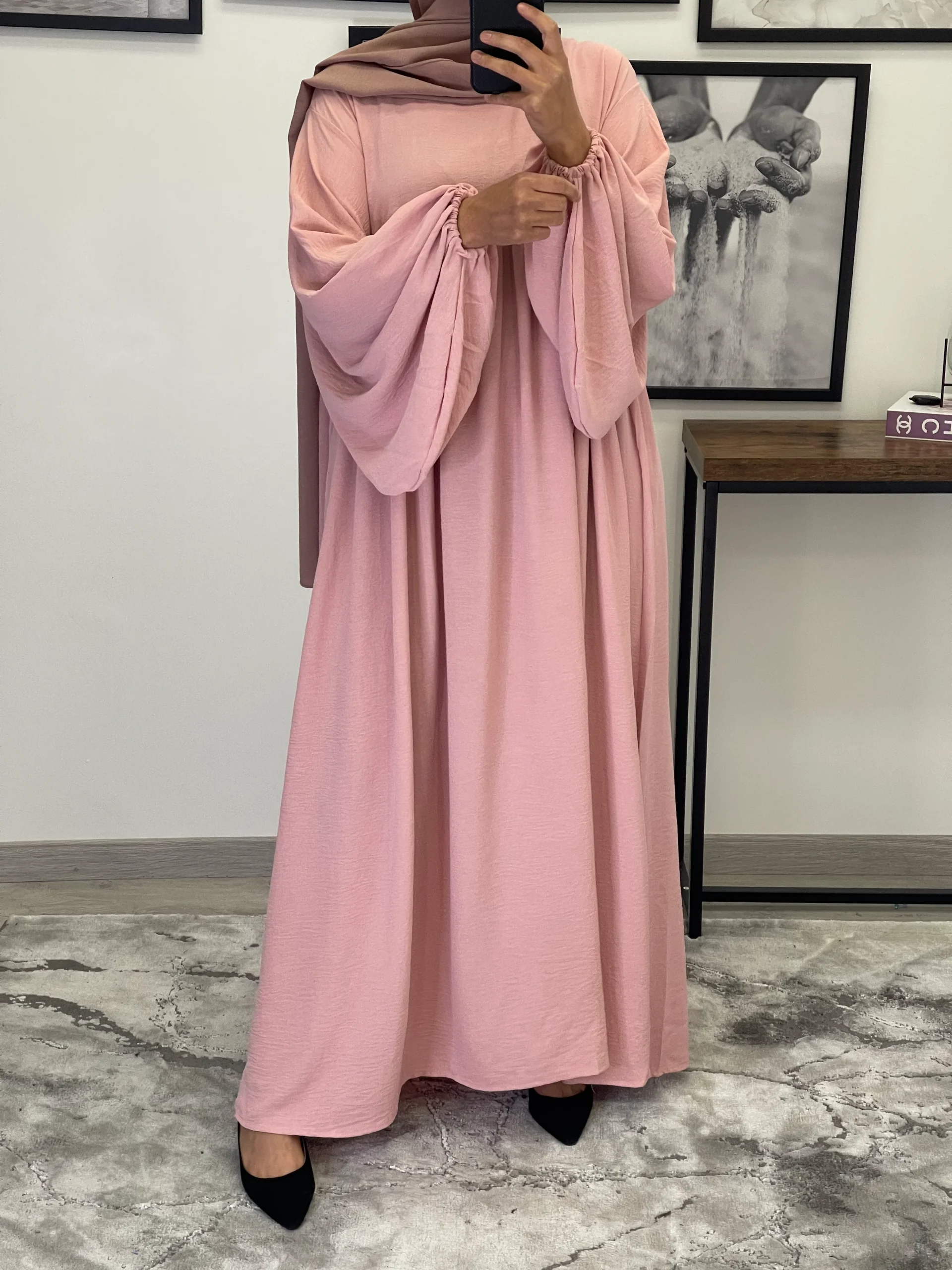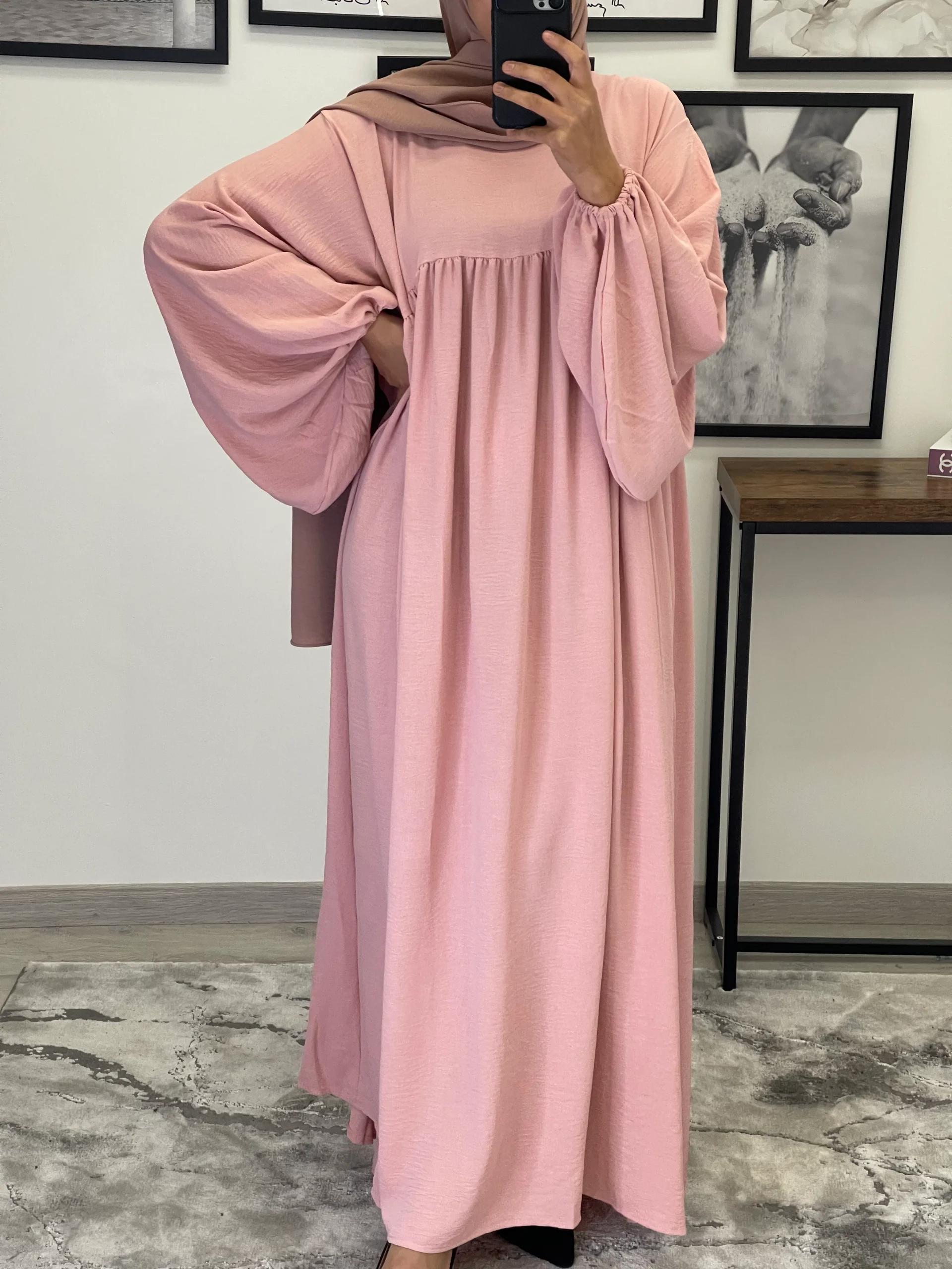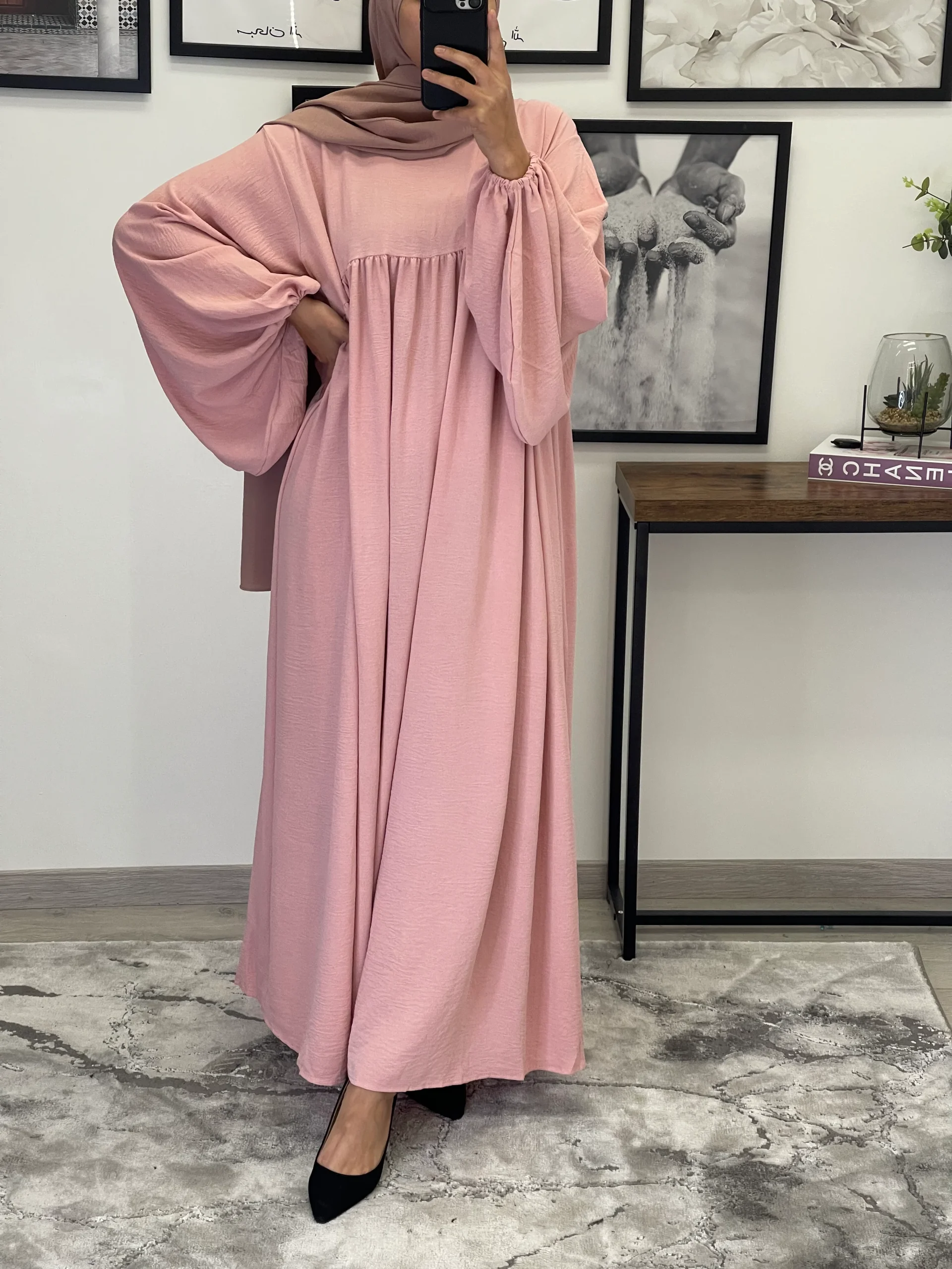Maxi abaya taille unique Manche bouffantes Tissu Jazz Convient du 36 au 50 voir plus ( coupe très large) qualité +++ Existe en plusieurs couleurs La mannequin mesure 1M68