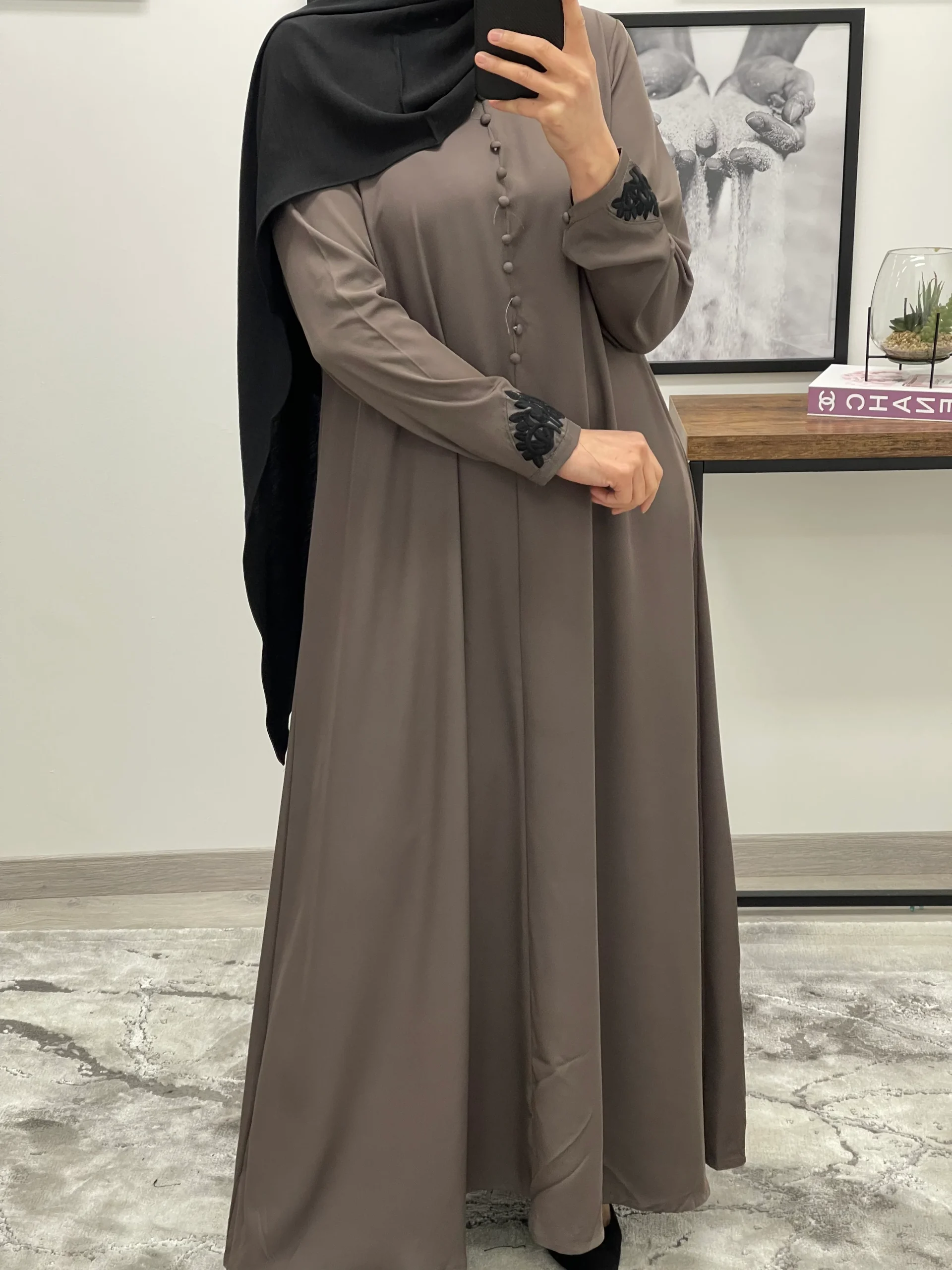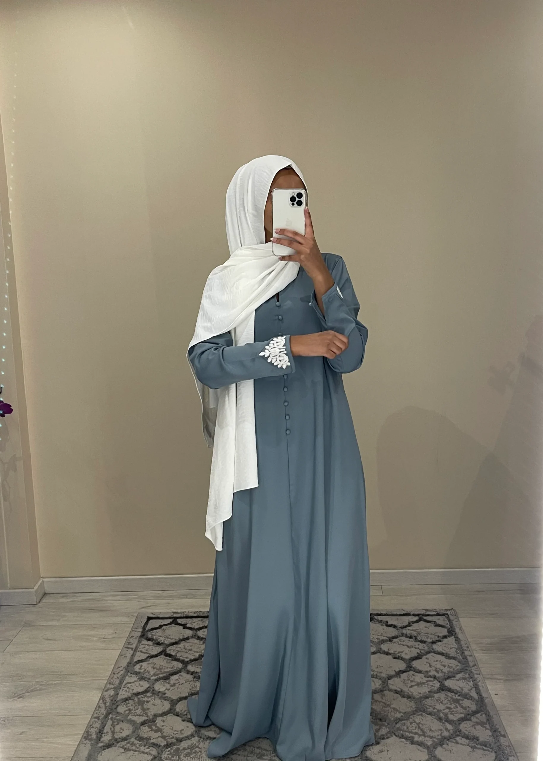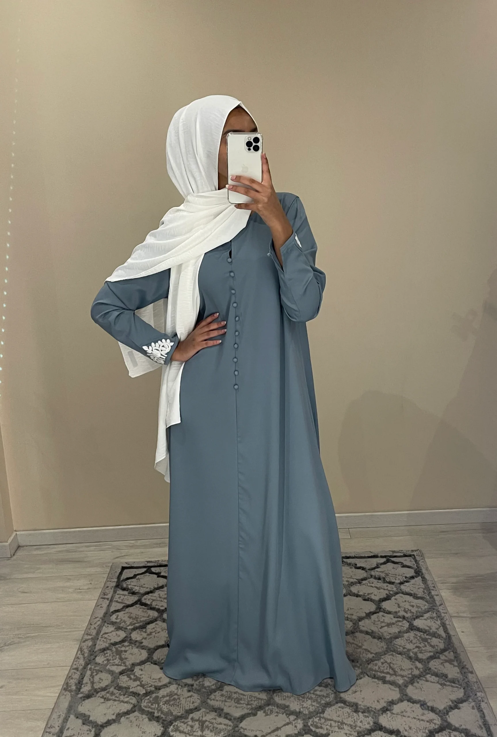 Robe évasée tissu opaque et fluide. Longueur 140cm. Broderie sur la manches Le modèle mesure 1m68 porte T1 T1 (36/38). T2 (40/42). T3 (42/44) Ref 1861