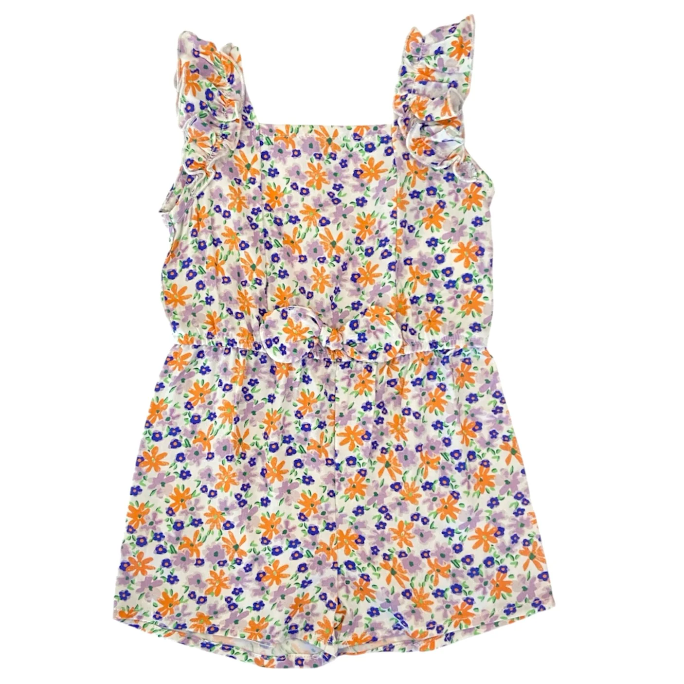 Col carré Manches bretelles à volants Ouverture à bouton au dos Élastique a la taille avec boucle décorative Une barboteuse mignonne et légère, permettant de se déplacer facilement dehors ou à l’intérieur. Un design fleuri pour toutes occasions!