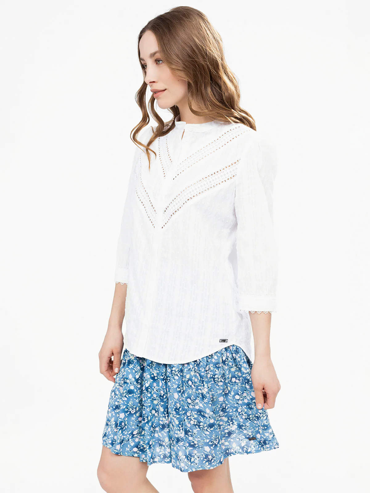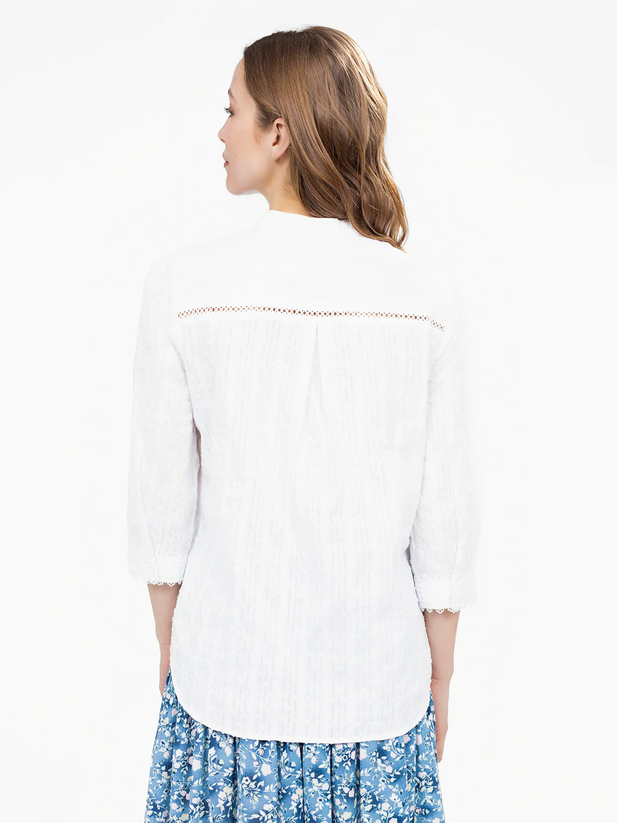 Blouse droite à col montant fendu, animée de bandes ajourées en V sur le devant et d’une ligne ajourée horizontale dans le dos. Les manches 3/4 sont terminées par un feston délicat.