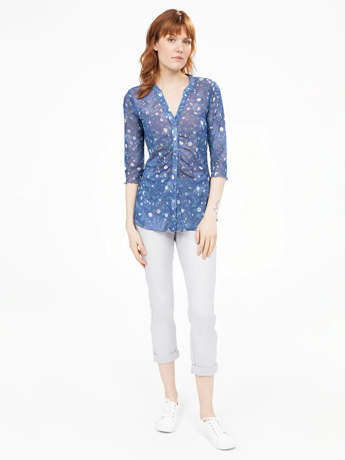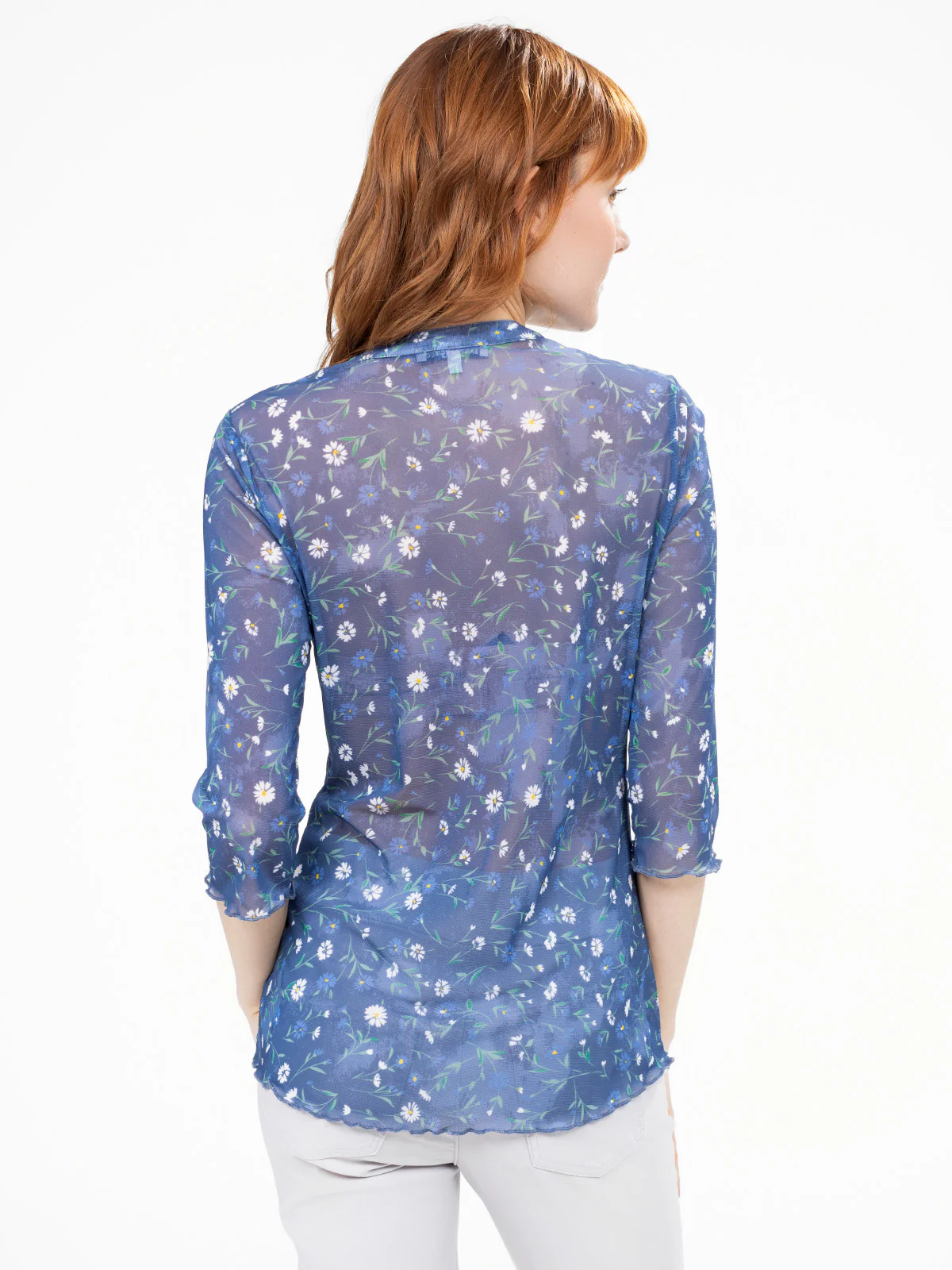 Blouse en tulle imprimé, légèrement froncée à l’avant et boutonnée jusqu’en bas. Le tissu transparent laisse deviner la silhouette et met en valeur les motifs floraux fins.