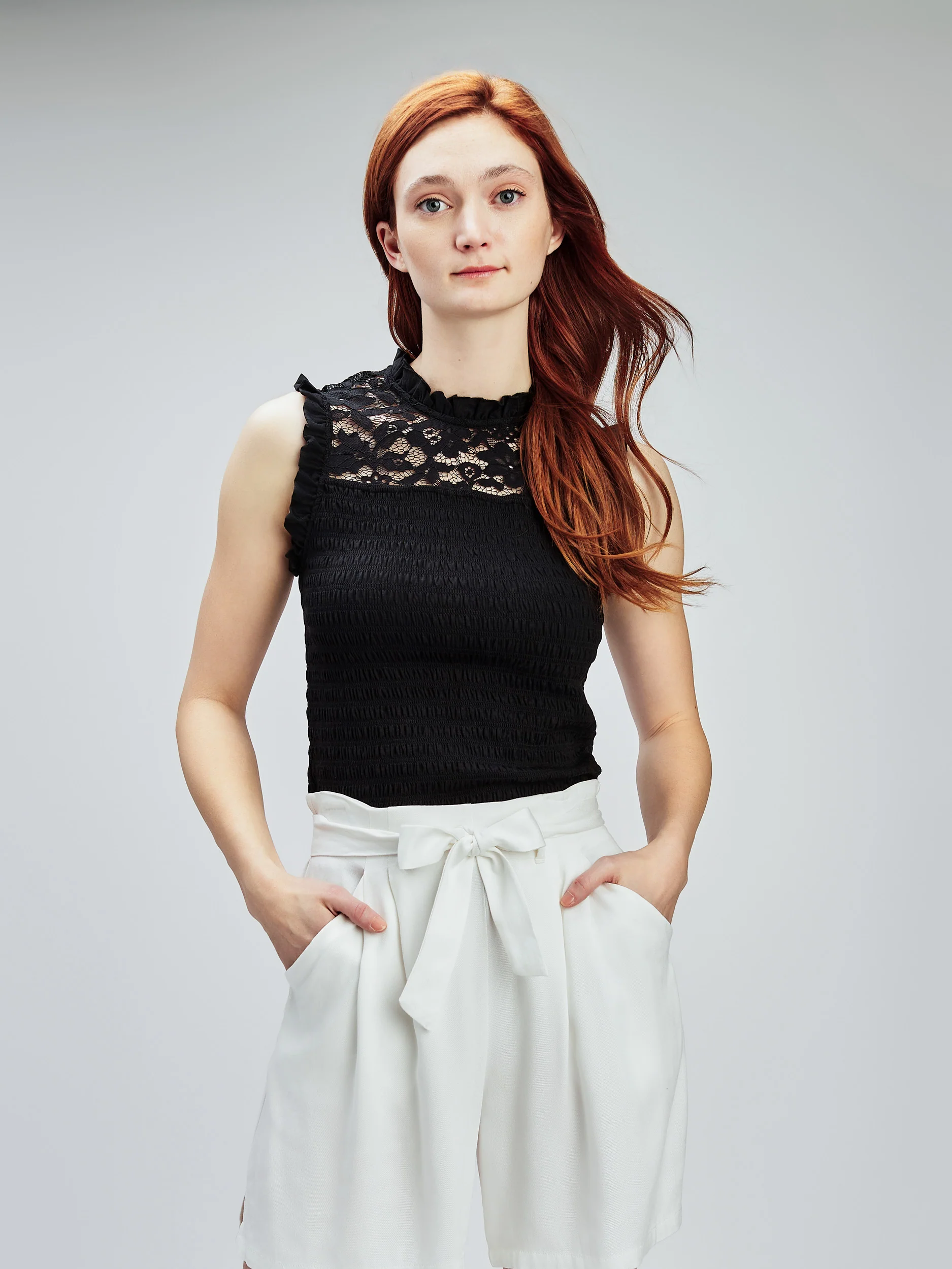 Camisole avec corsage smocké et empiècement féminin en dentelle.