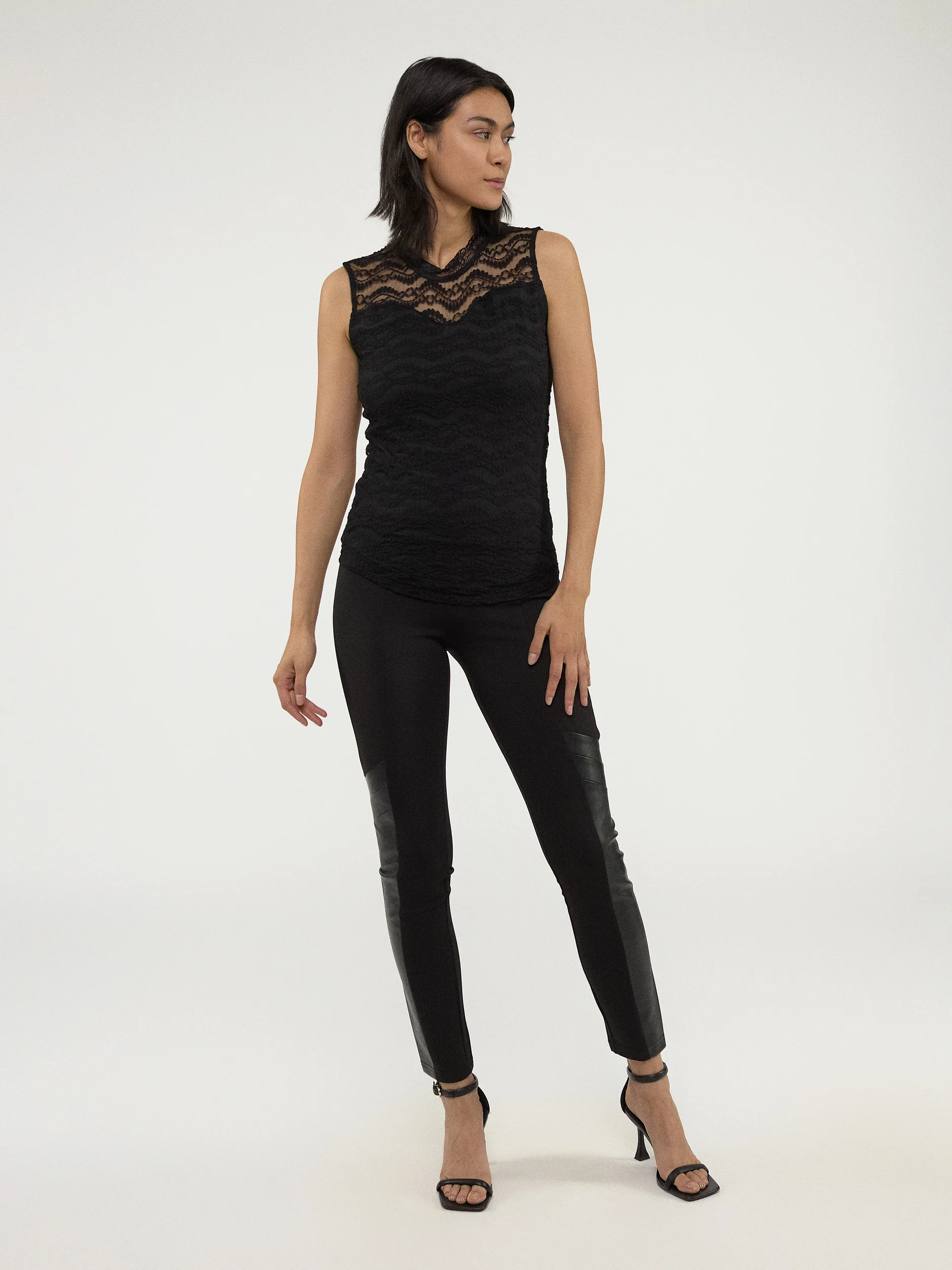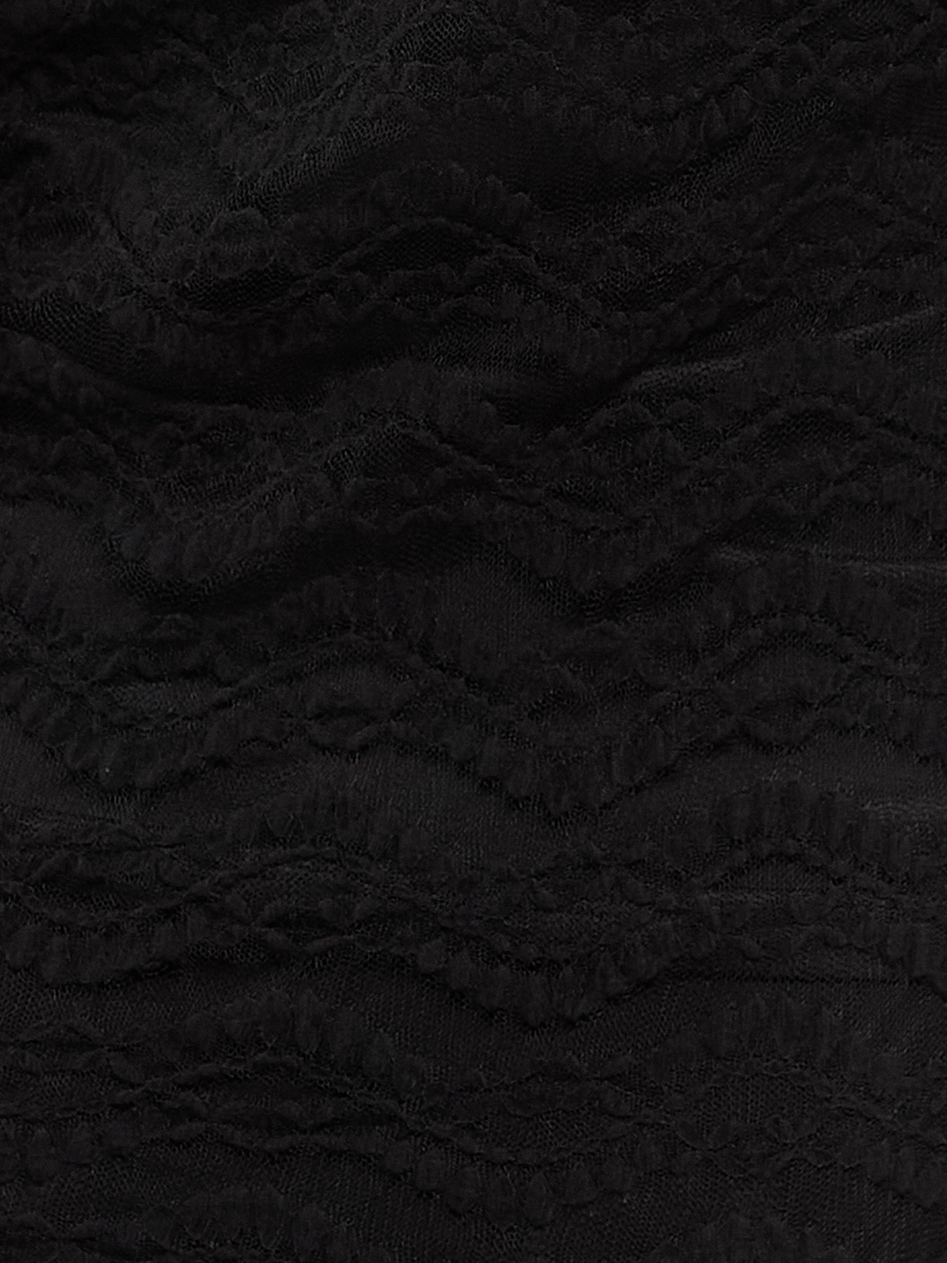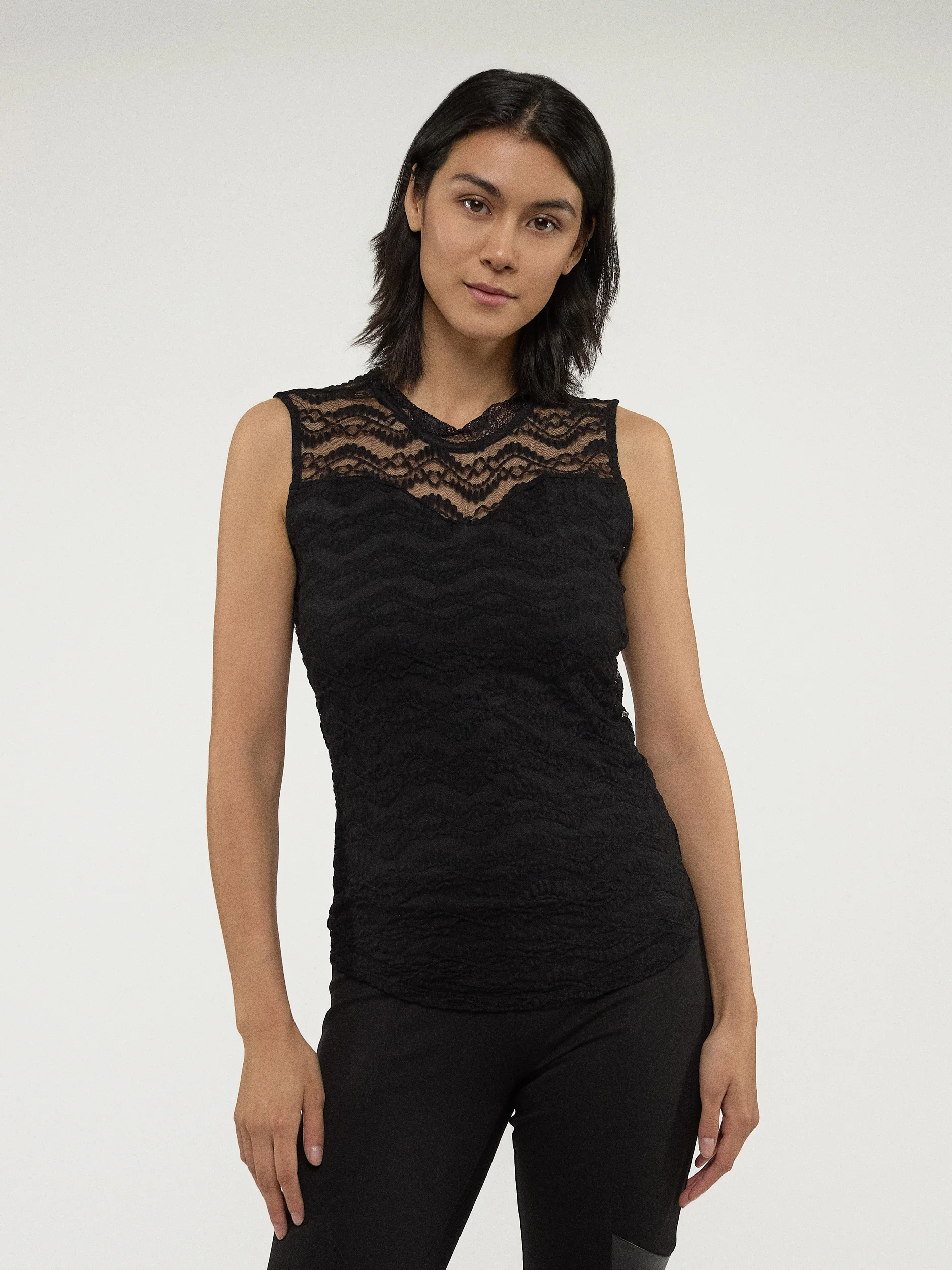 Ce haut en dentelle noire révèle subtilement la peau avec son empiècement transparent à l’encolure et ses motifs en vagues élégantes. La découpe goutte dans le dos ajoute une touche de raffinement à cette pièce intemporelle.