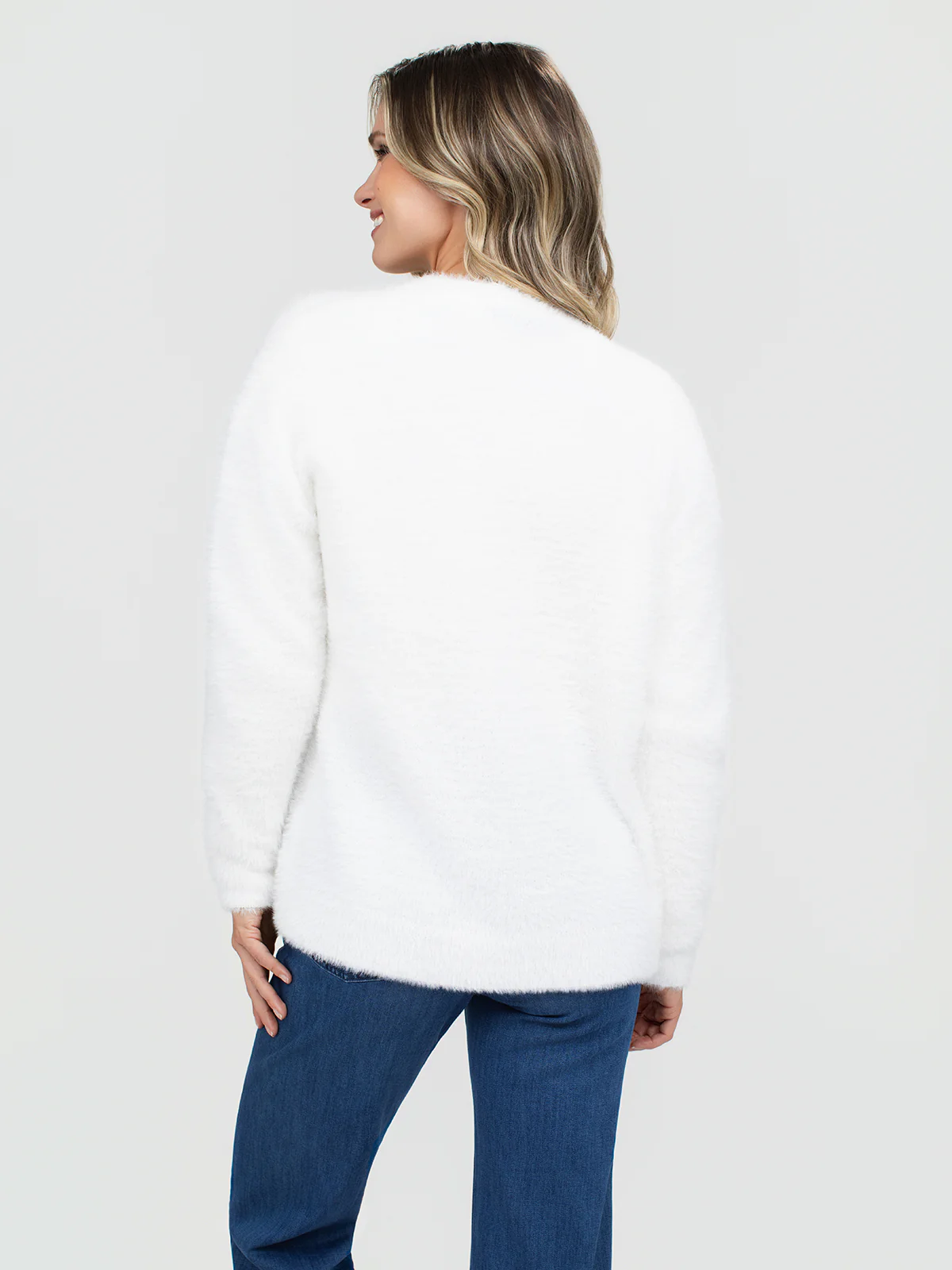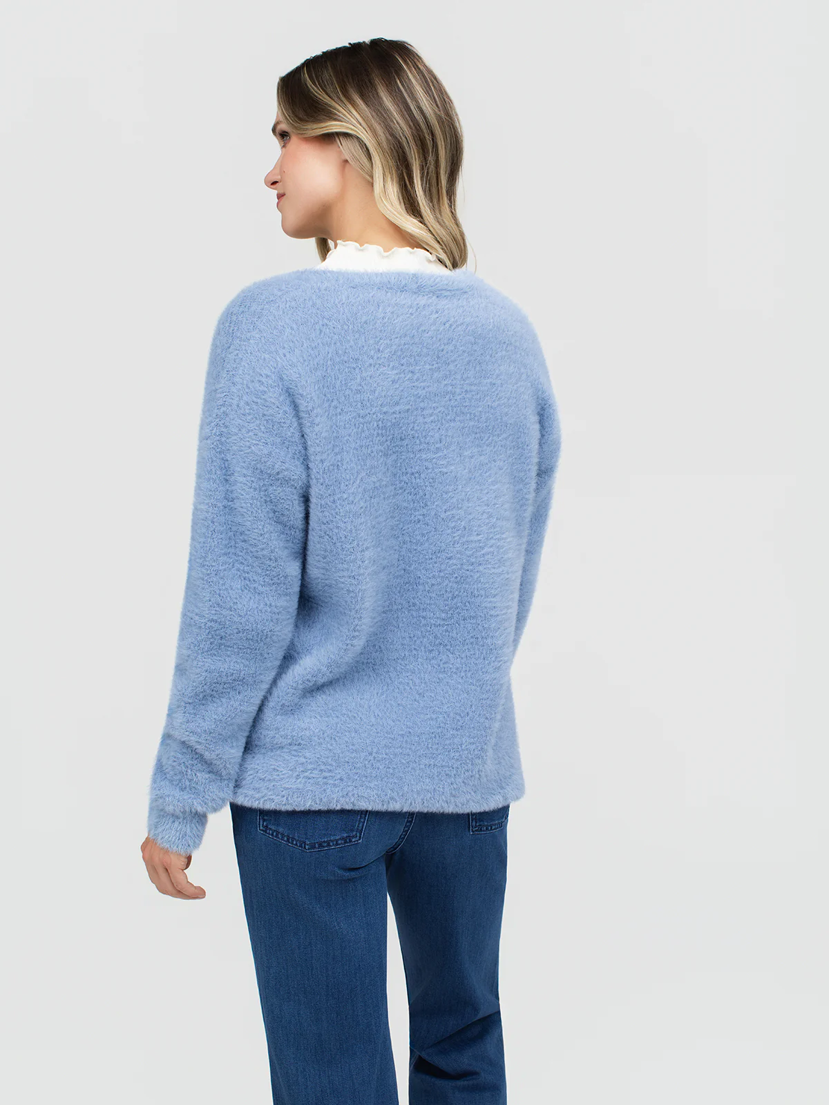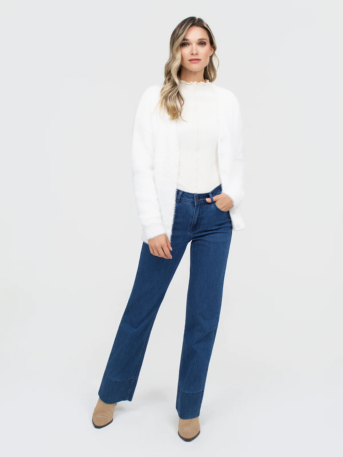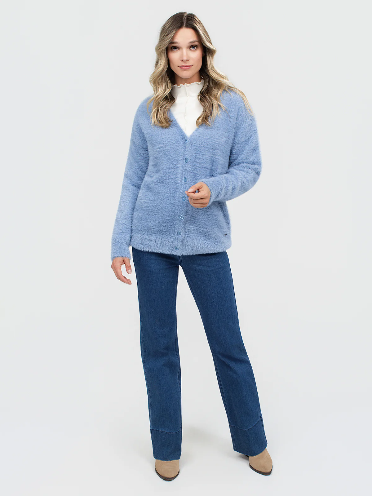 Cardigan à manches longues et encolure en V. Le modèle présente une fermeture à boutons sur le devant et une coupe droite au bas du vêtement.