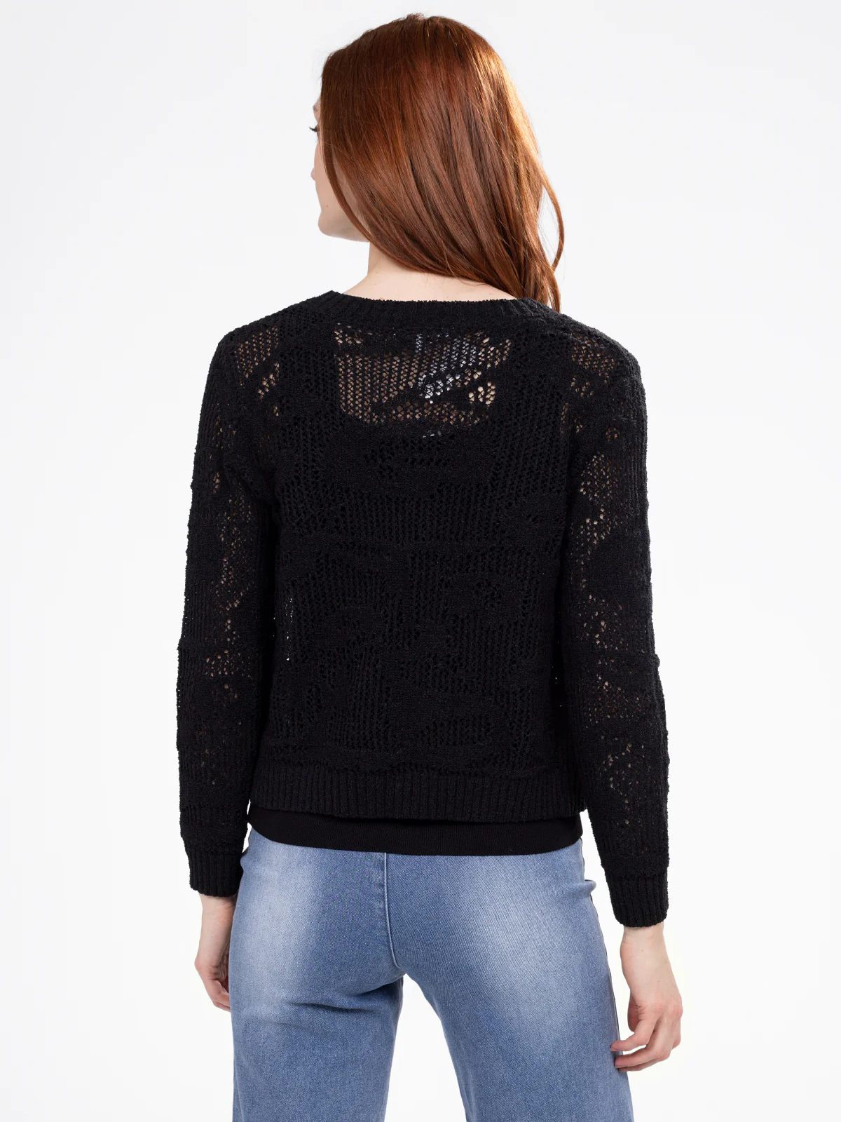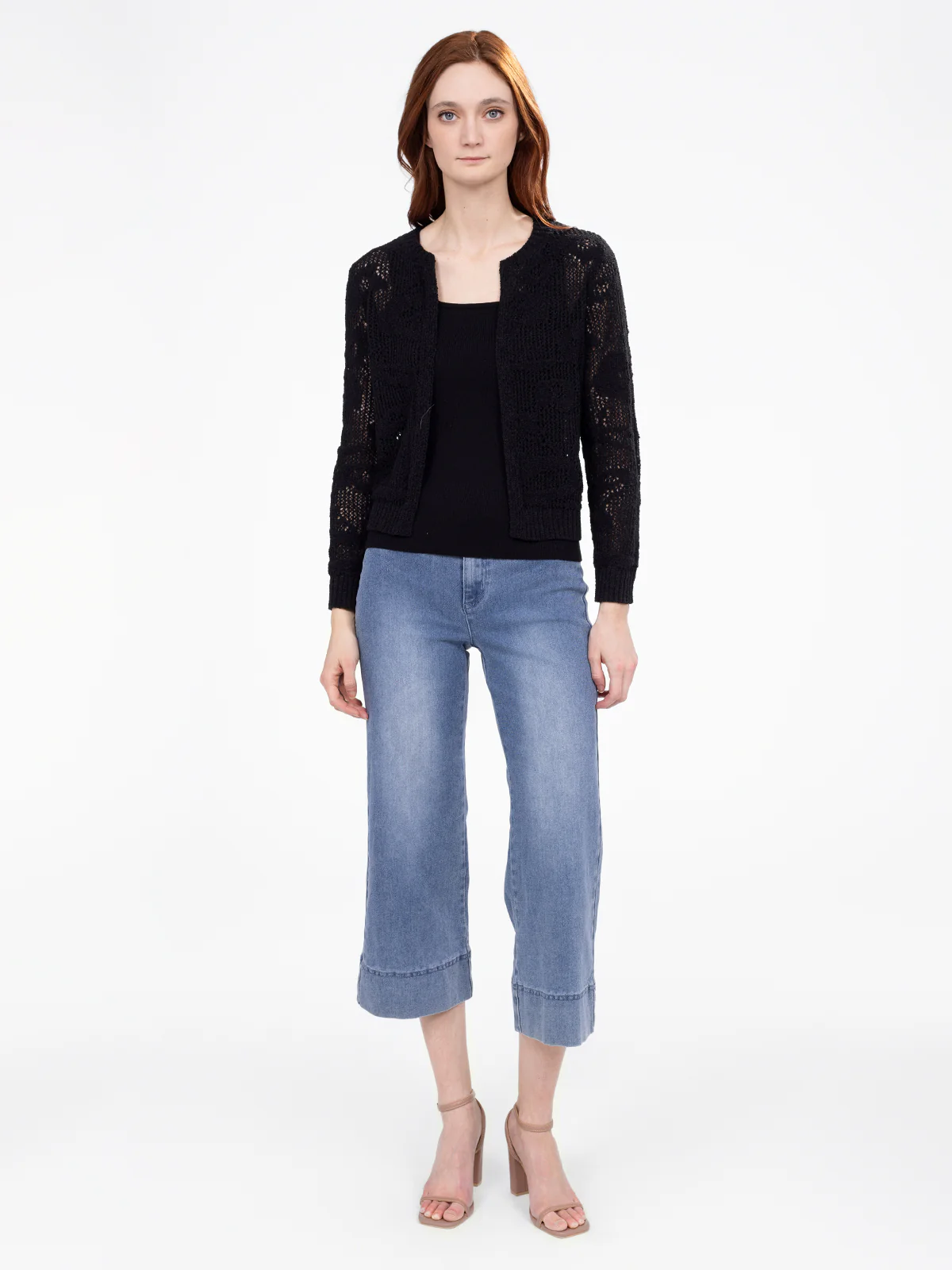 Travaillé dans une maille légère et aérée, ce cardigan séduit par ses motifs en relief et sa coupe courte. Ses finitions côtelées aux poignets et à la base apportent du contraste et de la tenue.