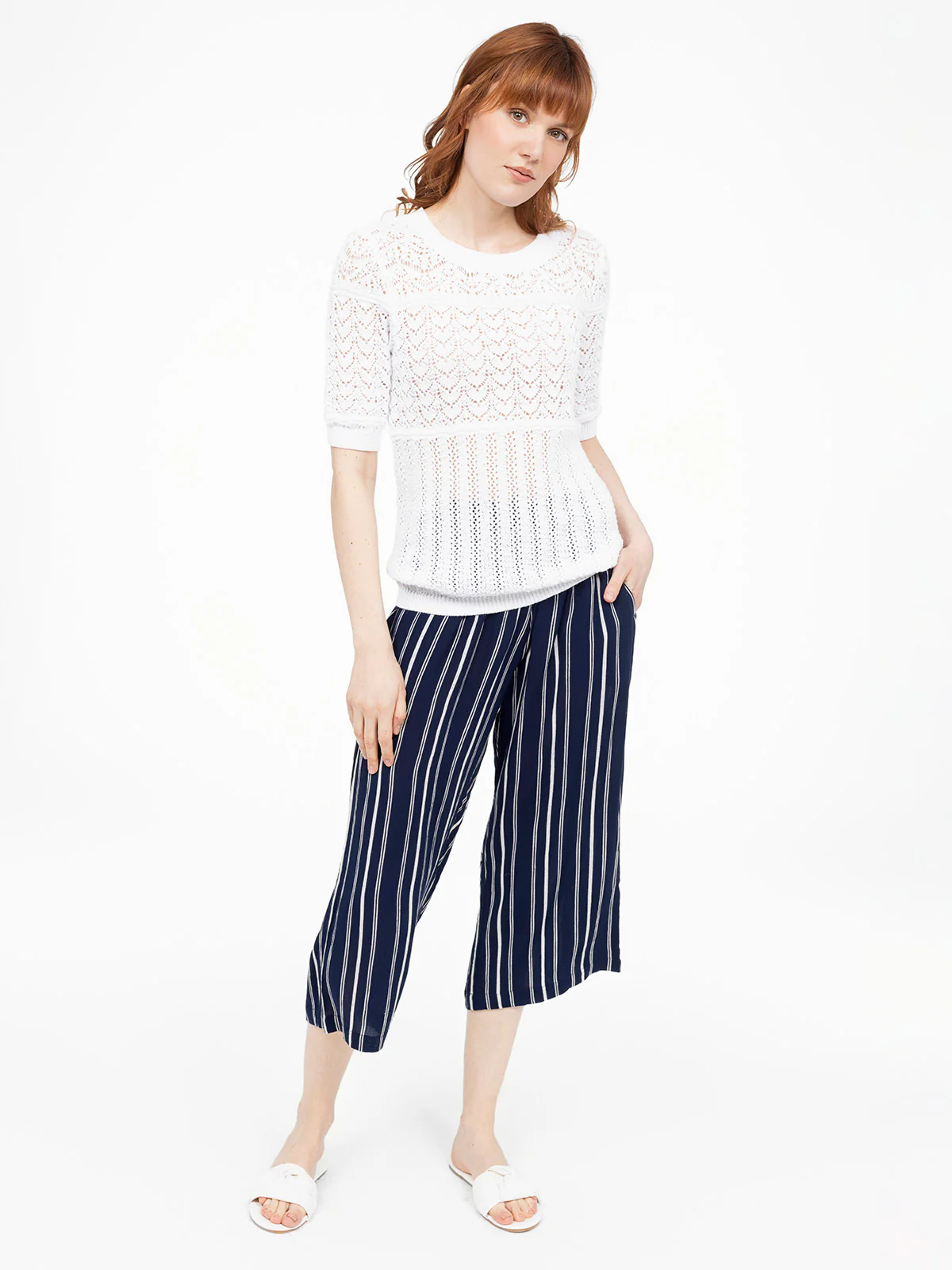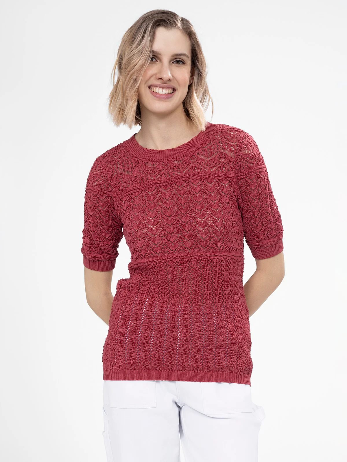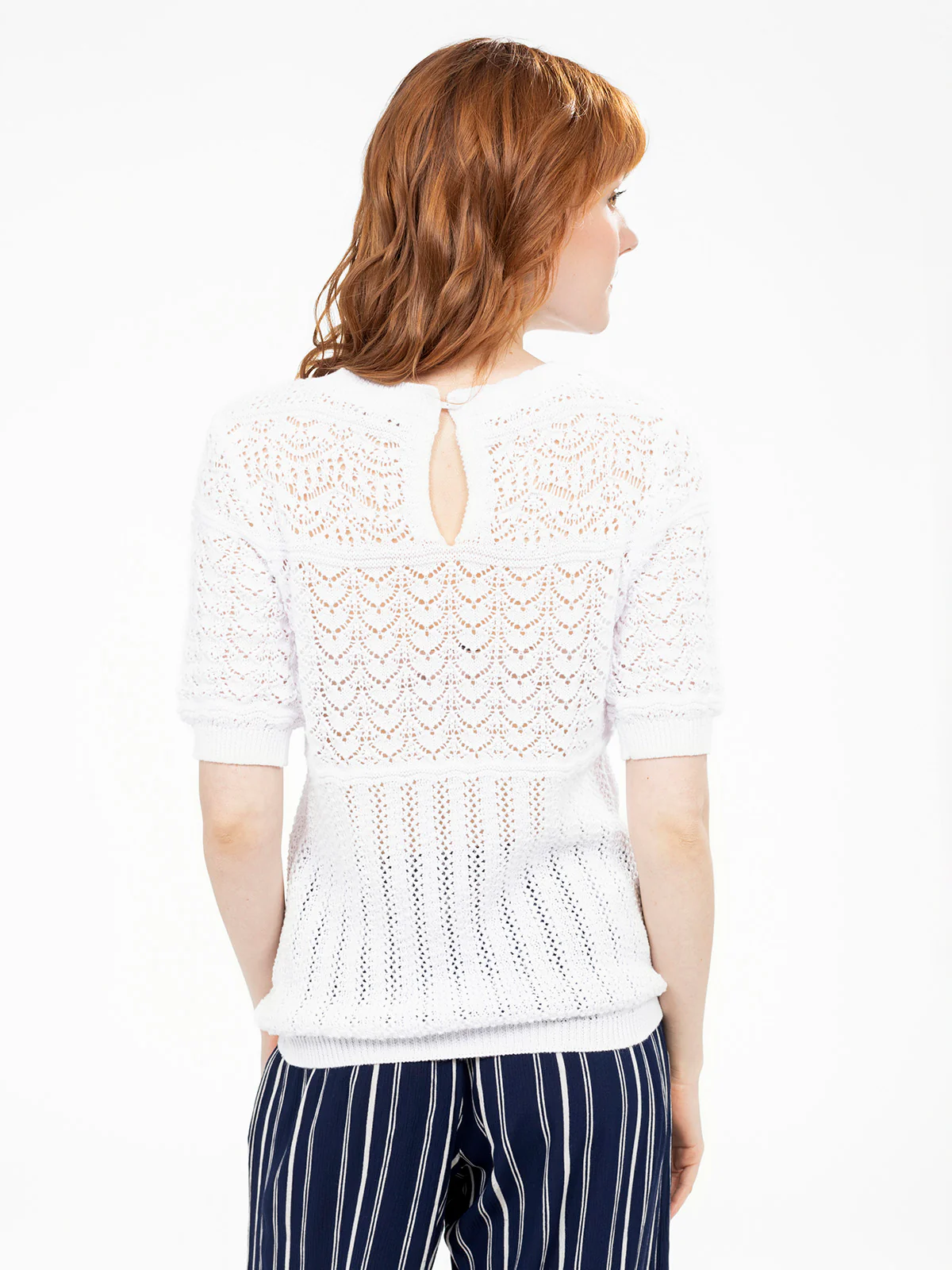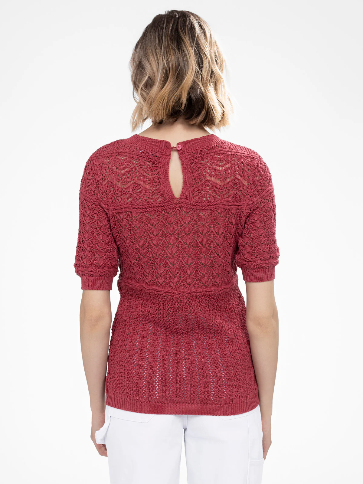 Avec son jeu de points ajourés et ses manches courtes ajustées, ce pull apporte une légèreté agréable. Le détail goutte au dos accentue son charme travaillé.