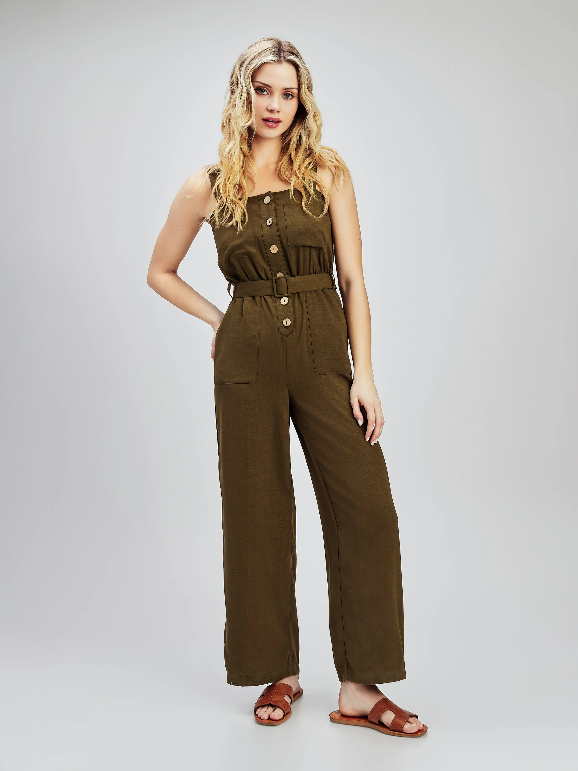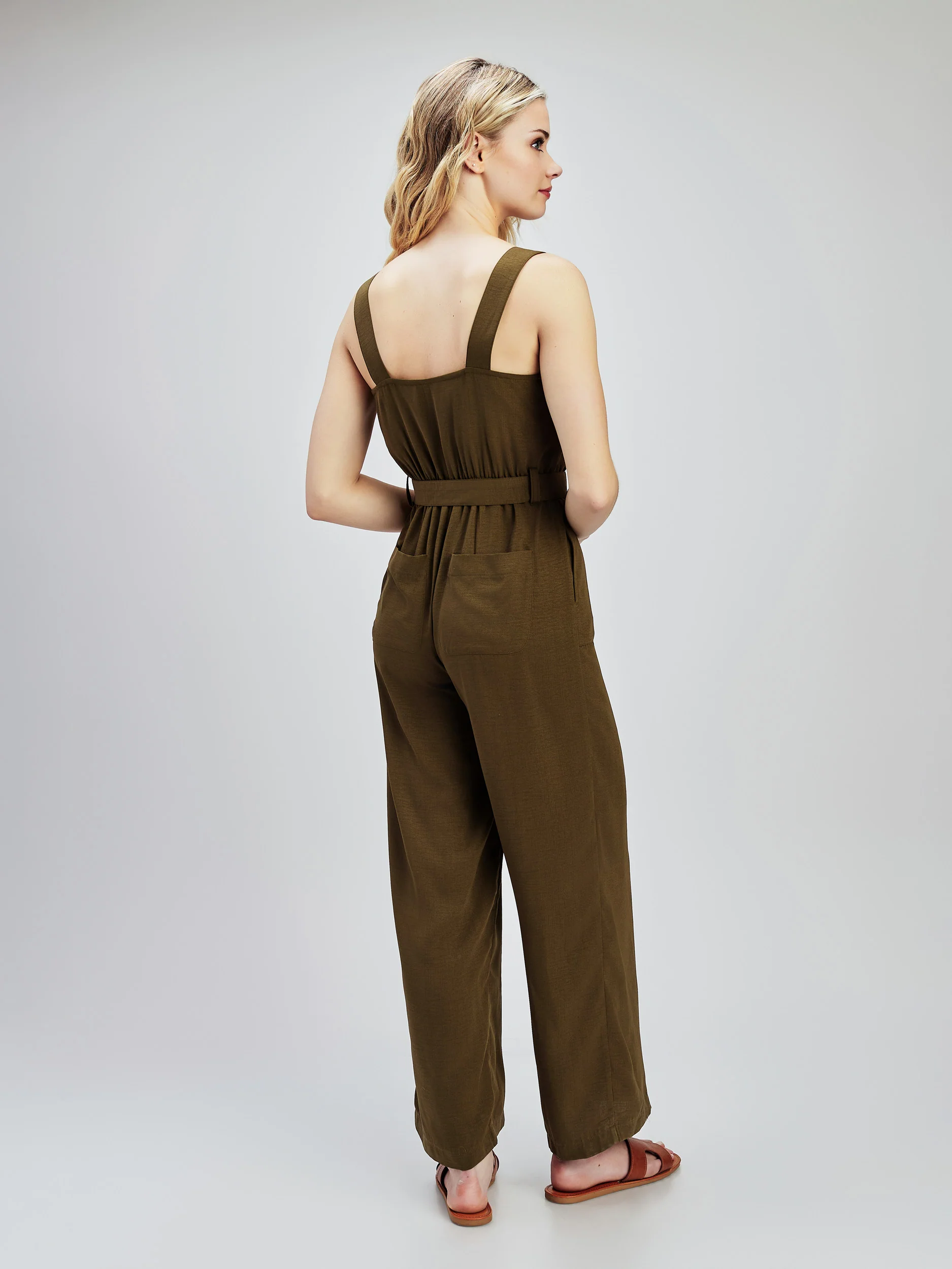 Dotée de quatre poches avant et de deux à l’arrière, cette combinaison avec ceinture et dos dégagé est super tendance et très élégante.