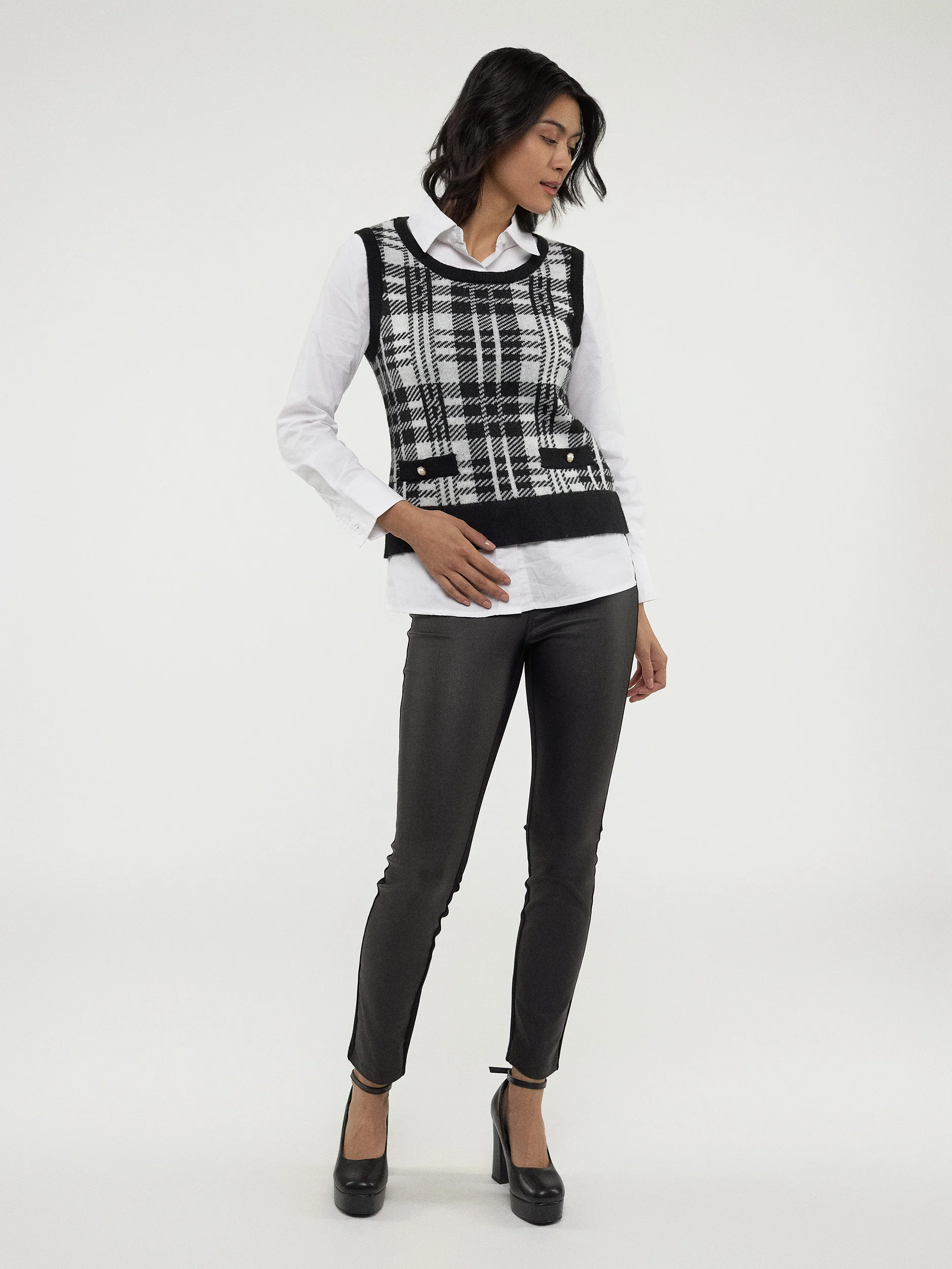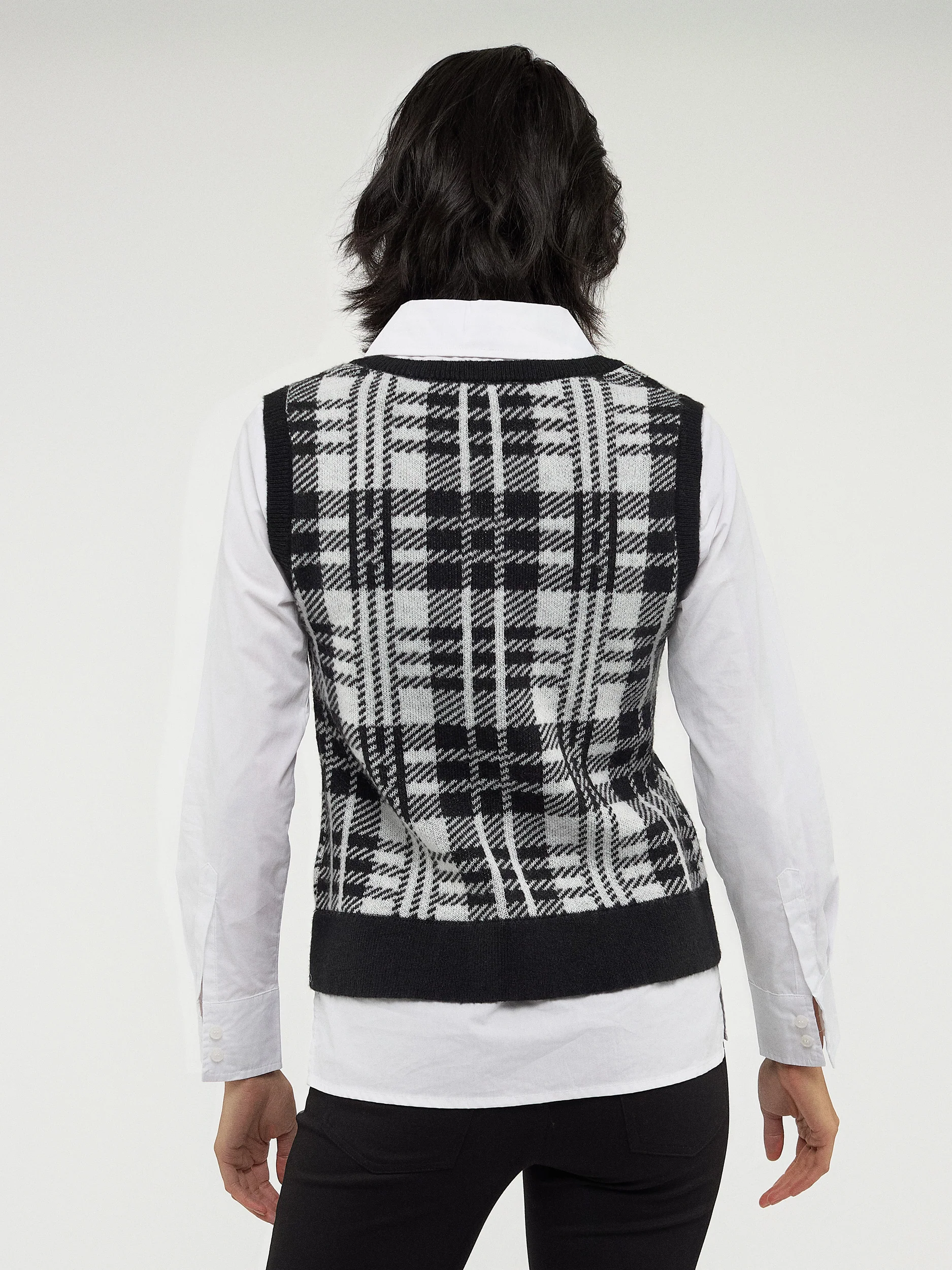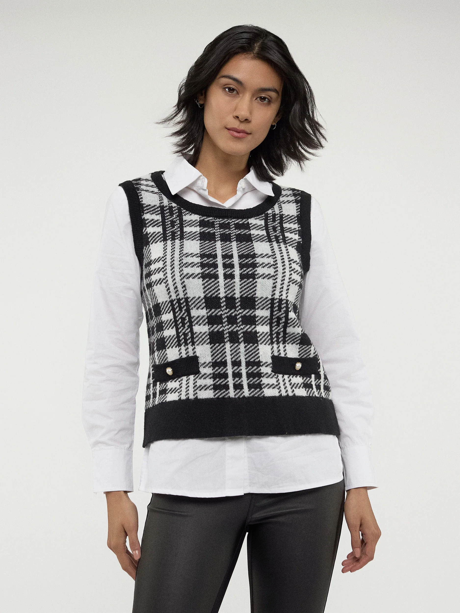 Cet élégant débardeur à carreaux est sur le point de devenir votre nouvelle pièce maîtresse de votre garde-robe. Les accents géométriques lui confèrent une touche graphique, tandis que sa coupe ample flatte toutes les silhouettes. C’est la pièce de superposition parfaite.