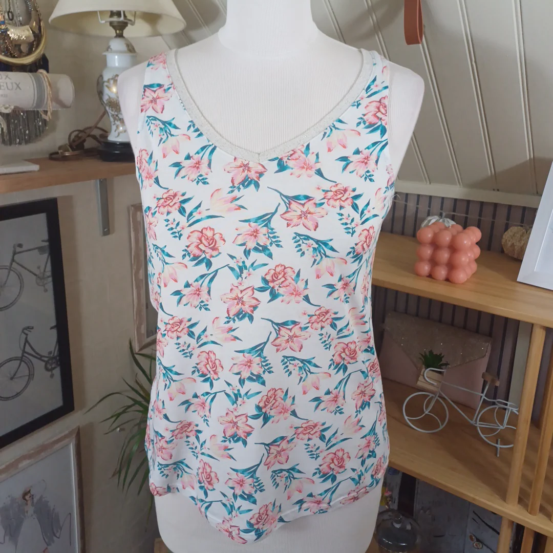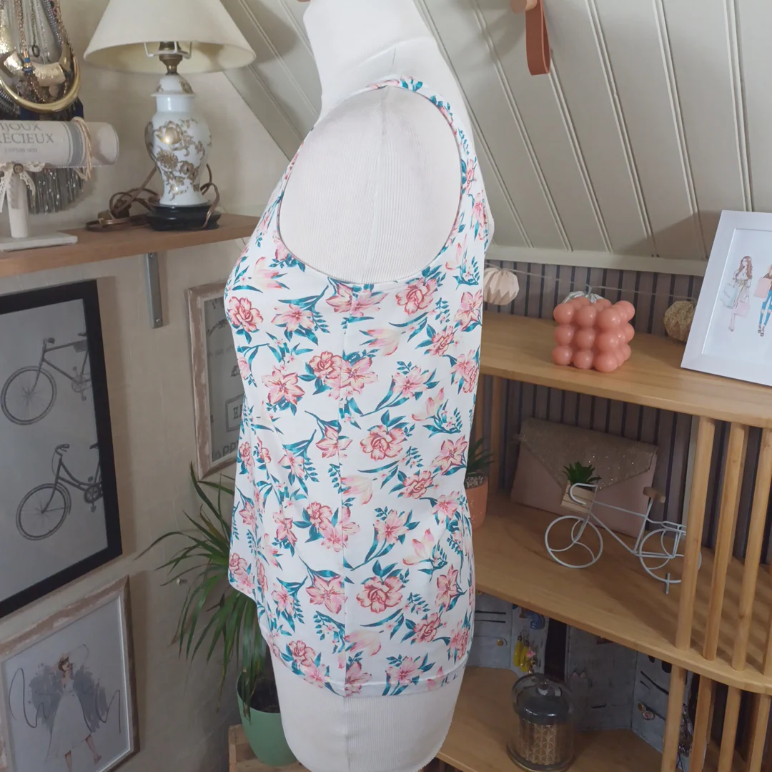 Débardeur blanc à motifs fleurs, Promod, taille non indiquée conviendra pour une taille 38 Mesures: Tour de poitrine 88 cm Longueur ( bretelle jusqu’au bas du débardeur) 60 cm