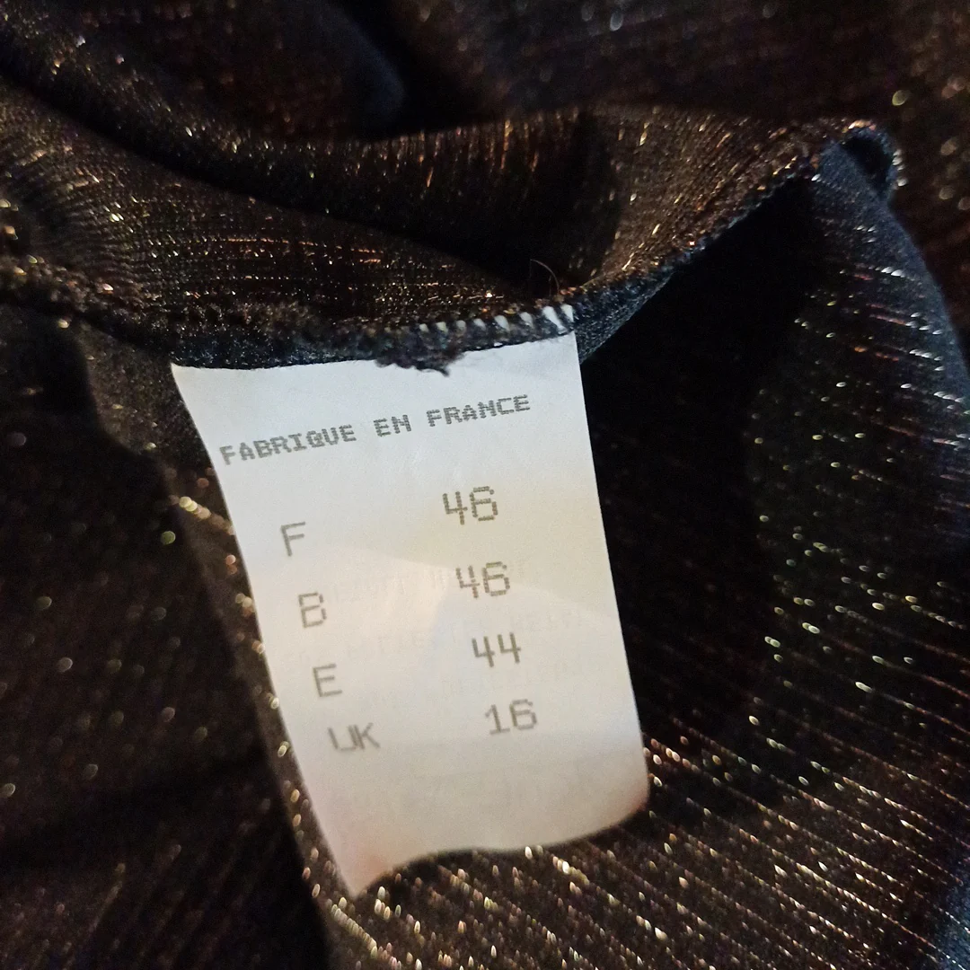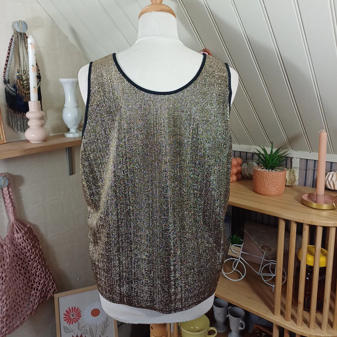 Débardeur doré, marque non indiquée, taille indiquée 46. Mesures: Tour de poitrine 108 cm Longueur 62 cm