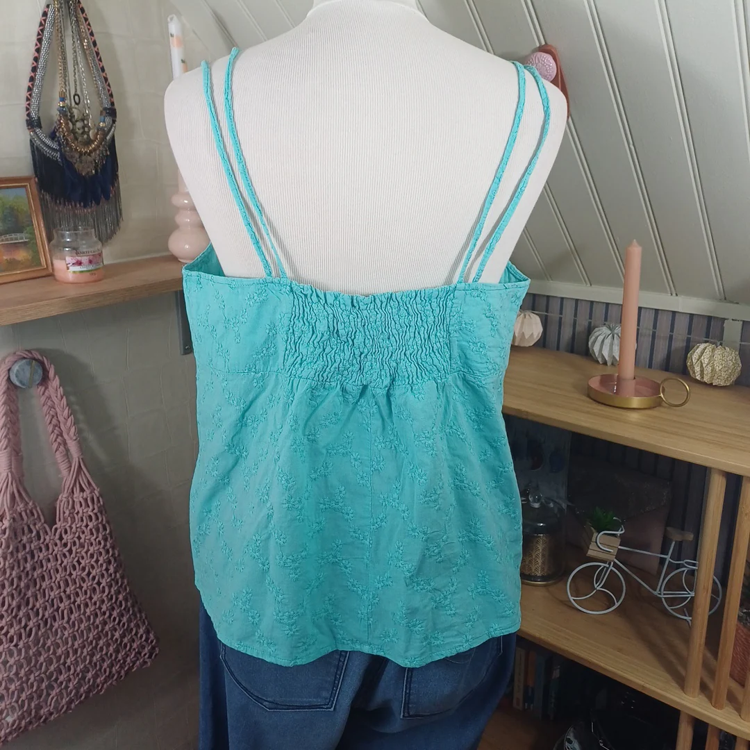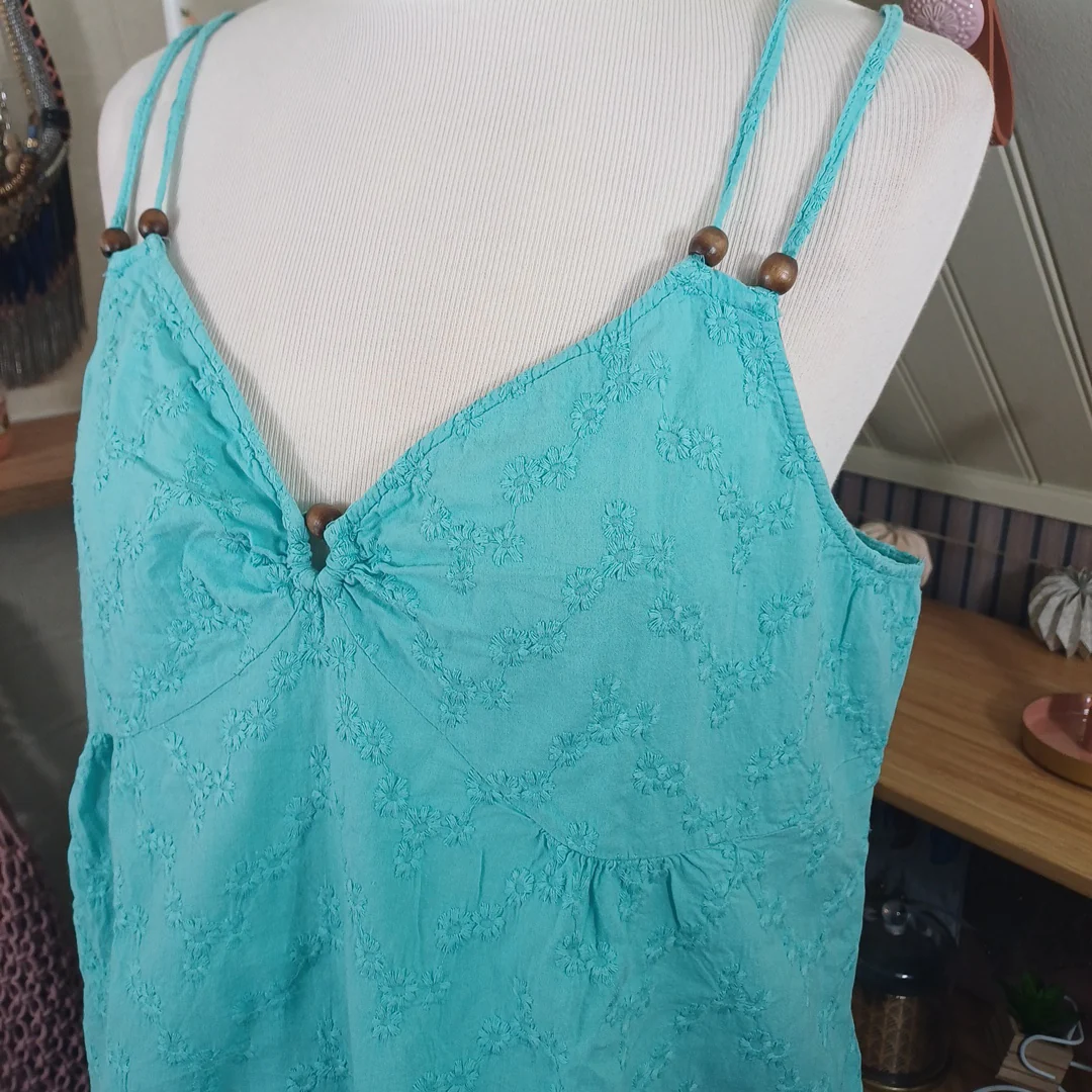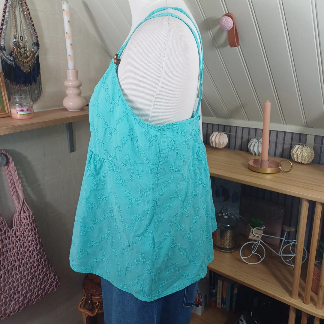 Débardeur turquoise à motifs fleurs brodés, Tissaia, taille indiquée 44. Tissu élastique au niveau du dos. Mesures: Tour de poitrine 100 cm Longueur avec bretelle 57 cm