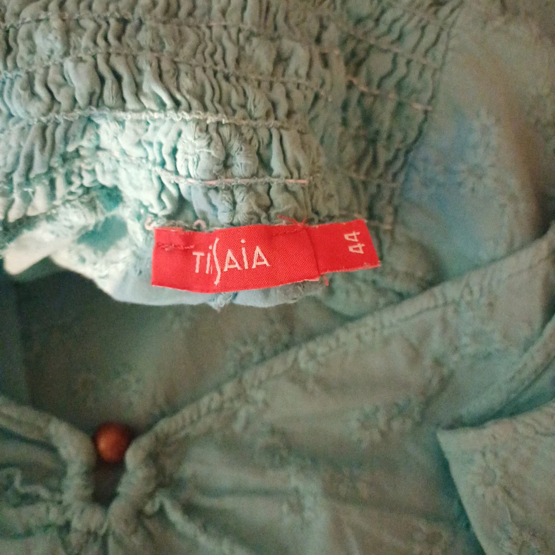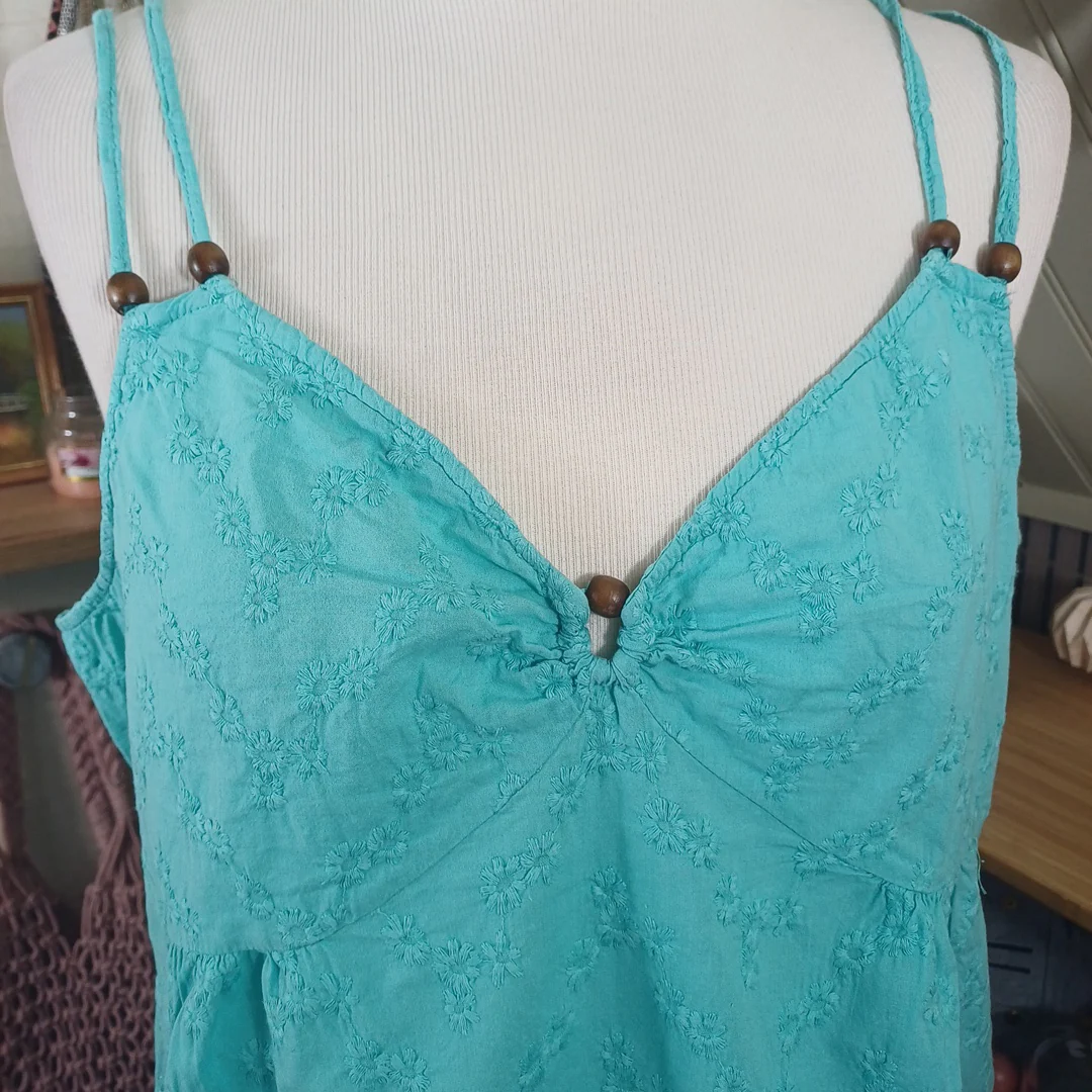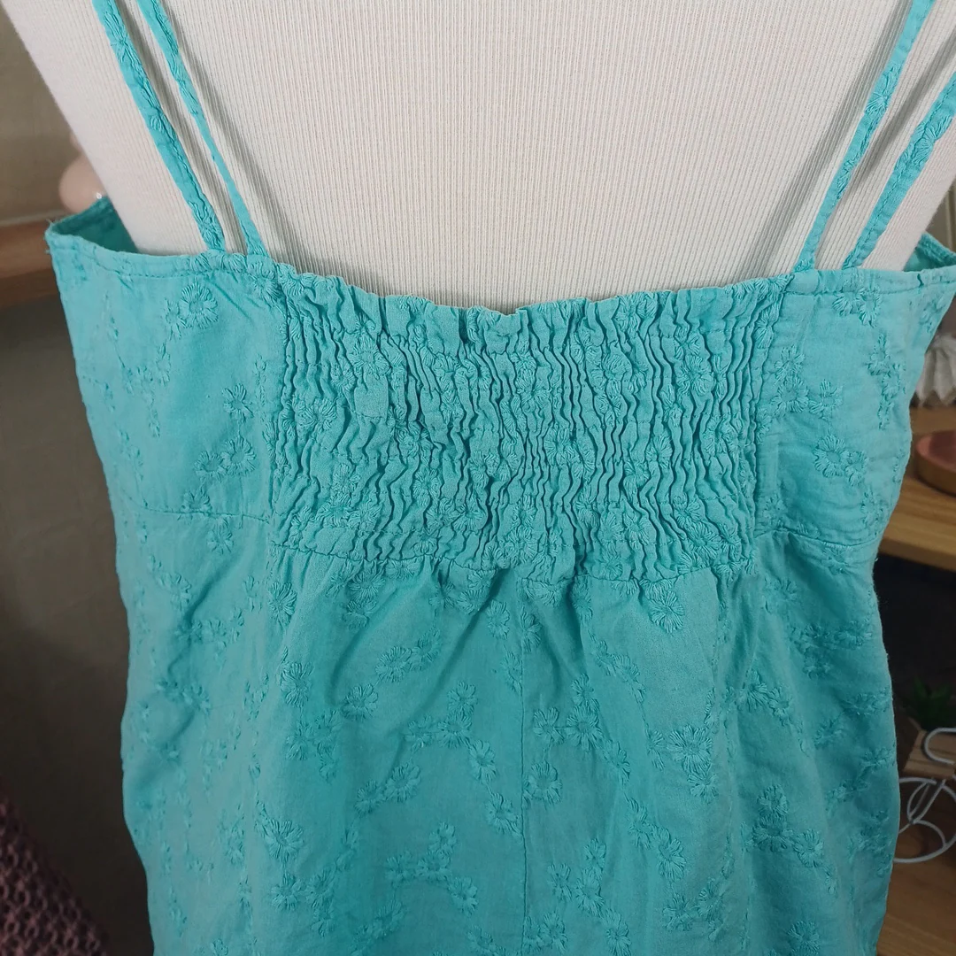 Débardeur turquoise à motifs fleurs brodés, Tissaia, taille indiquée 44. Tissu élastique au niveau du dos. Mesures: Tour de poitrine 100 cm Longueur avec bretelle 57 cm