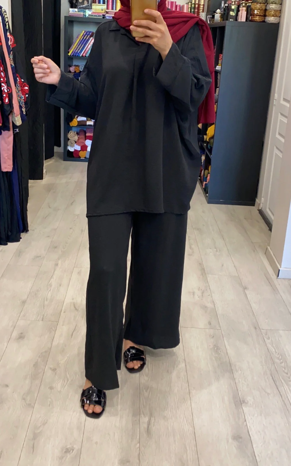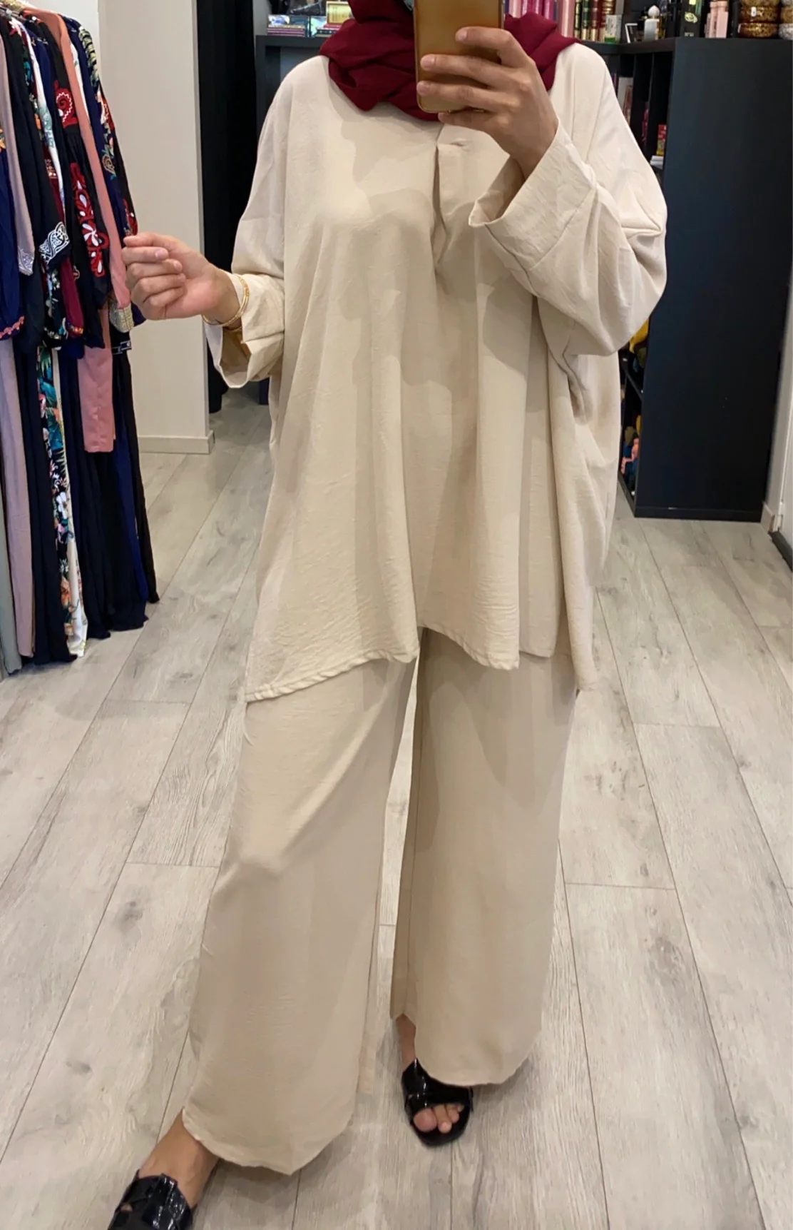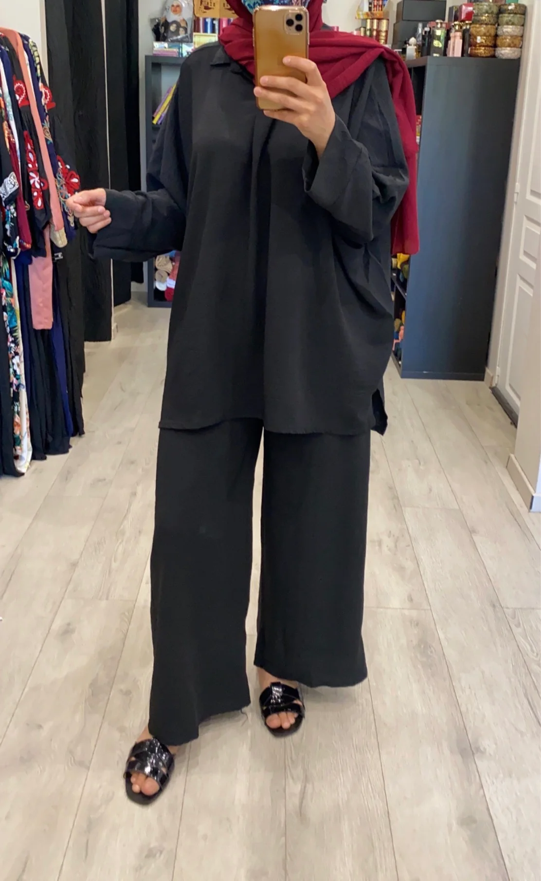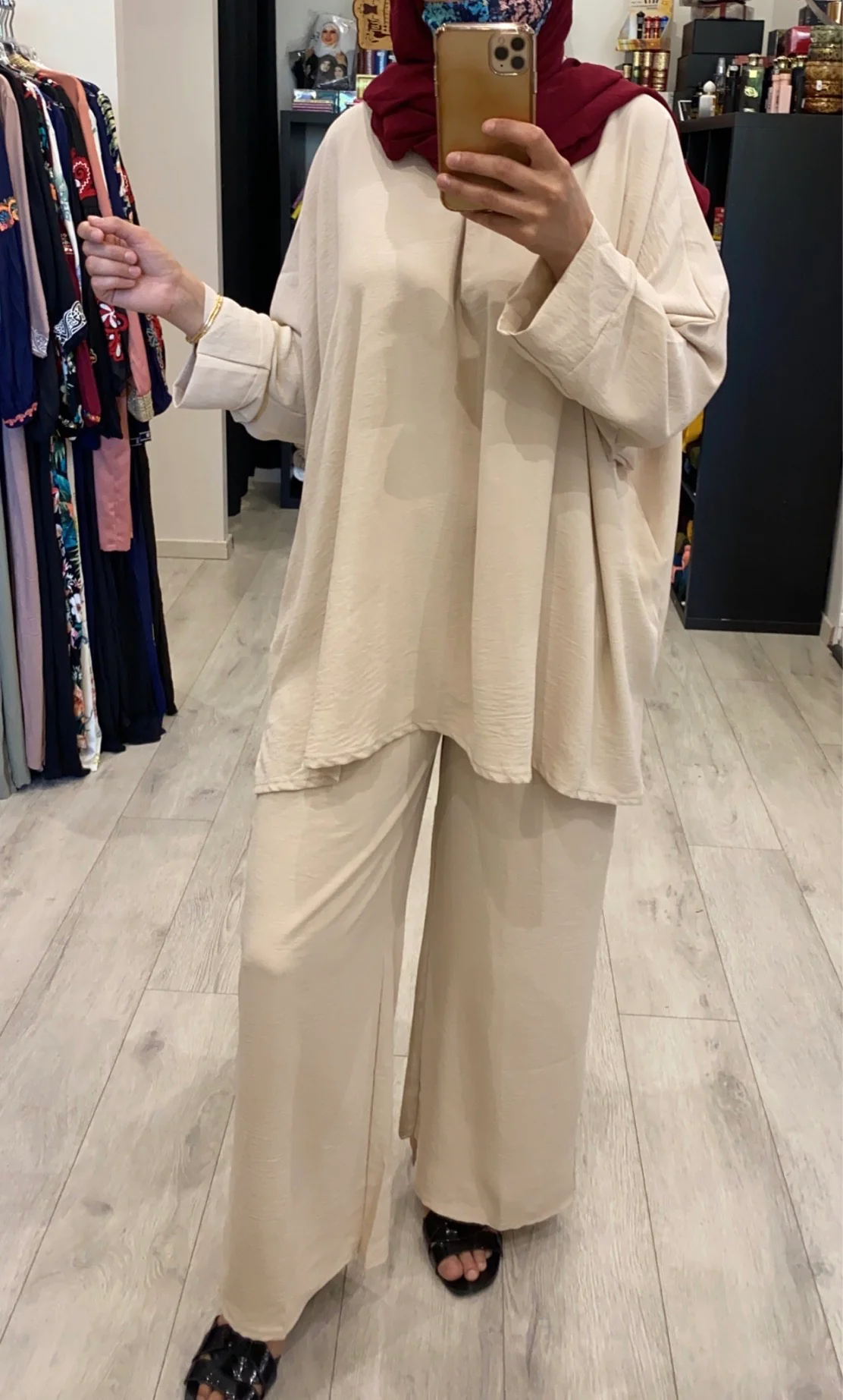 Ensemble 2 pièces : palazzo + haut oversize. Le palazzo est elastiqué à la taille. Taille unique convient à un SM voir petit L 95% polyester et 5% elastane