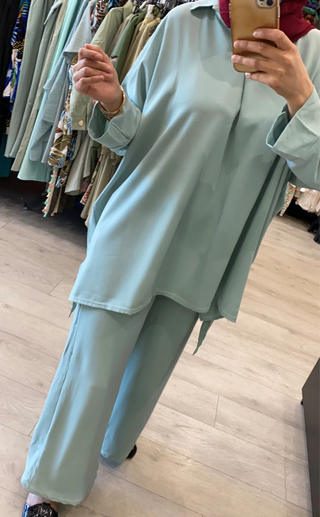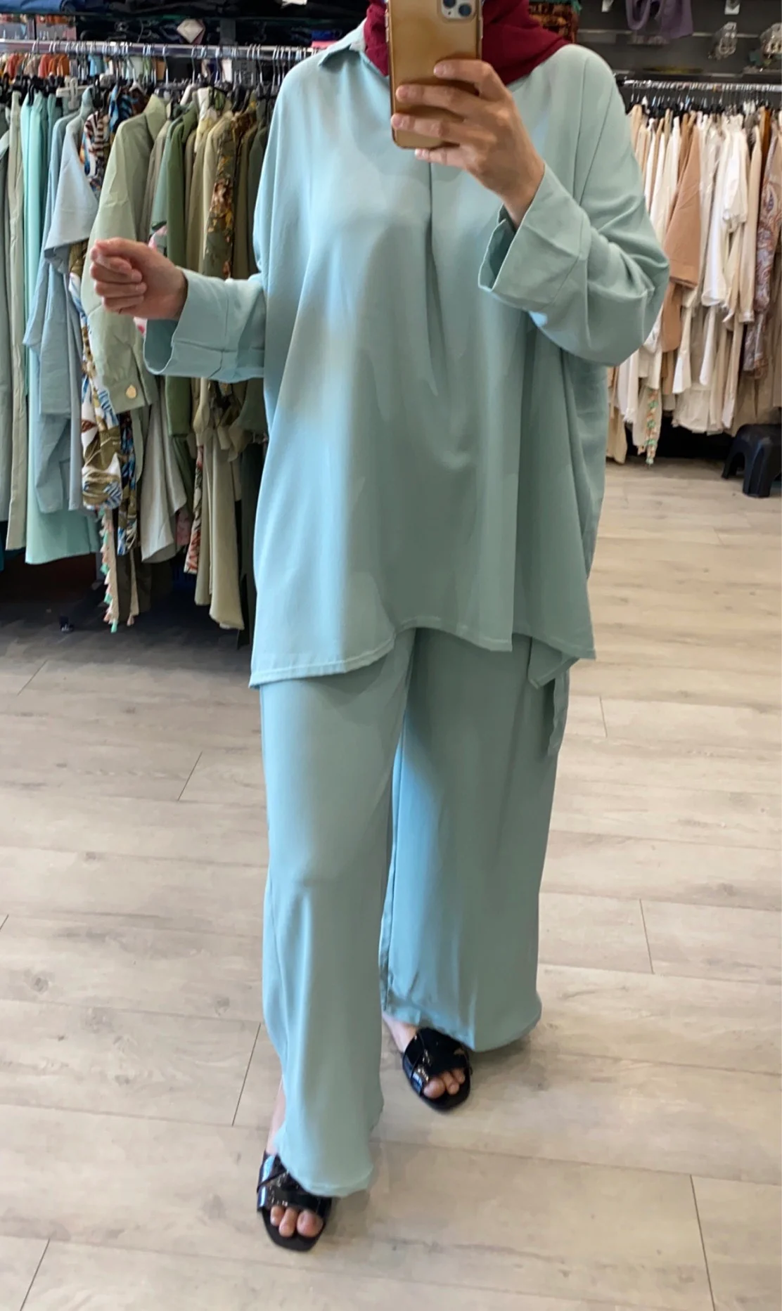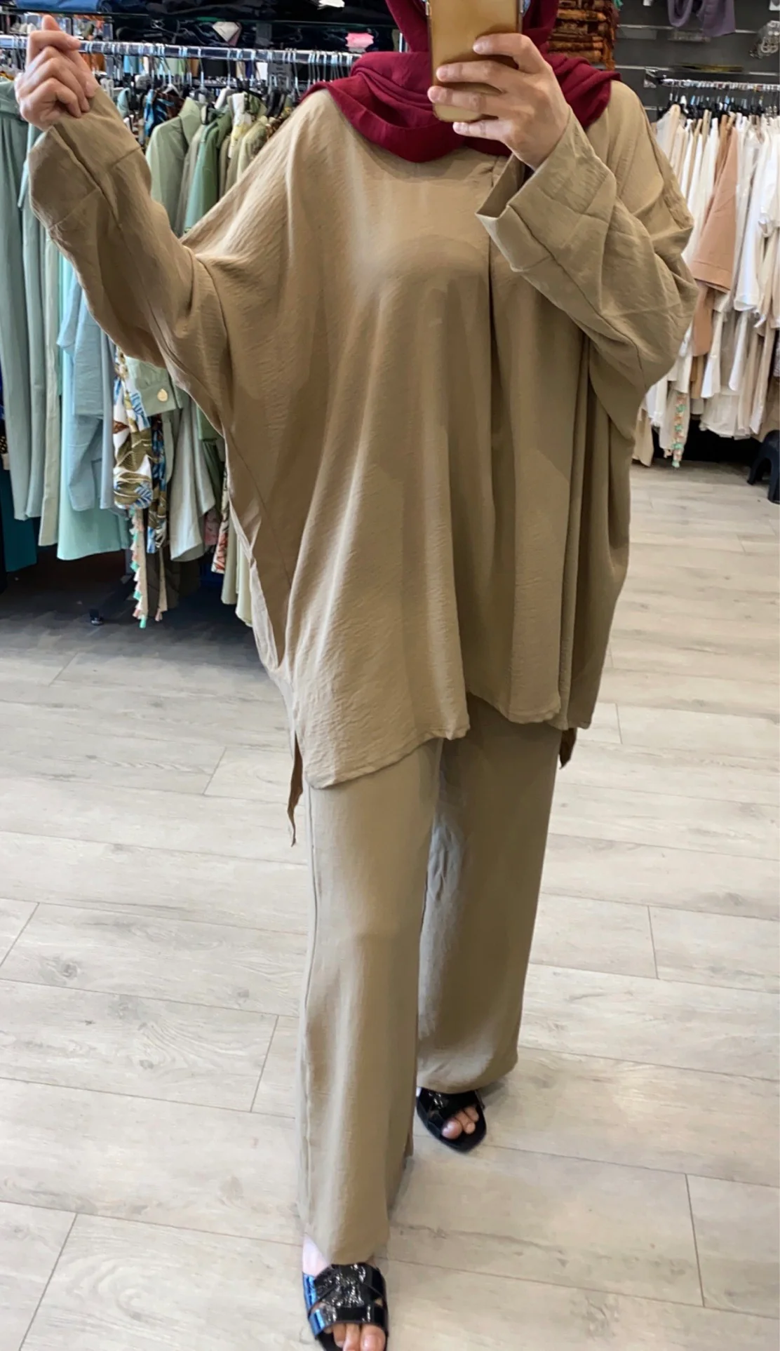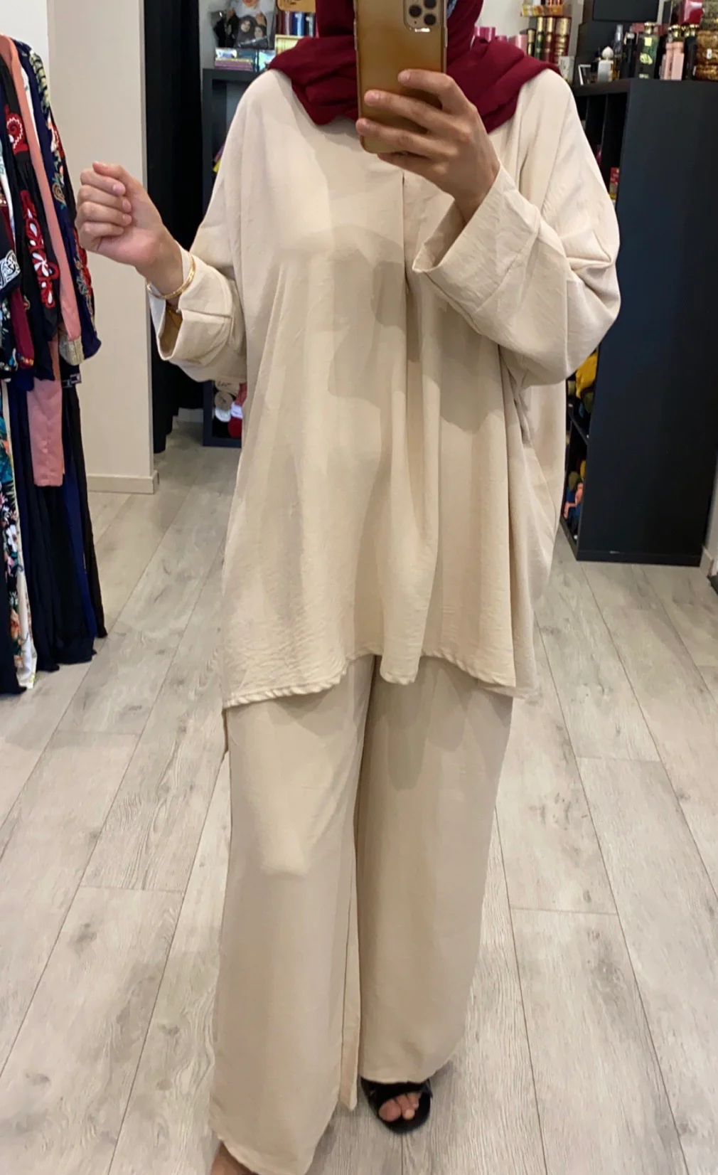 Ensemble 2 pièces : palazzo + haut oversize. Le palazzo est elastiqué à la taille. Taille unique convient à un SM voir petit L 95% polyester et 5% elastane