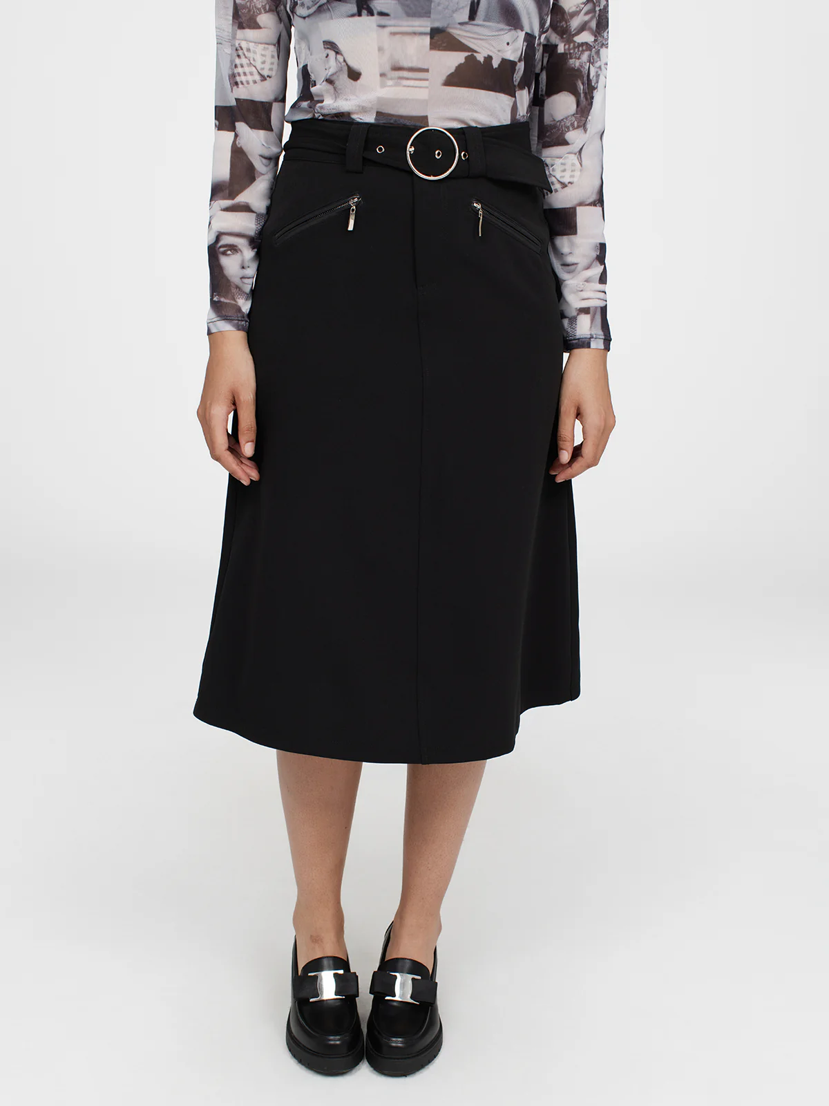 Jupe midi comportant deux poches zippées sur l’avant et une coupe légèrement évasée.