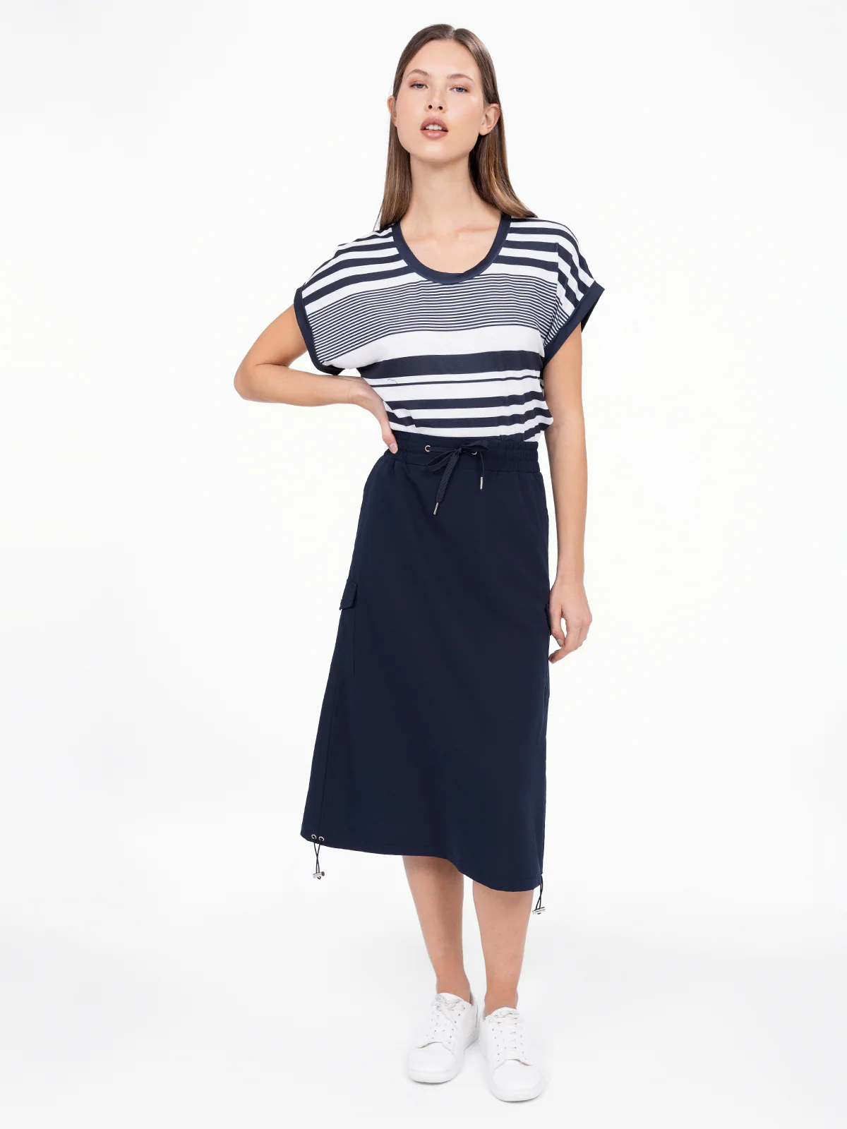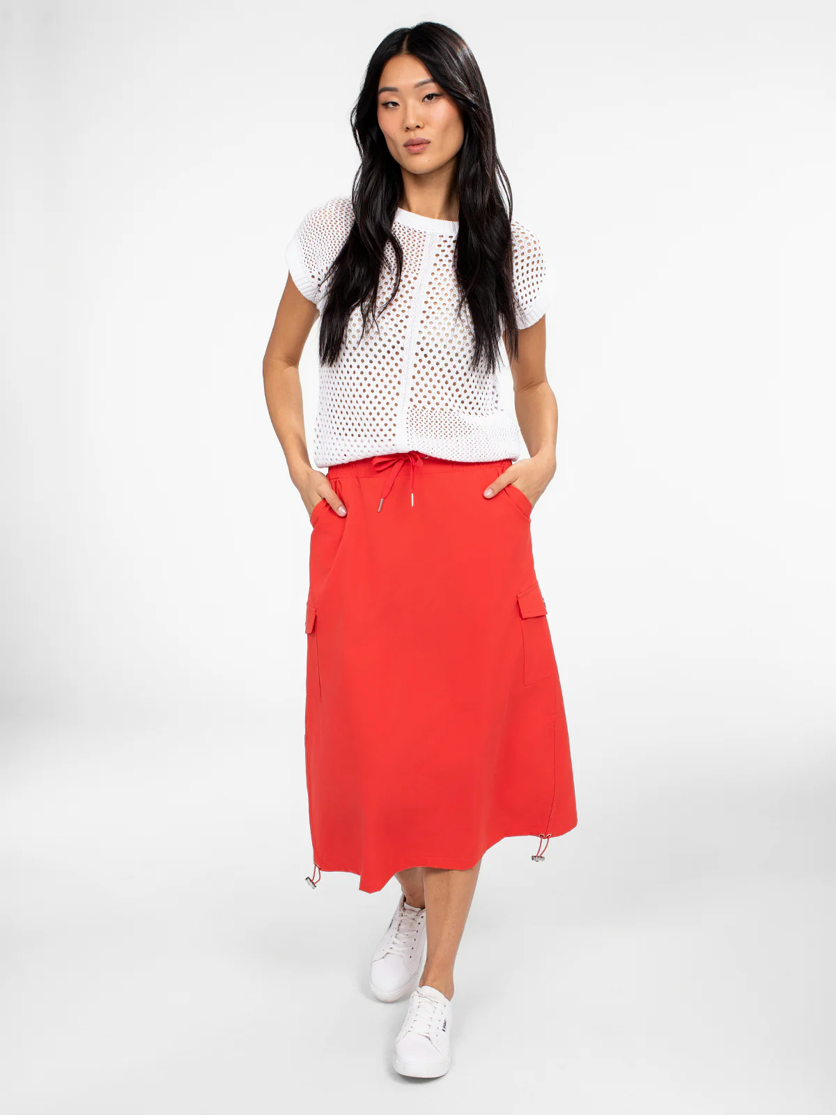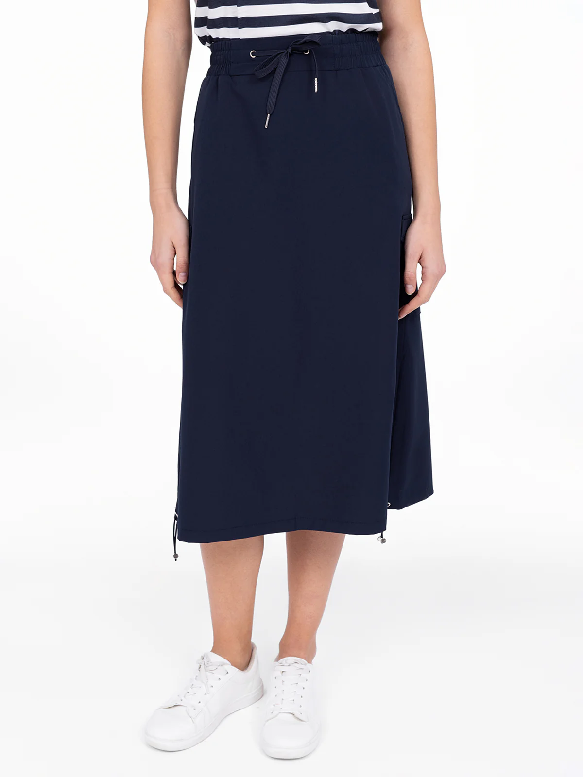 Cette jupe à taille élastiquée se démarque par ses poches pratiques et son cordon ajustable à l’ourlet, permettant de moduler la longueur selon vos envies.
