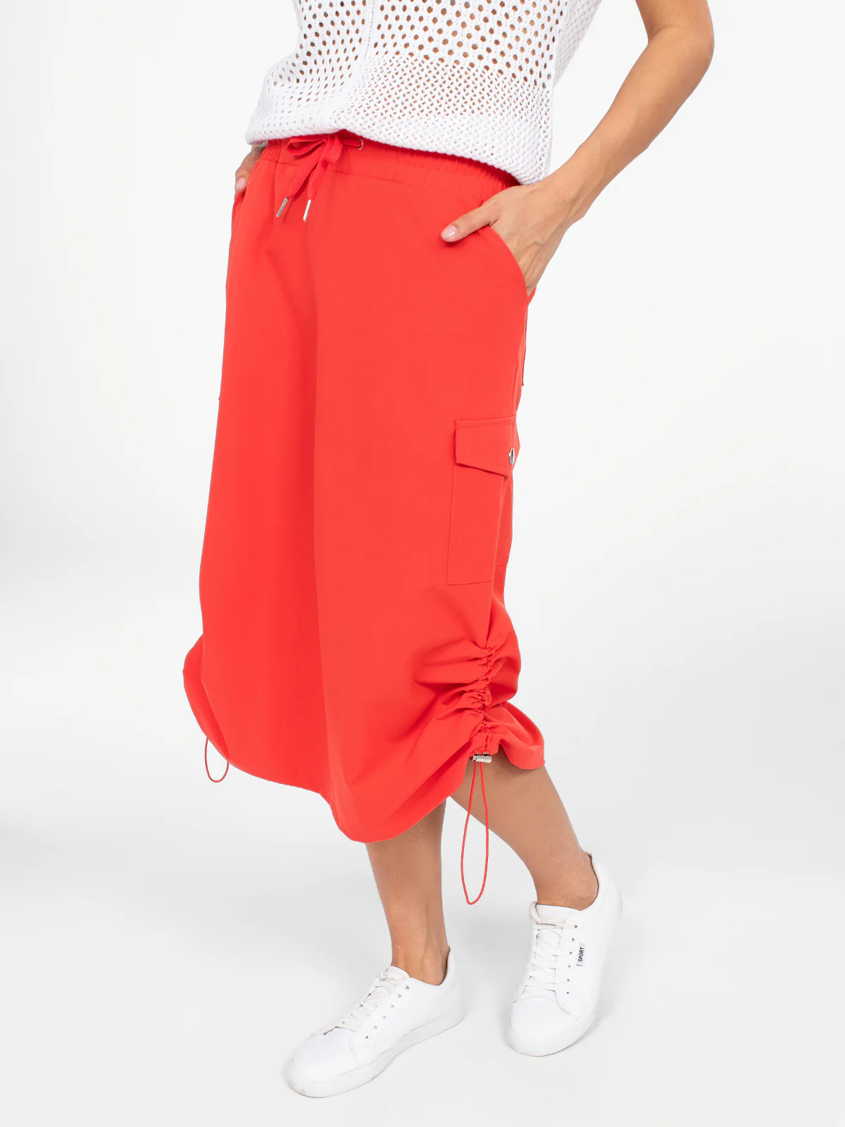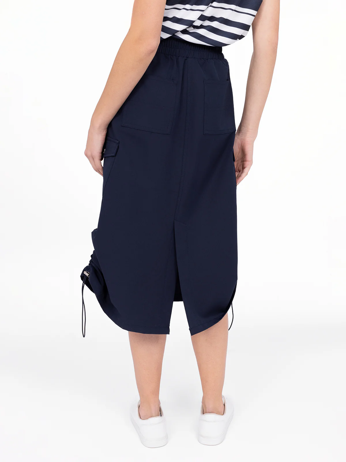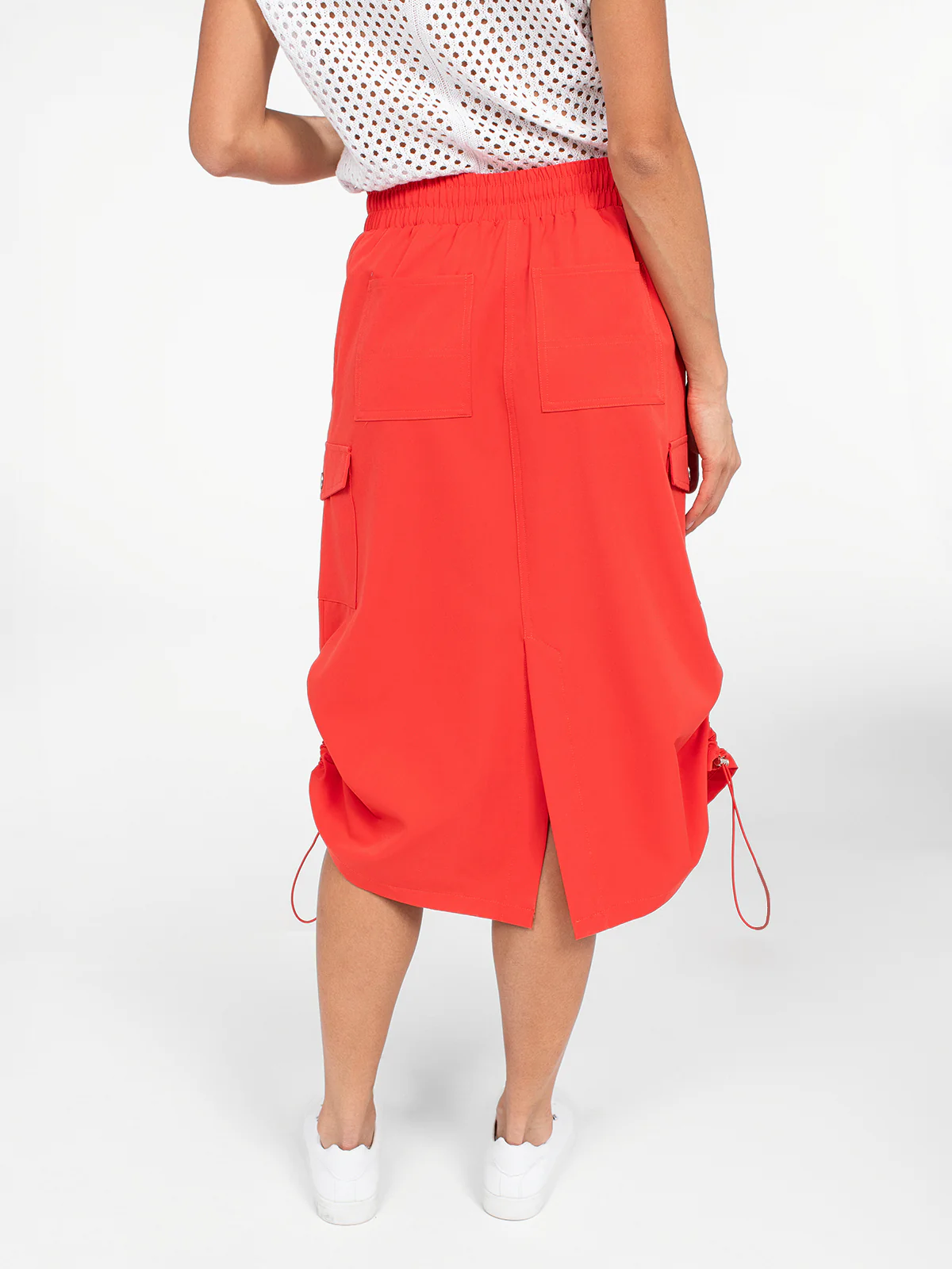 Cette jupe à taille élastiquée se démarque par ses poches pratiques et son cordon ajustable à l’ourlet, permettant de moduler la longueur selon vos envies.
