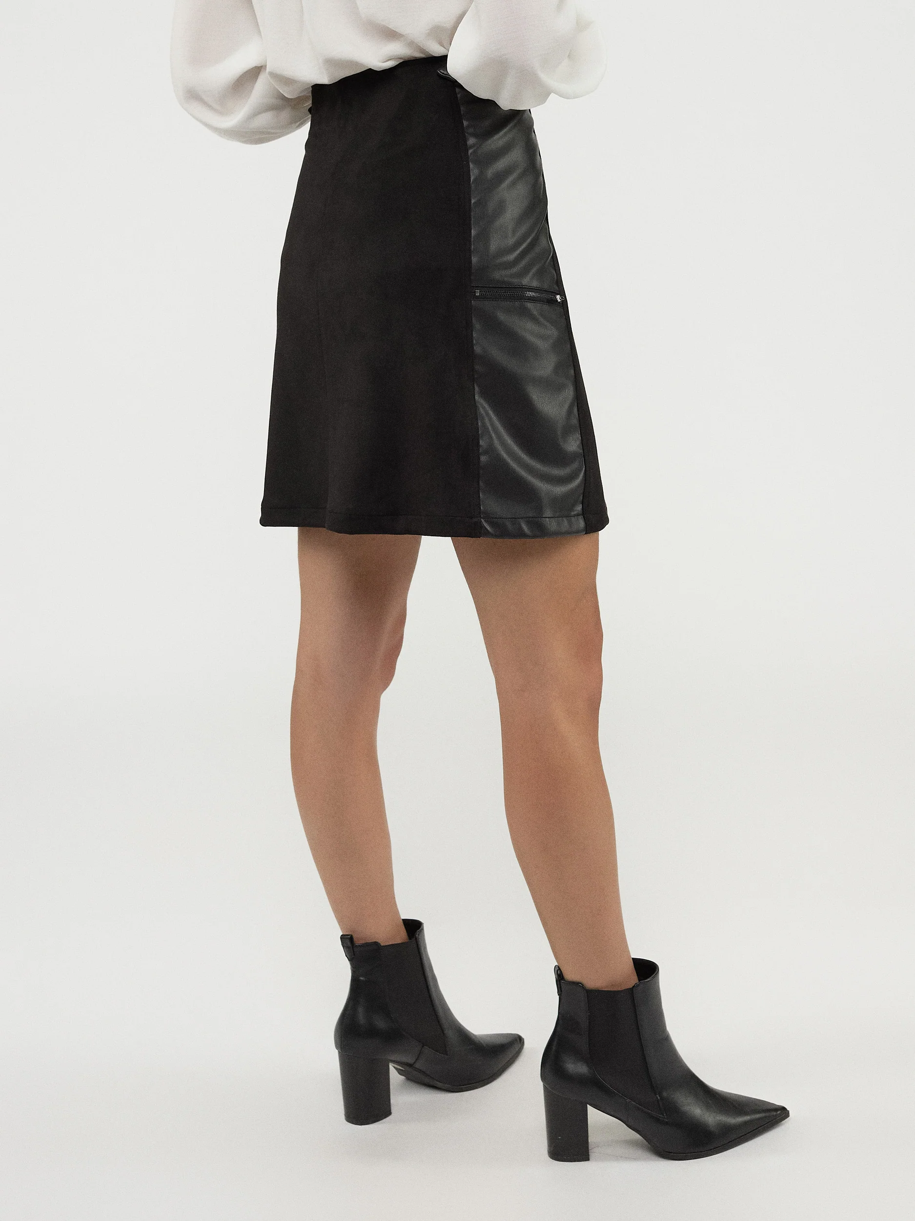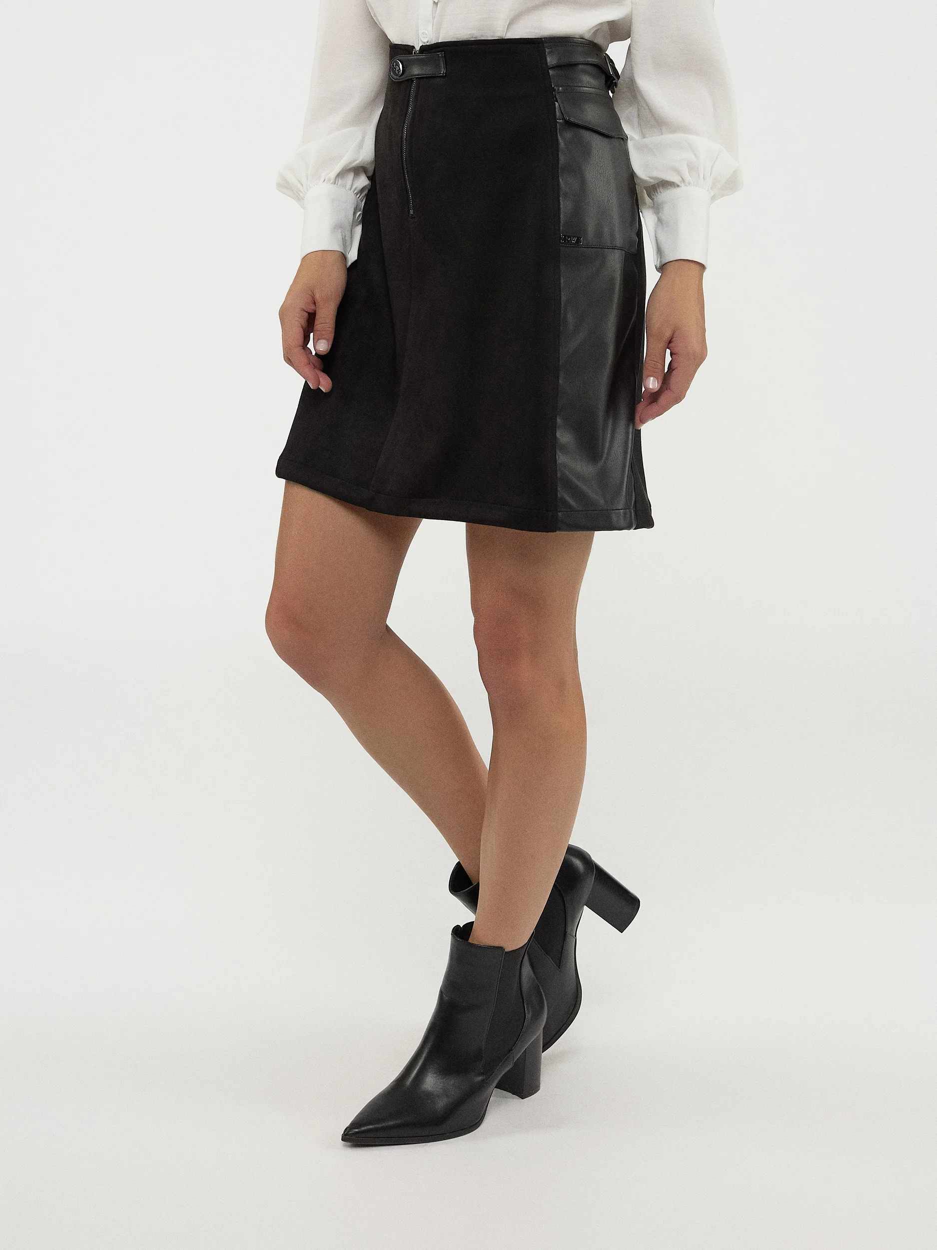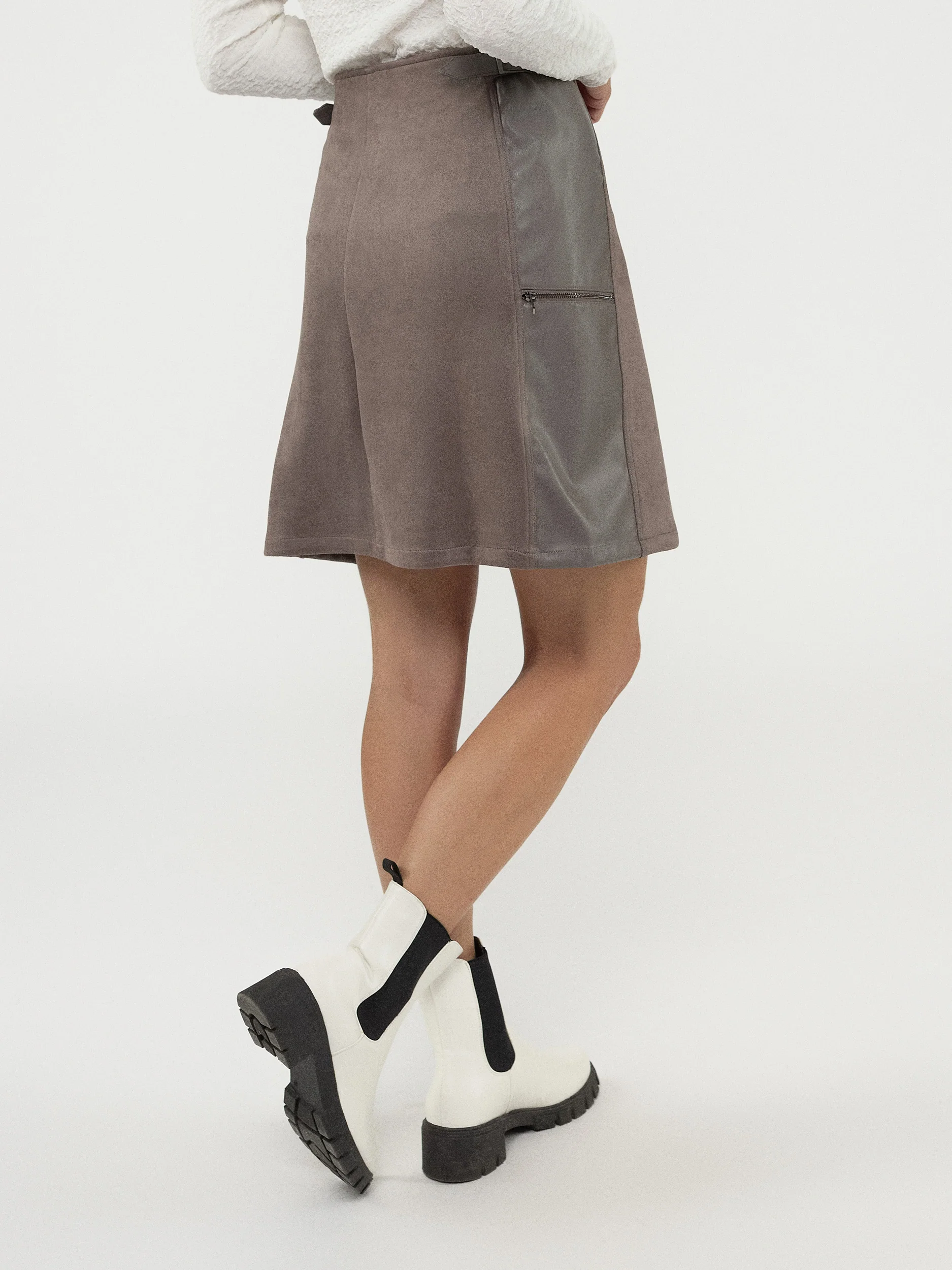 Cette jupe trapèze en suédine est rehaussée de détails en similicuir et d’une poche latérale gauche pratique. Les ceintures réglables de chaque côté permettent d’ajuster la taille avec style, tandis que la fermeture éclair avant et le bouton apportent une touche originale.