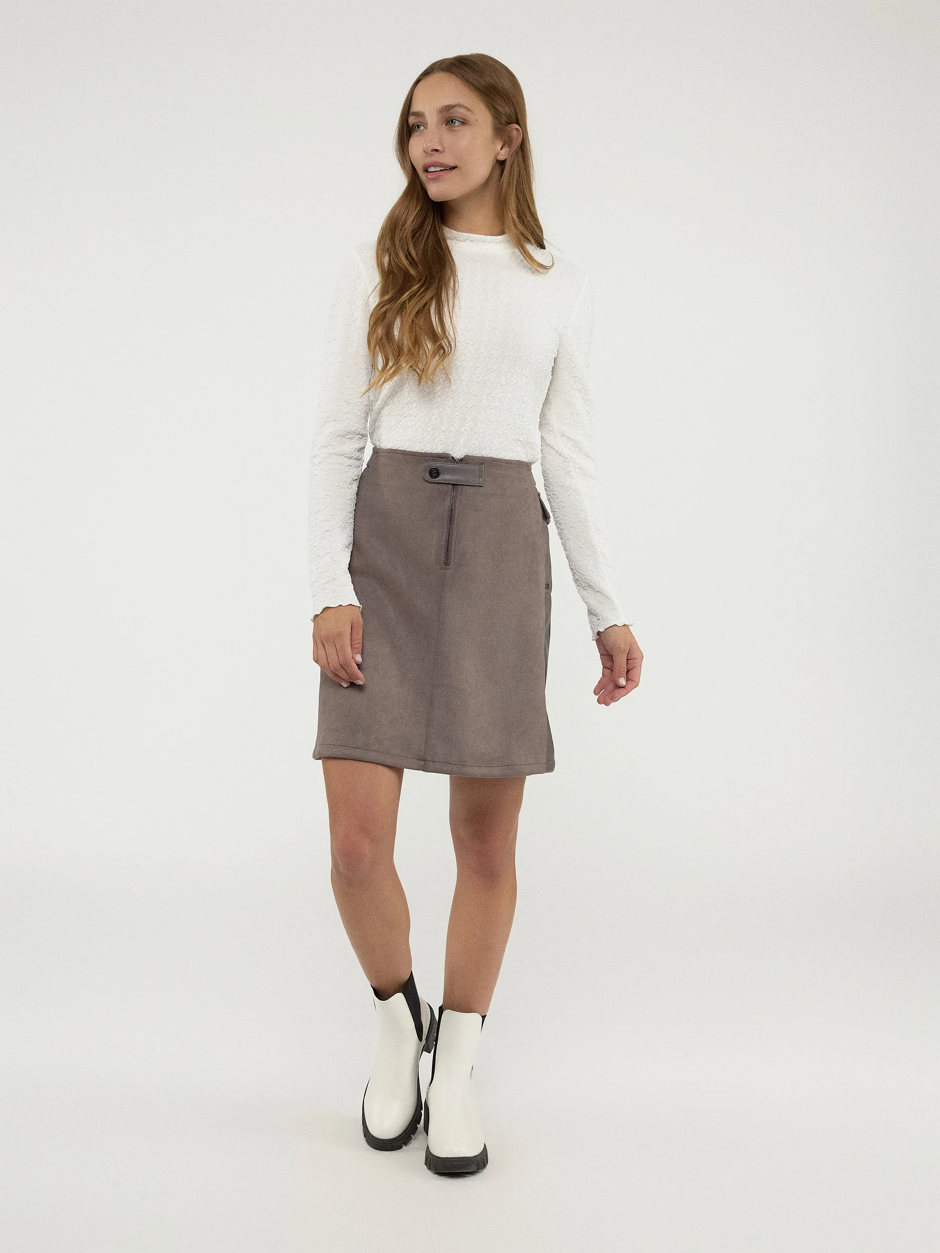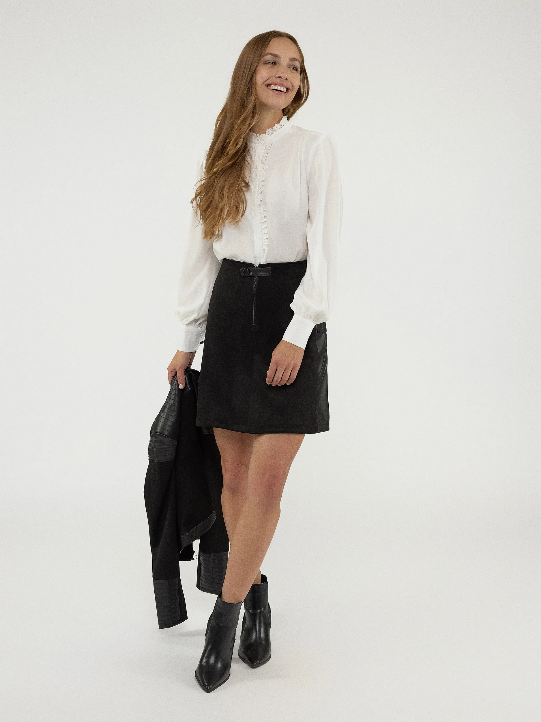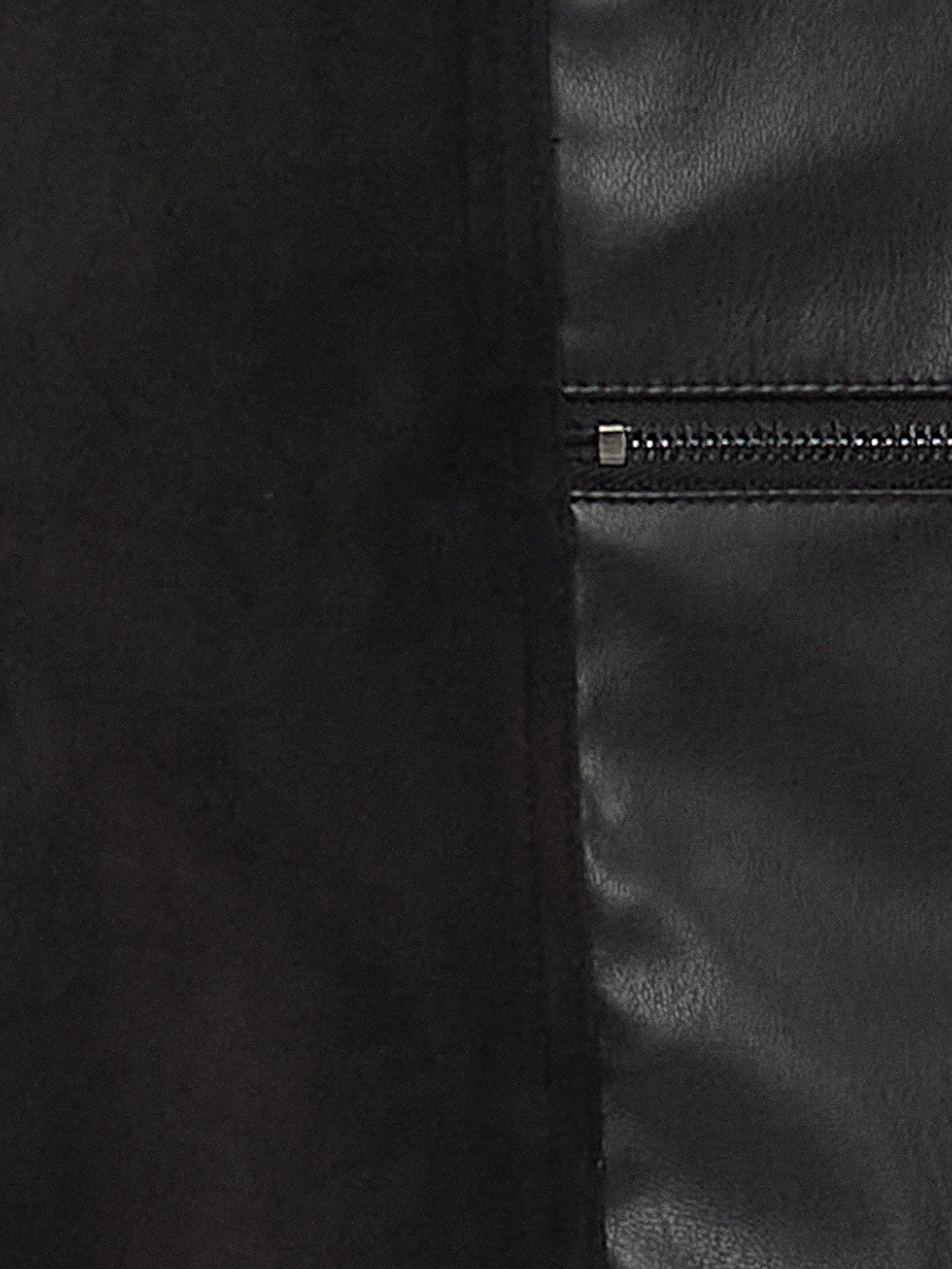 Cette jupe trapèze en suédine est rehaussée de détails en similicuir et d’une poche latérale gauche pratique. Les ceintures réglables de chaque côté permettent d’ajuster la taille avec style, tandis que la fermeture éclair avant et le bouton apportent une touche originale.