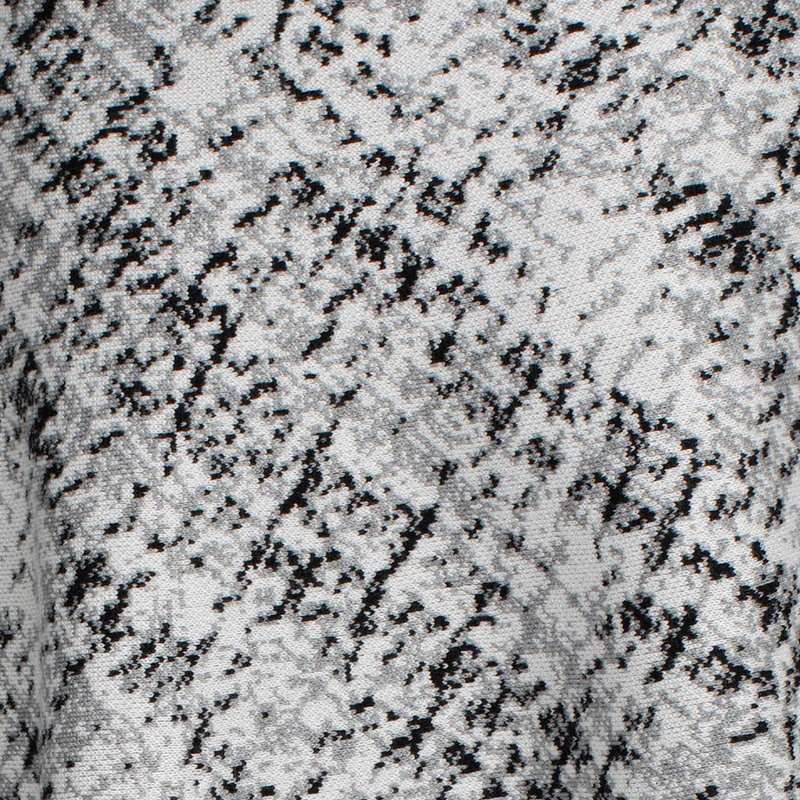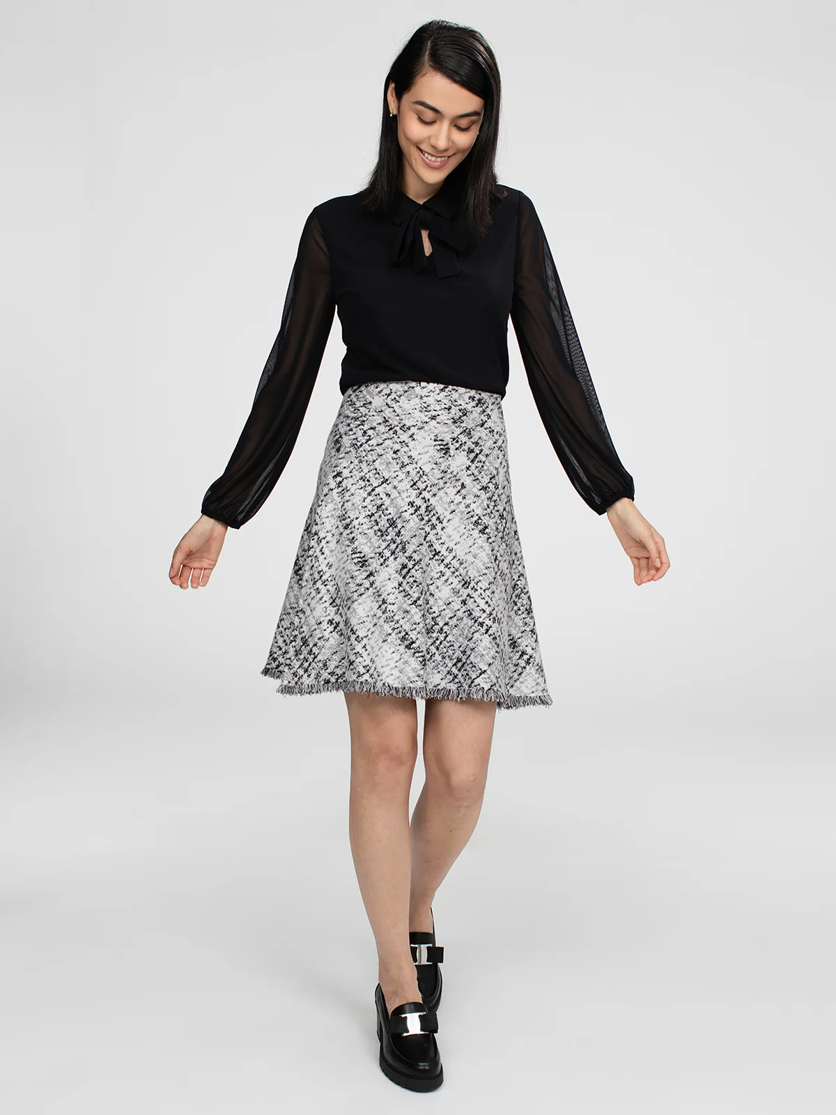 Jupe courte en tricot à motif bicolore, confectionnée dans une maille structurée extensible. La coupe ligne A est légèrement évasée et l’ourlet est terminé par une finition frangée.