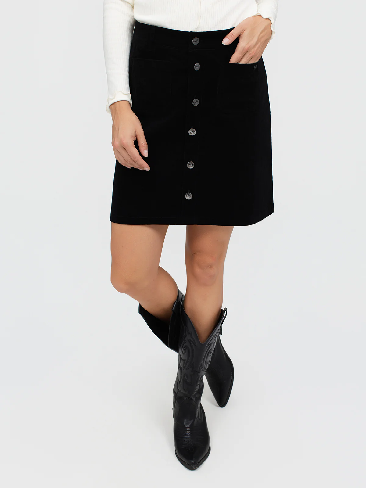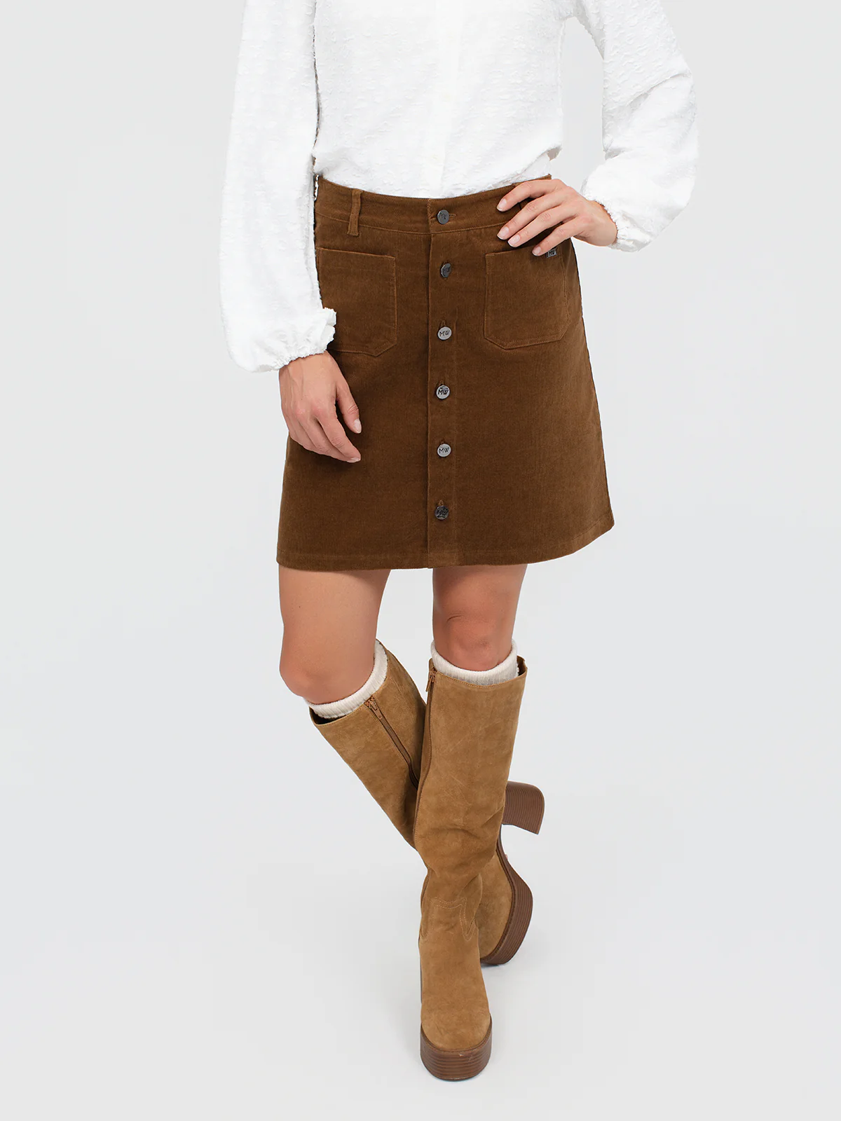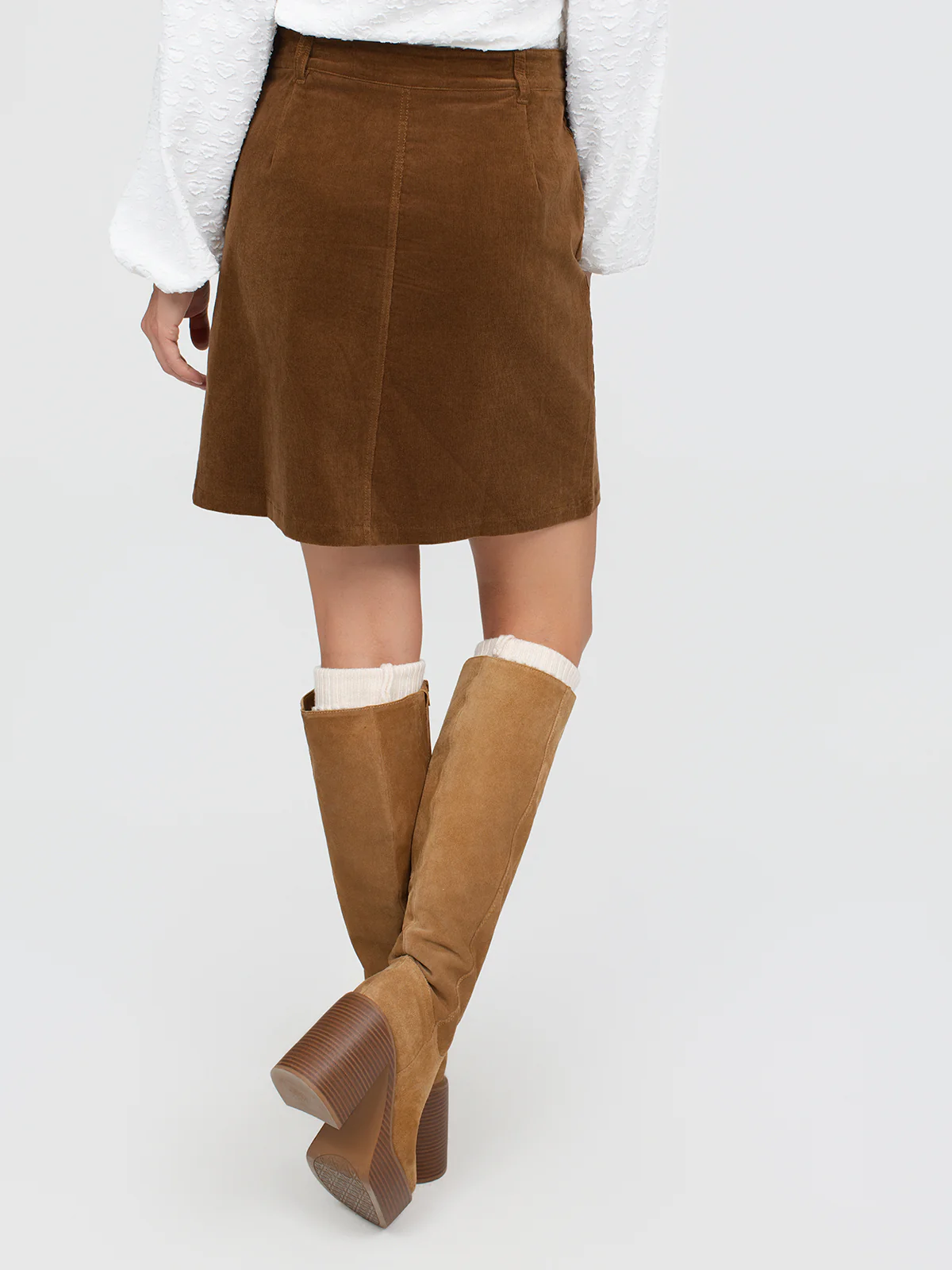 Jupe courte évasée à taille structurée par une ceinture à passants. Le devant est doté d’une rangée de boutons et de deux poches plaquées, tandis que le dos présente une couture verticale médiane.