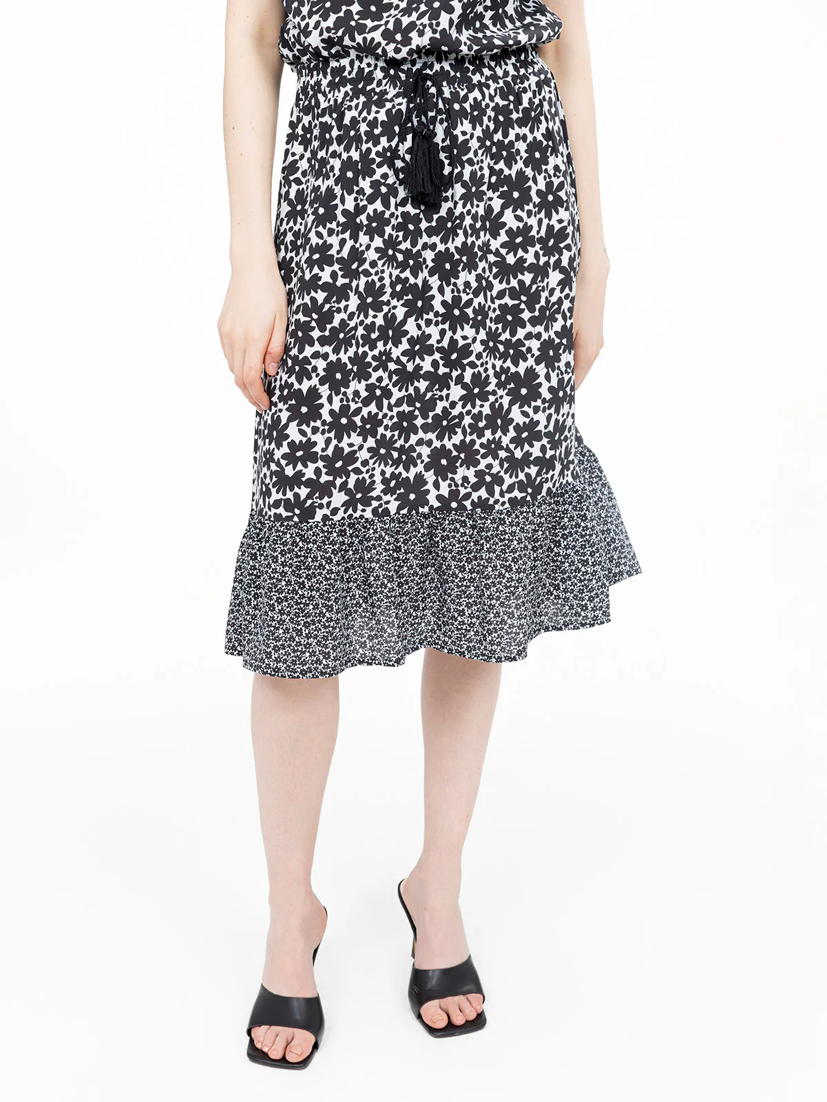 Imprimé floral contrasté sur toute la surface, rehaussé par une large bande volantée à motifs miniatures. Ceinture élastiquée avec cordon à pompons pour ajustement à la taille.