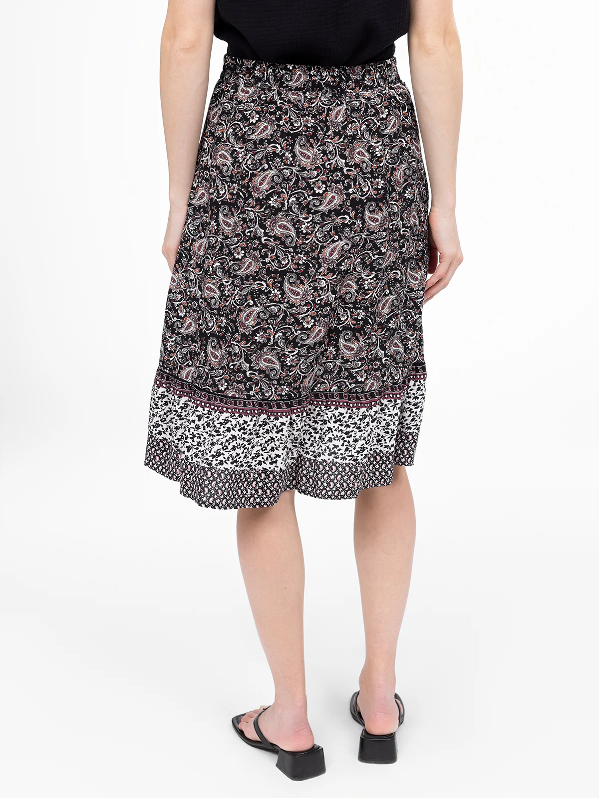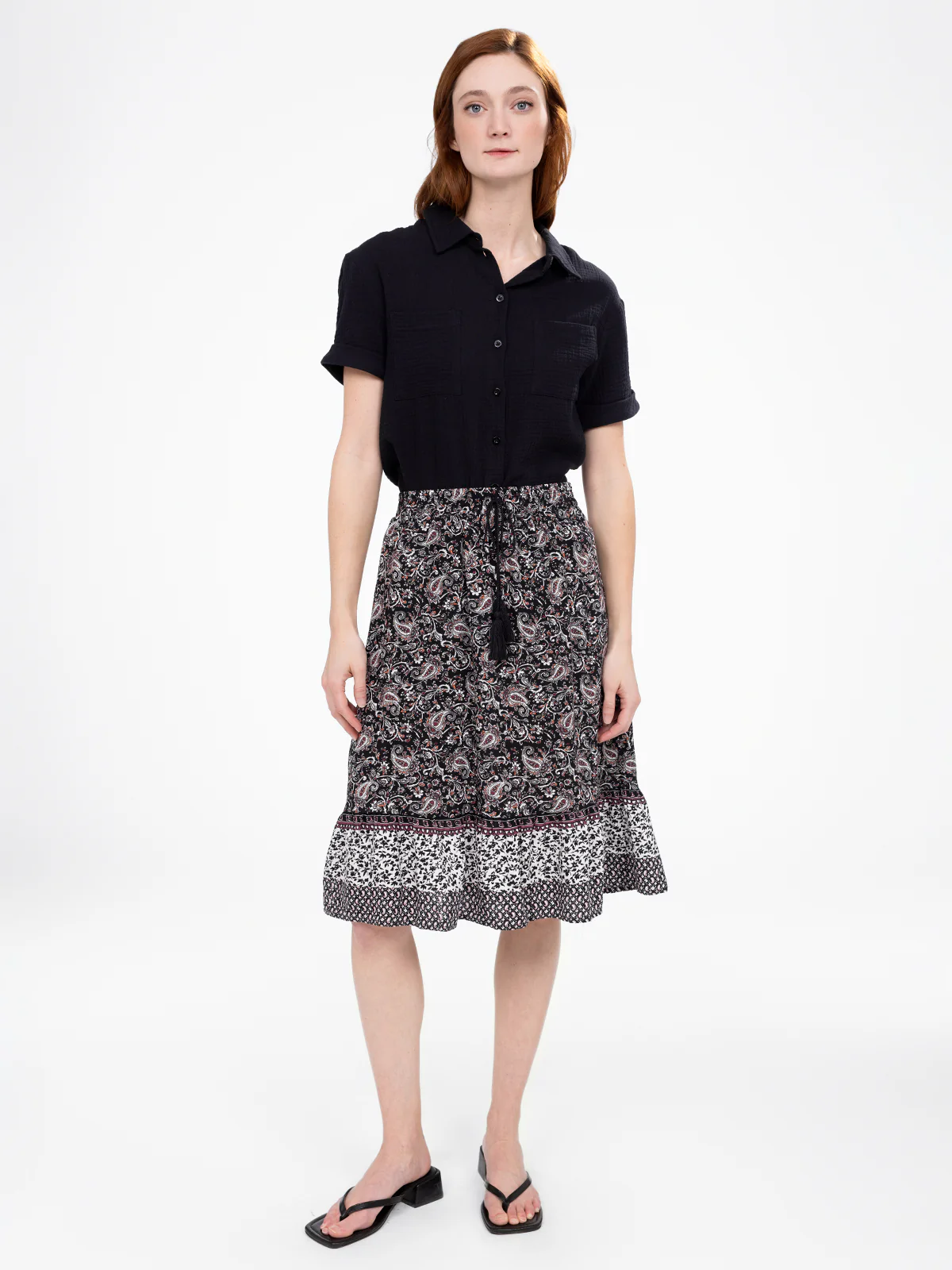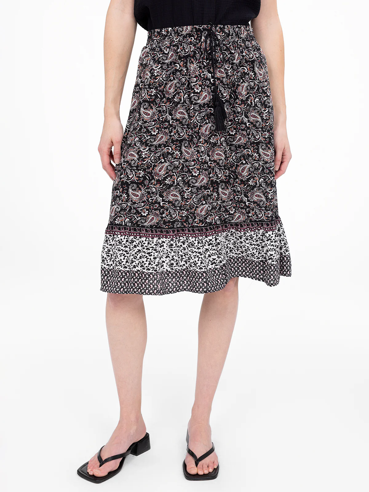 Une jupe fluide qui mélange les motifs avec subtilité, créant un effet de contraste harmonieux. La taille élastique ajustable par un lien ajoute une touche de confort et de praticité.
