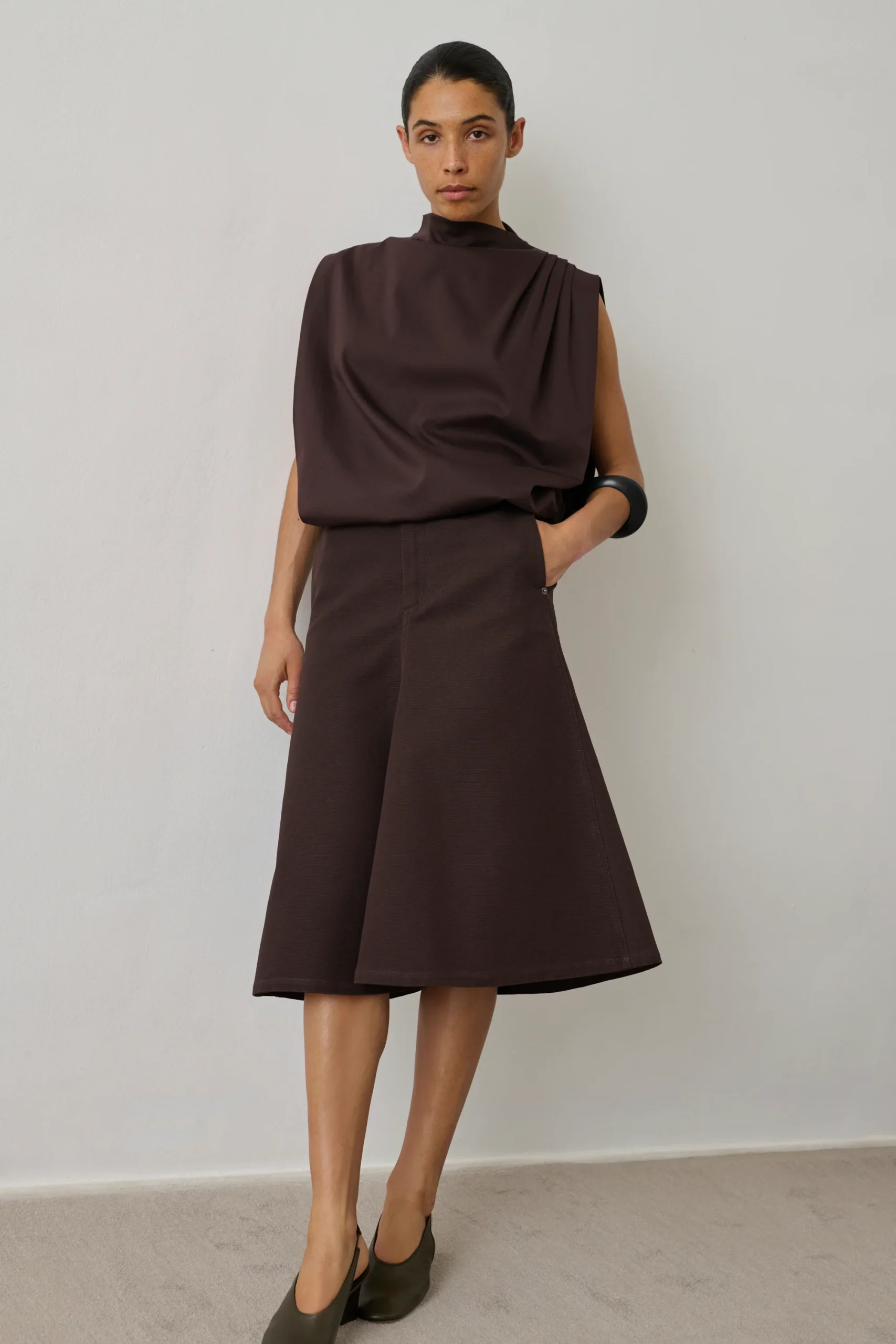 – Coupe évasée – Tombé mi-mollet – Ouverture bouton intérieur, crochet et zip – Deux poches côtés, deux poche dos – Patch en cuir au dos