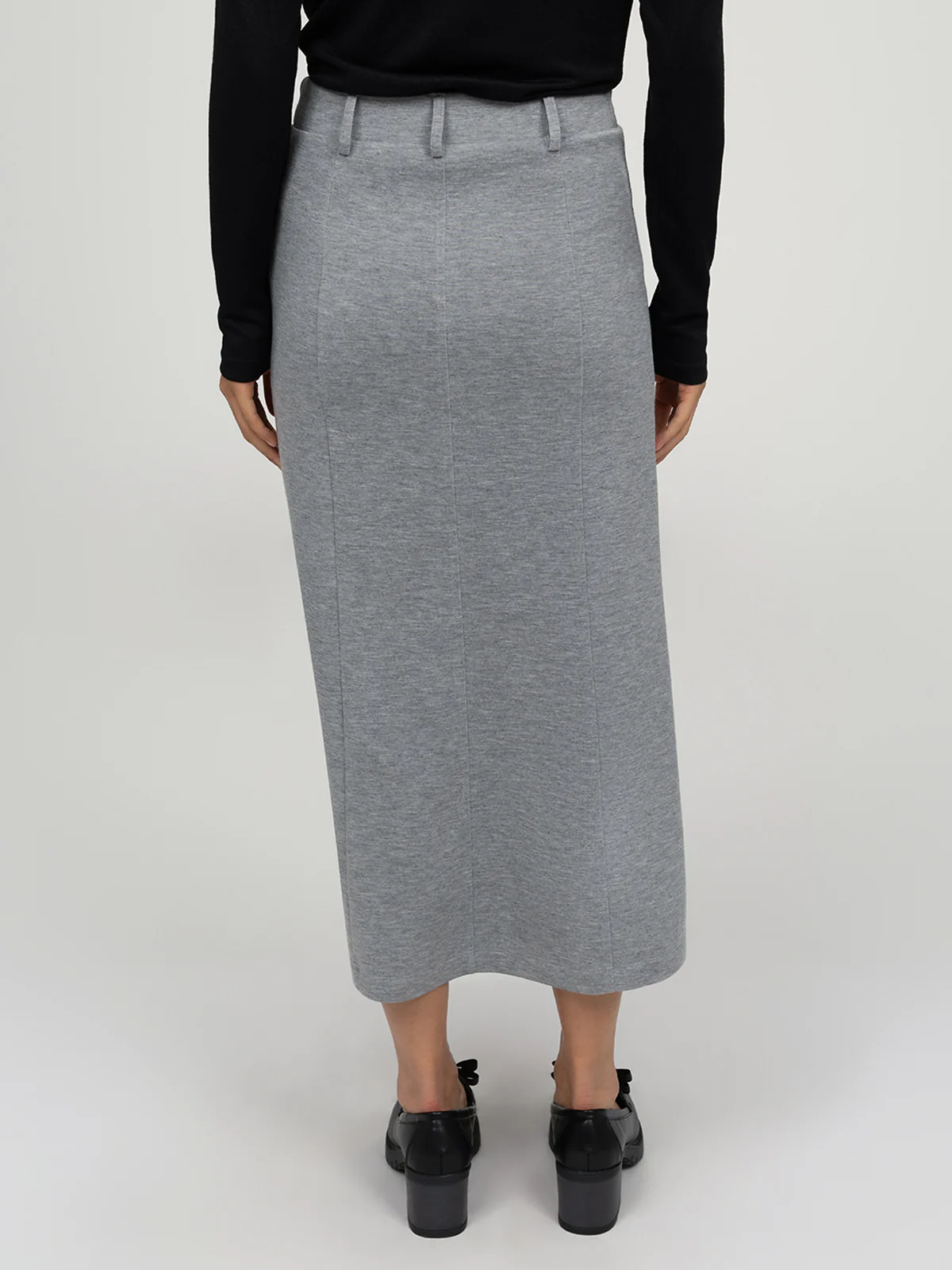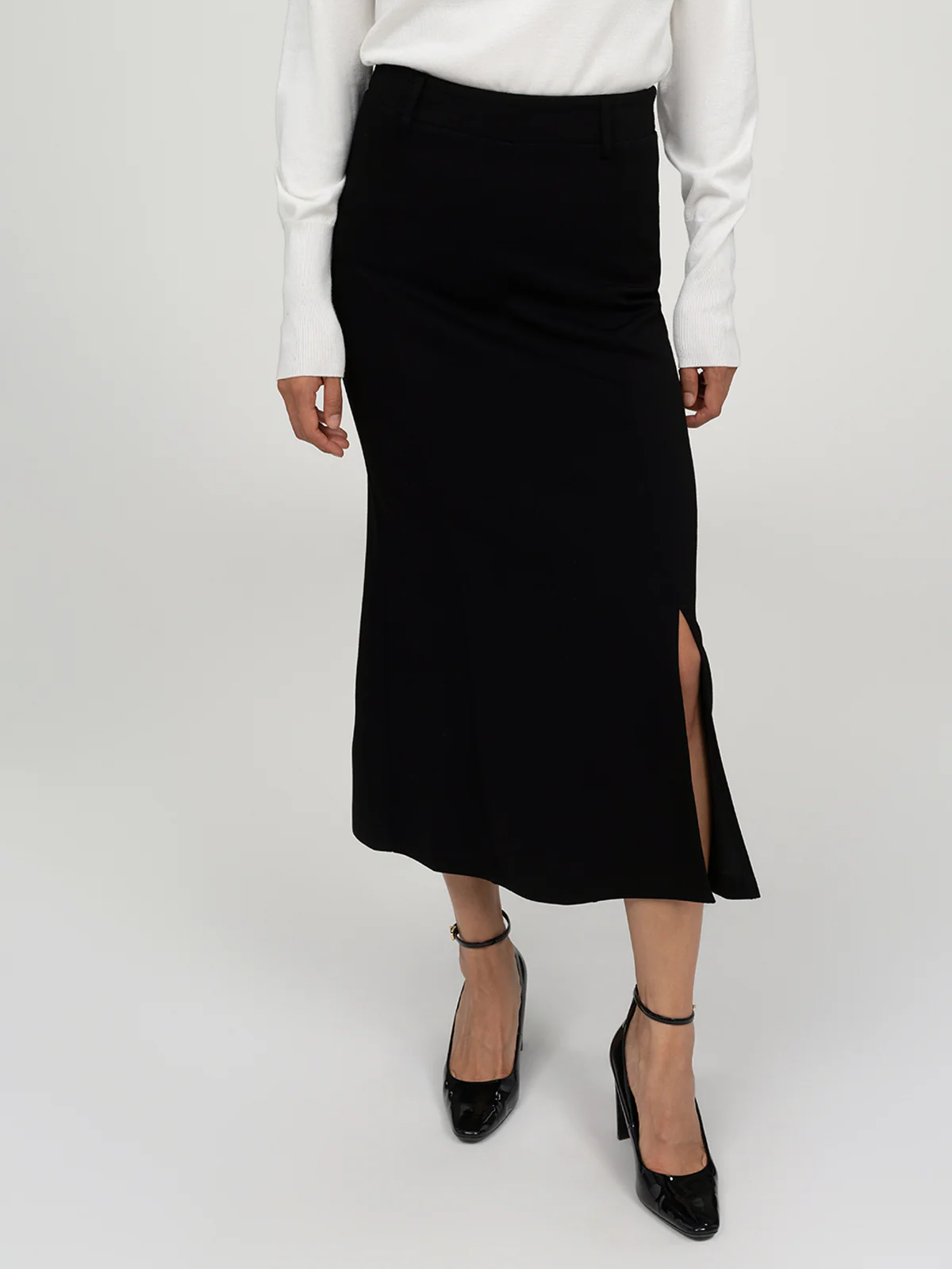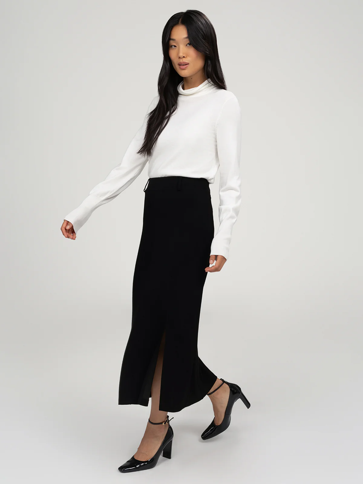 Jupe longueur midi à coupe droite avec passants de ceinture et ouverture fendue sur le devant. Elle comporte des coutures verticales marquées et une taille montée.
