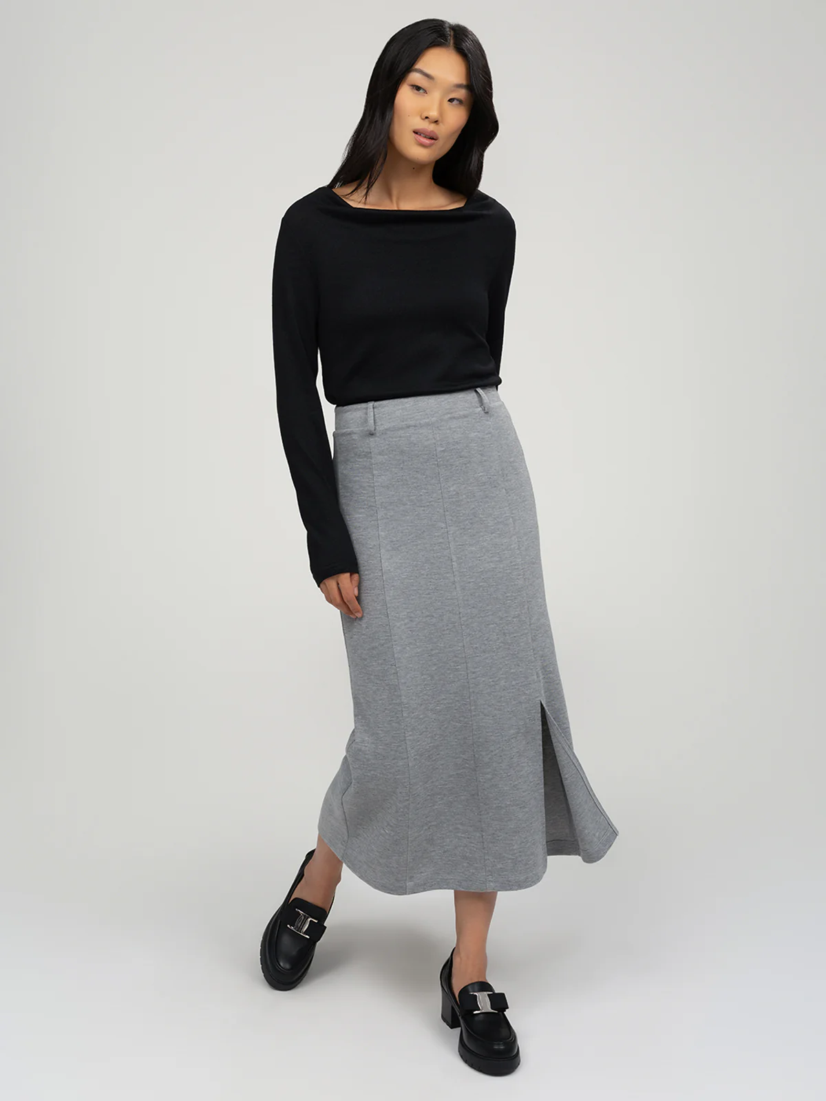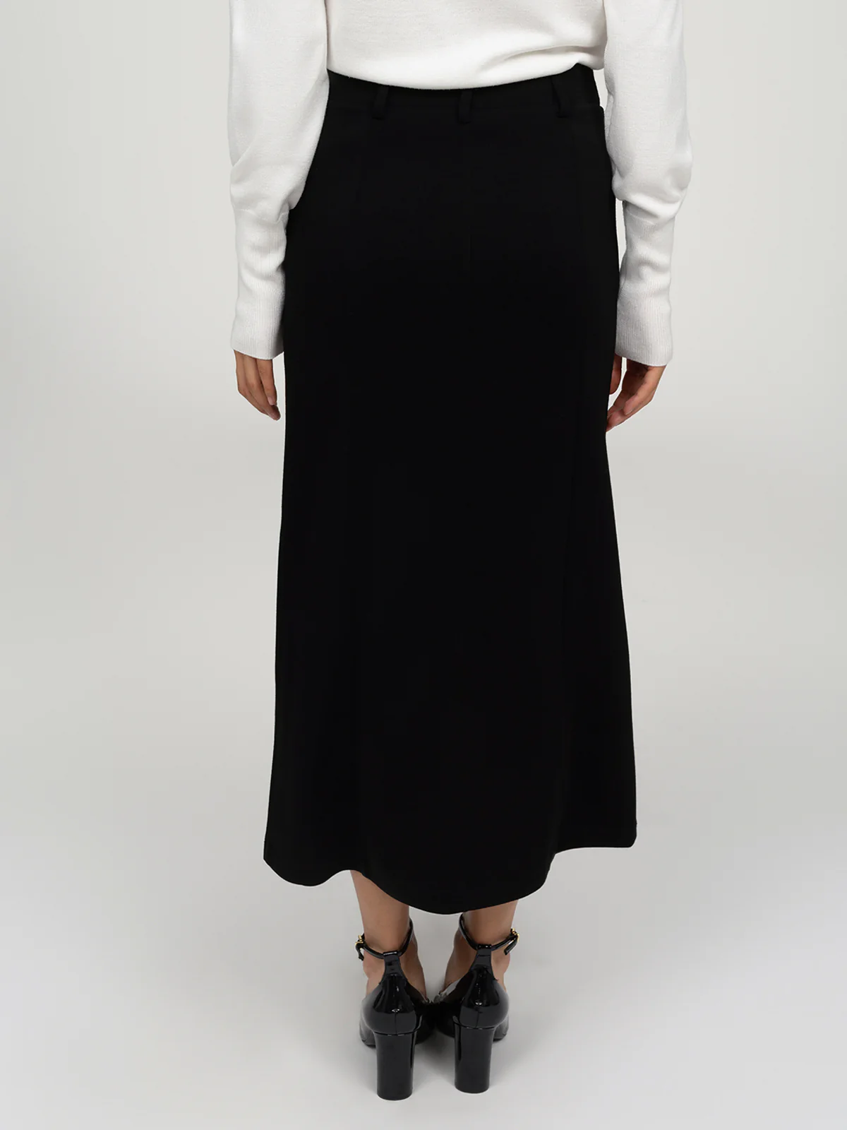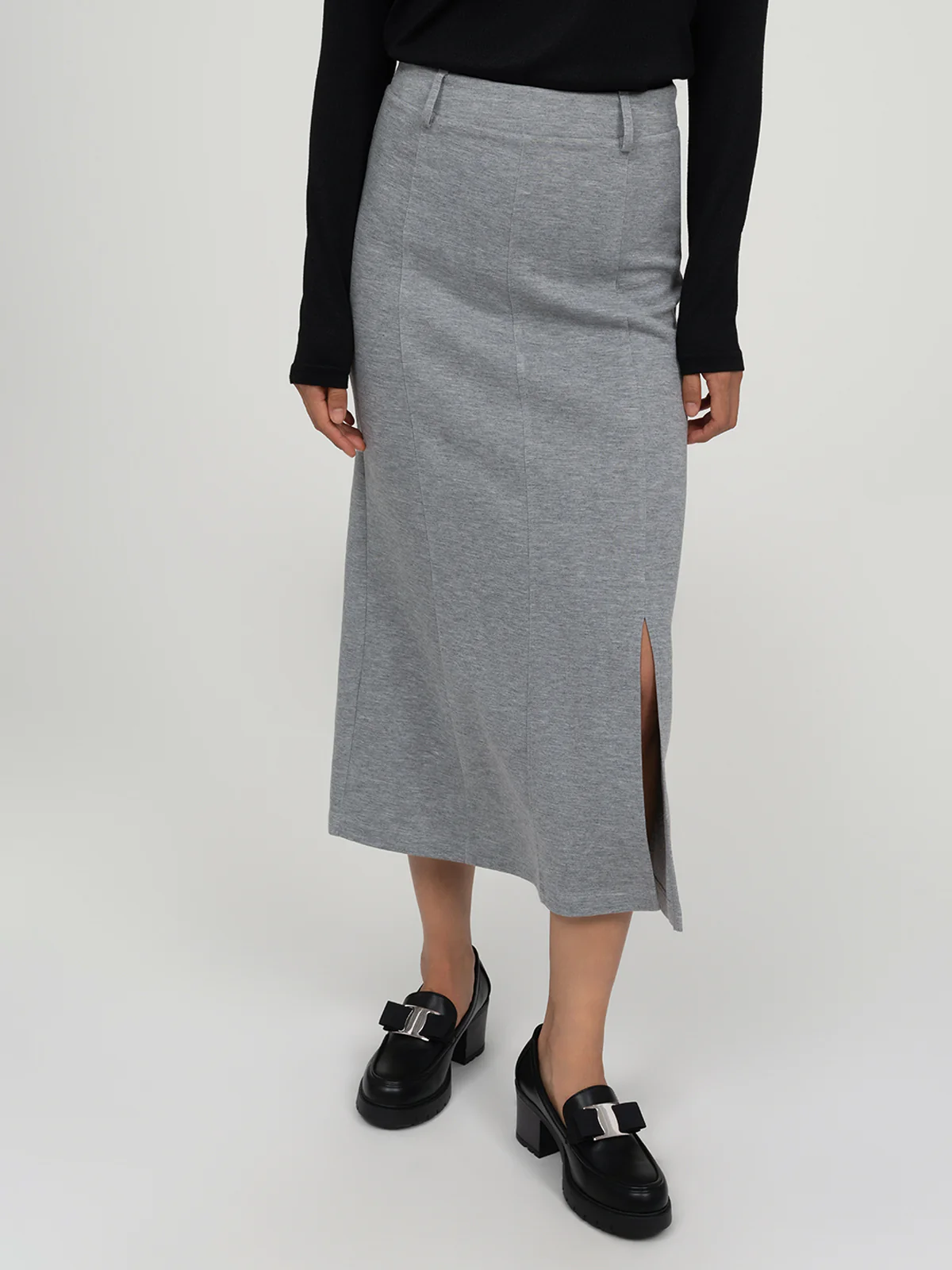Jupe longueur midi à coupe droite avec passants de ceinture et ouverture fendue sur le devant. Elle comporte des coutures verticales marquées et une taille montée.