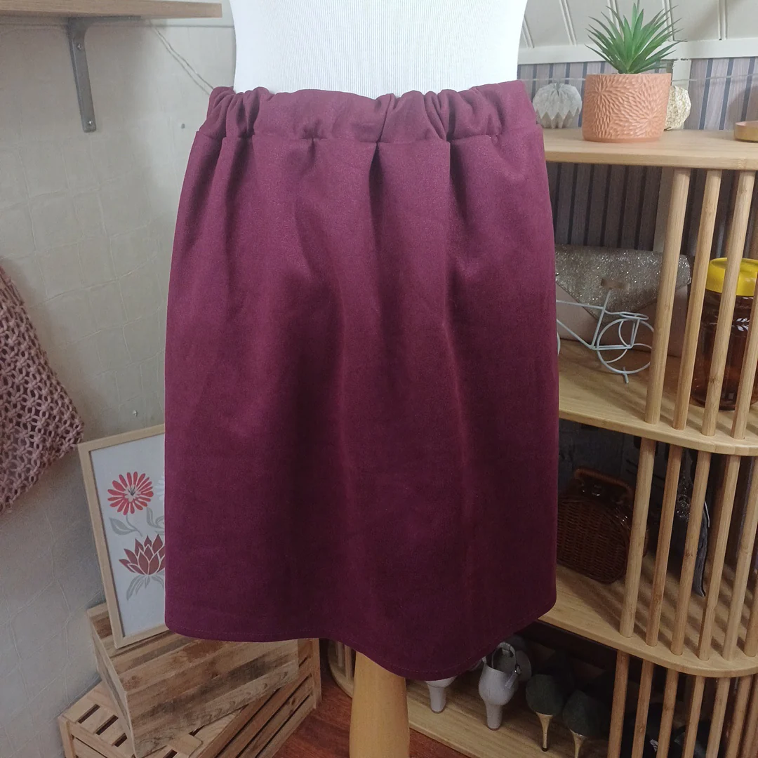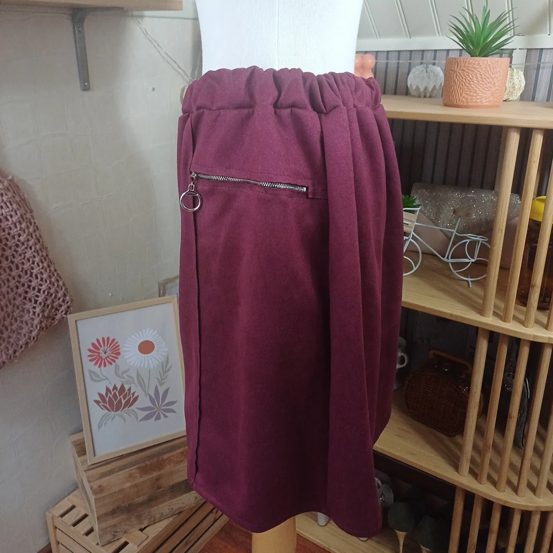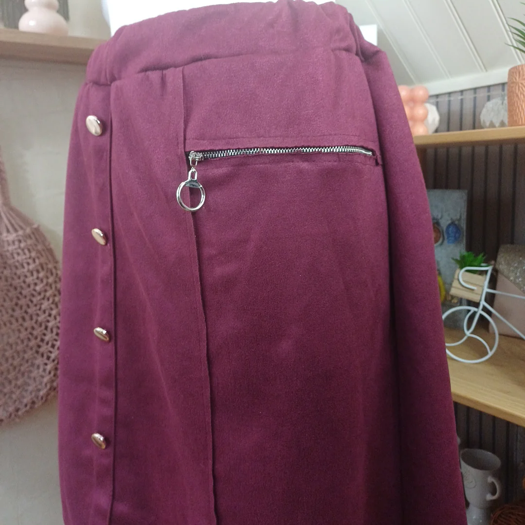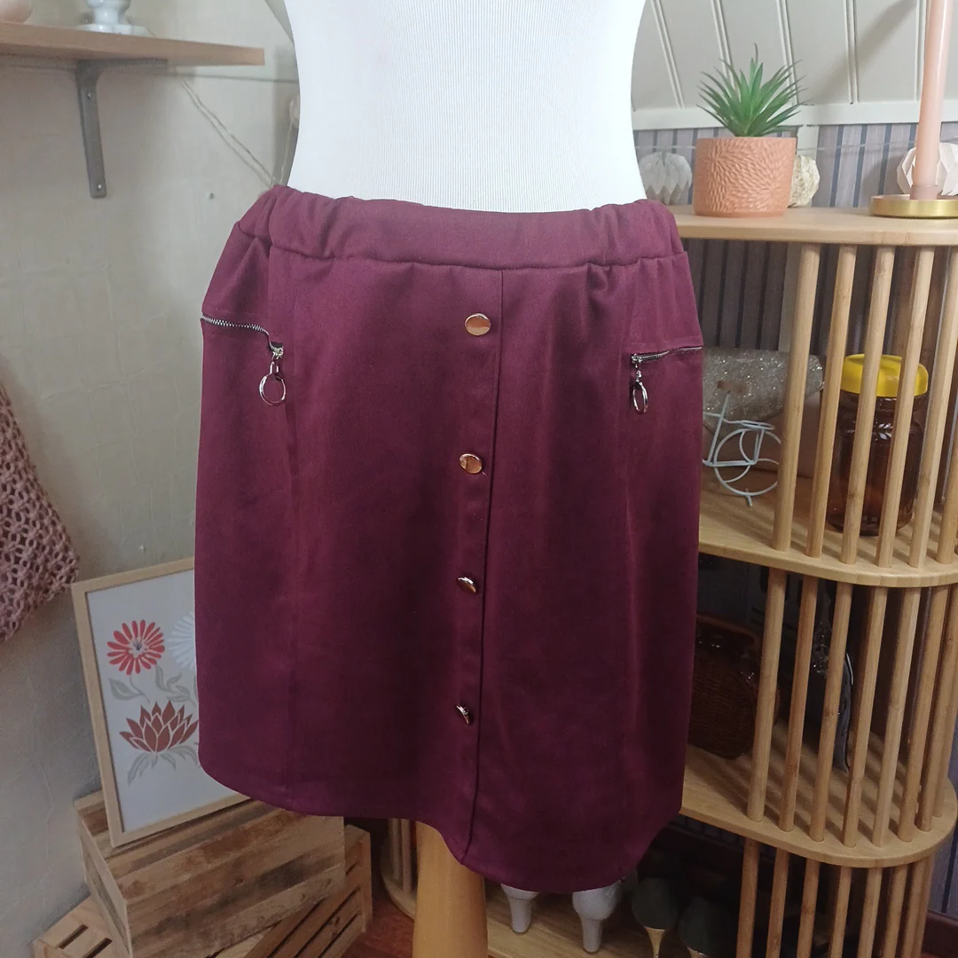 Jupe prune avec boutons et fermetures éclair Fantaisies au toucher peau de pêche, ceinture élastique, marque non indiquée, taille non indiquée conviendra pour une taille XL.