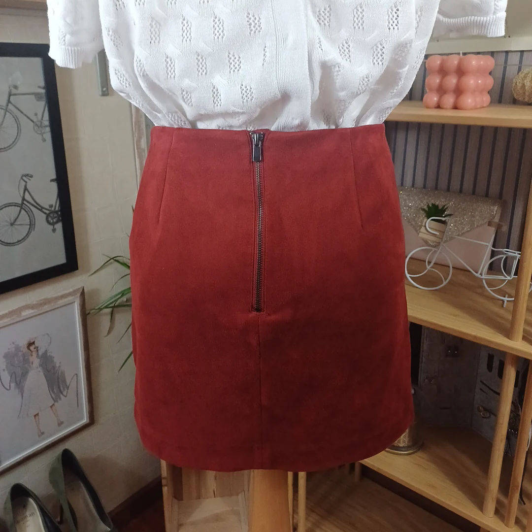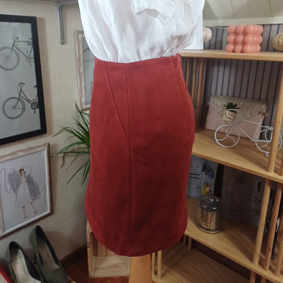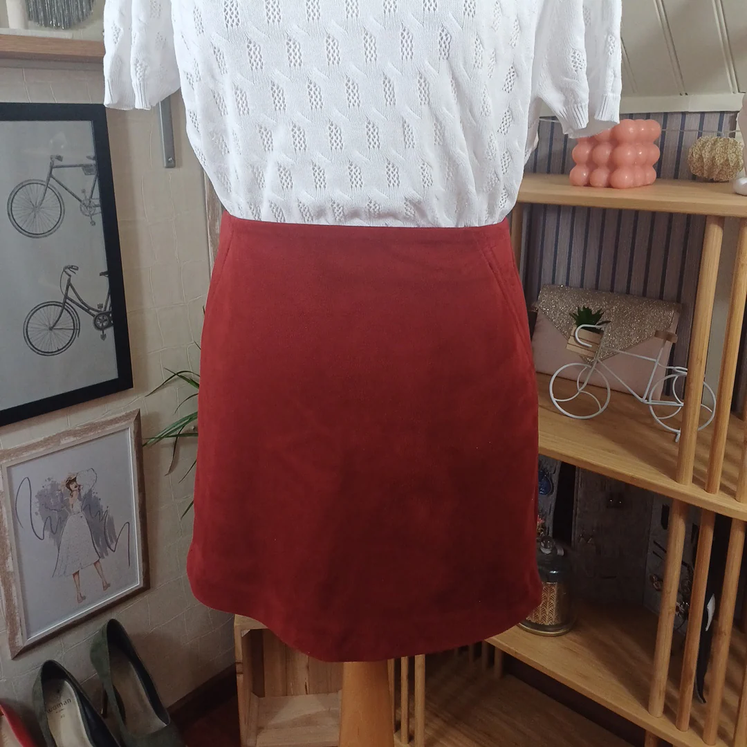 Jupe rouge aspect daim,Mango, taille indiquée 34 Conviendra pour une taille 36 Fermeture éclair sur l’arrière Mesures: Tour de taille 70 cm Longueur 39 cm