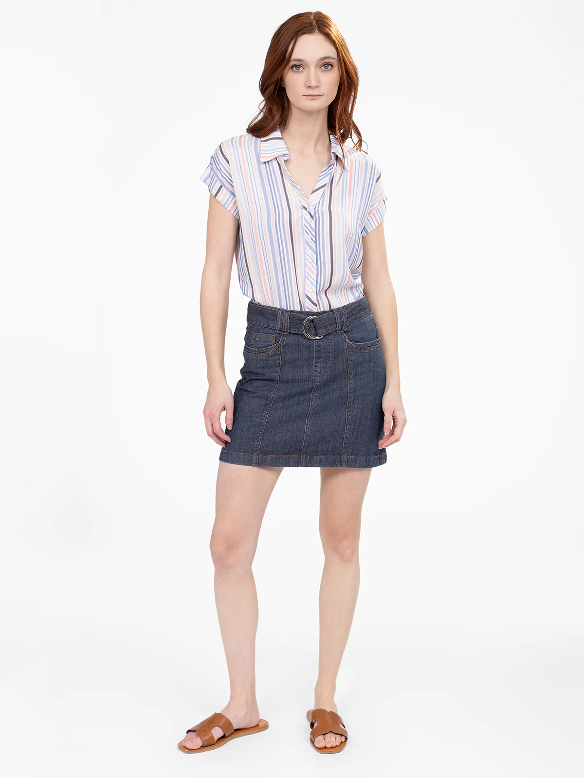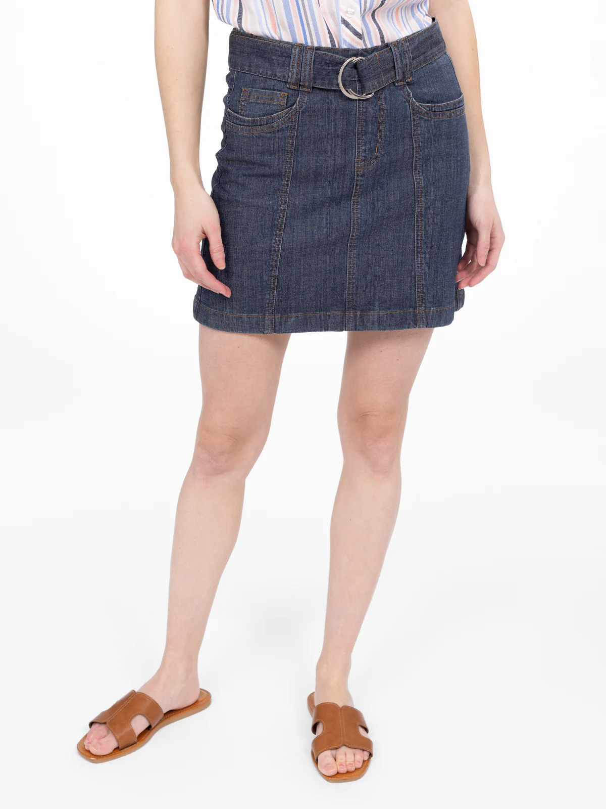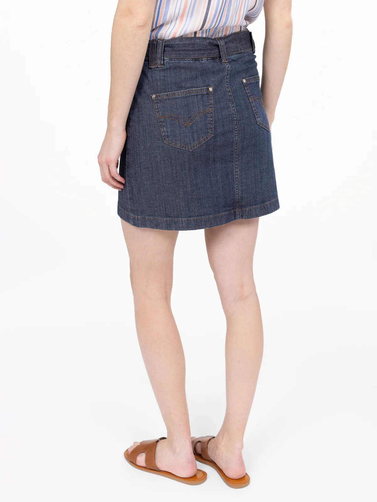 Avec ses surpiqûres contrastées et sa ceinture intégrée, cette jupe en jean revisite un incontournable du dressing. Son tissu robuste et sa coupe ajustée en font une pièce facile à associer au quotidien.