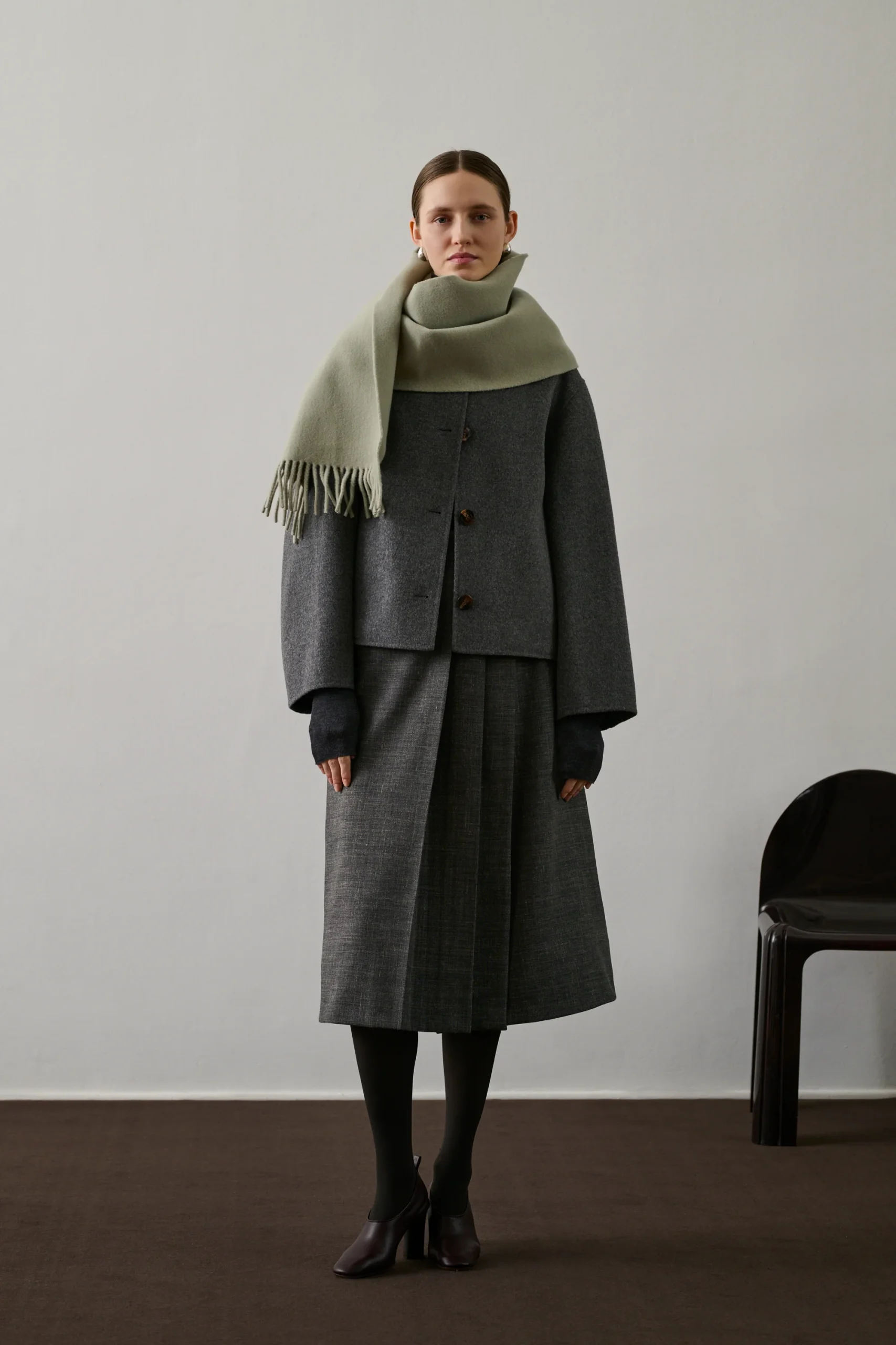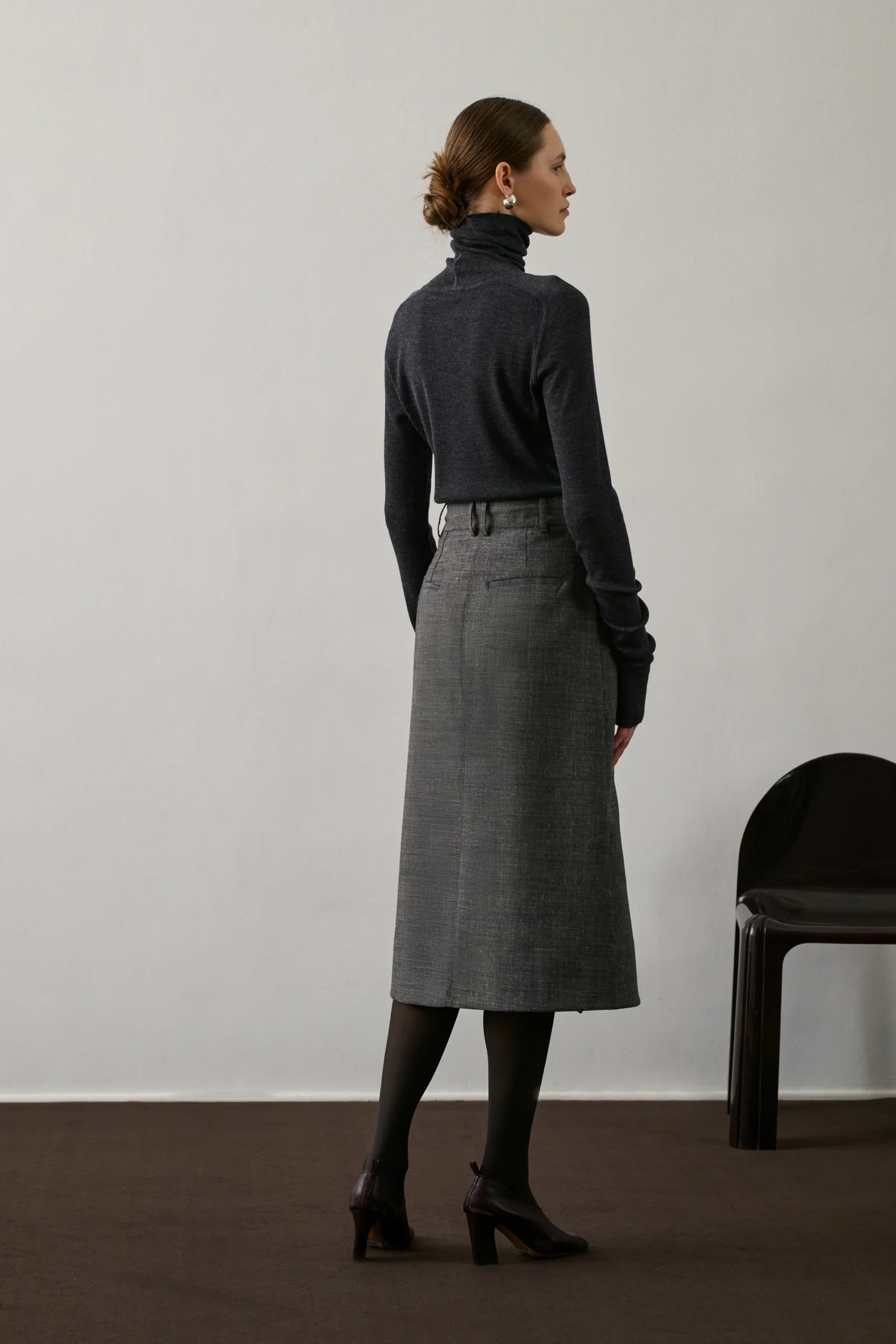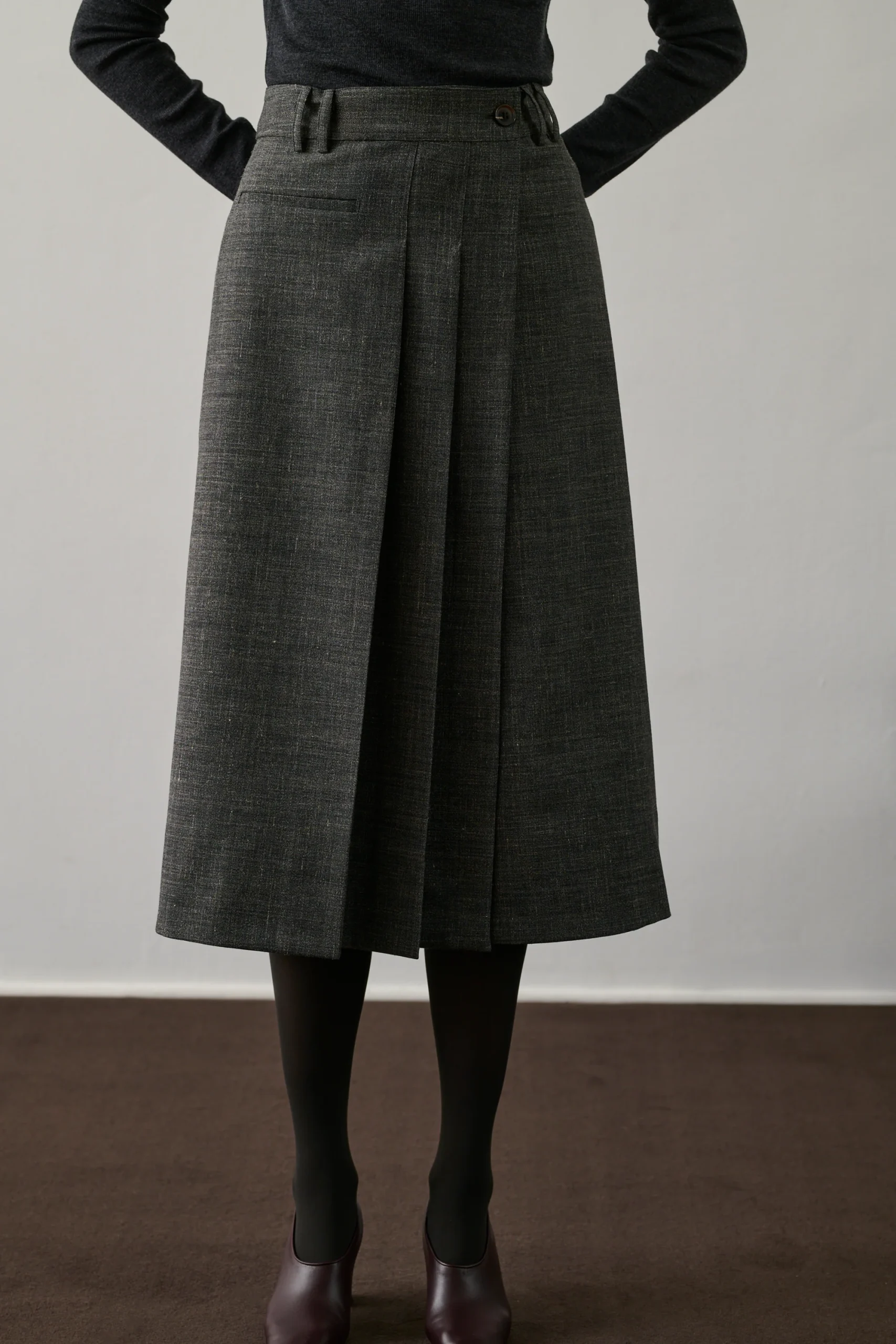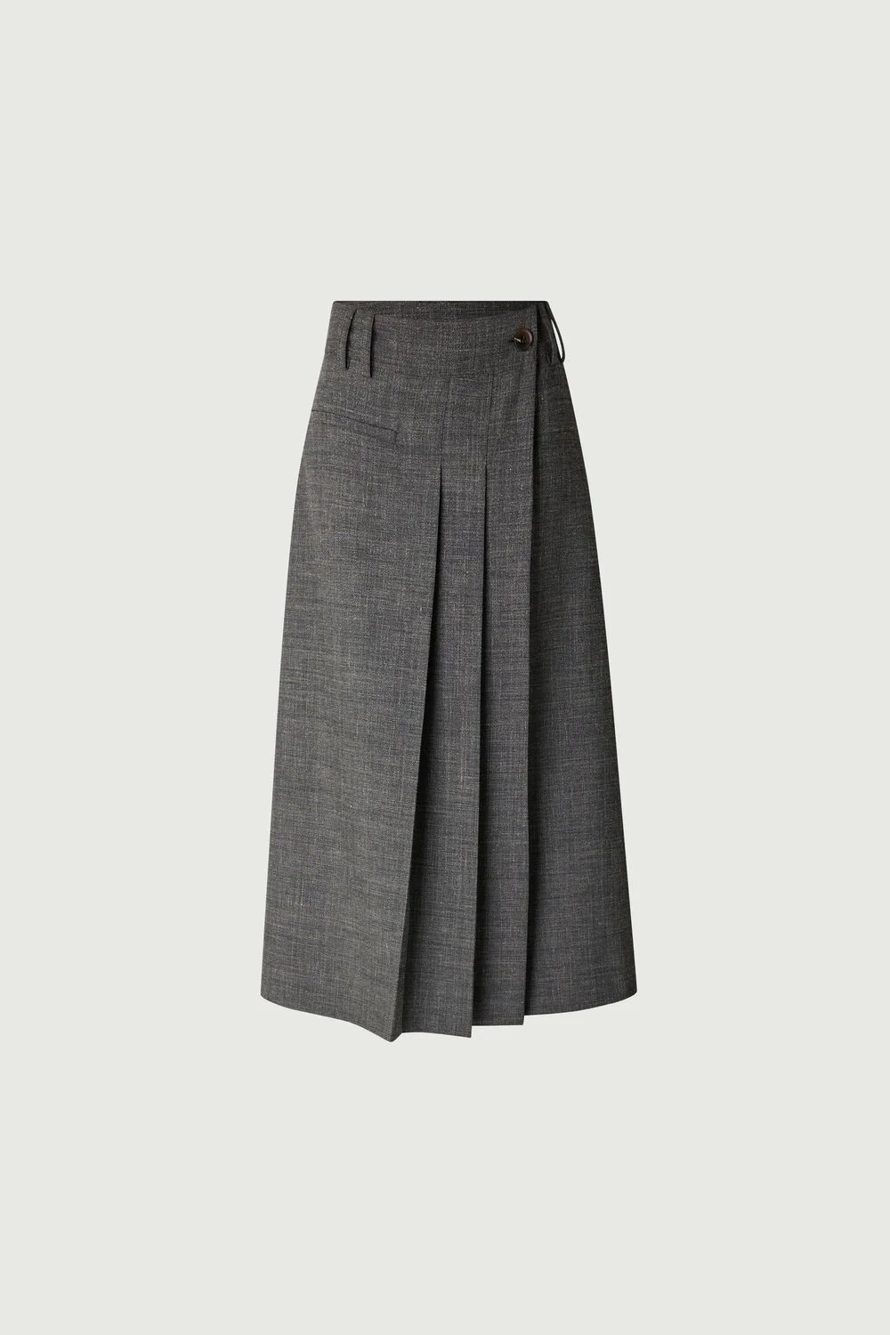 VARNA est une jupe mi-longue en toile de laine flammée gris chiné, parfaite pour l’hiver. Sa fermeture portefeuille boutonnée et ses plis sur le pan avant ajoutent une touche d’élégance. Une poche passepoilée devant et deux au dos complètent ce modèle sophistiqué.