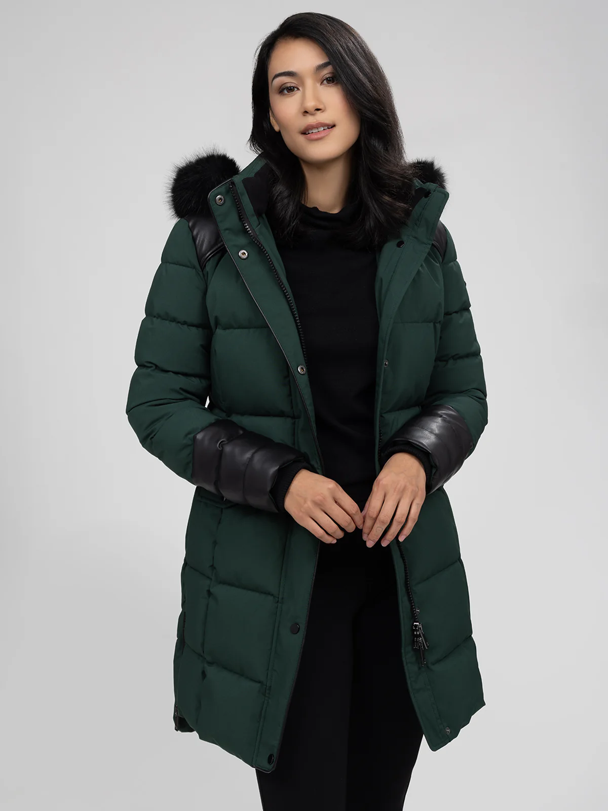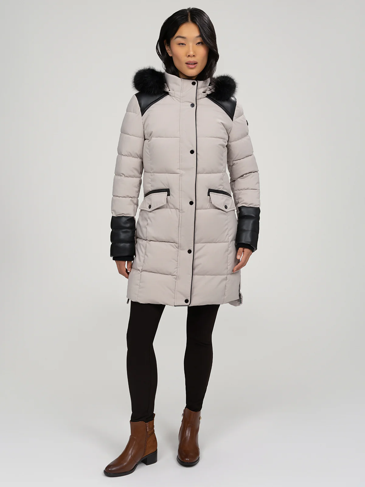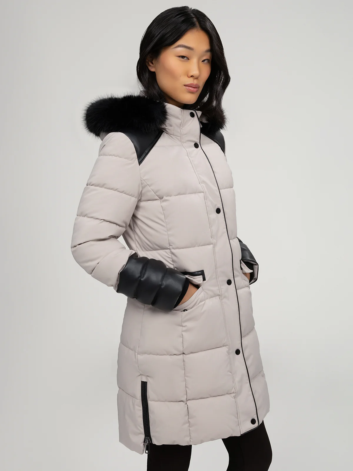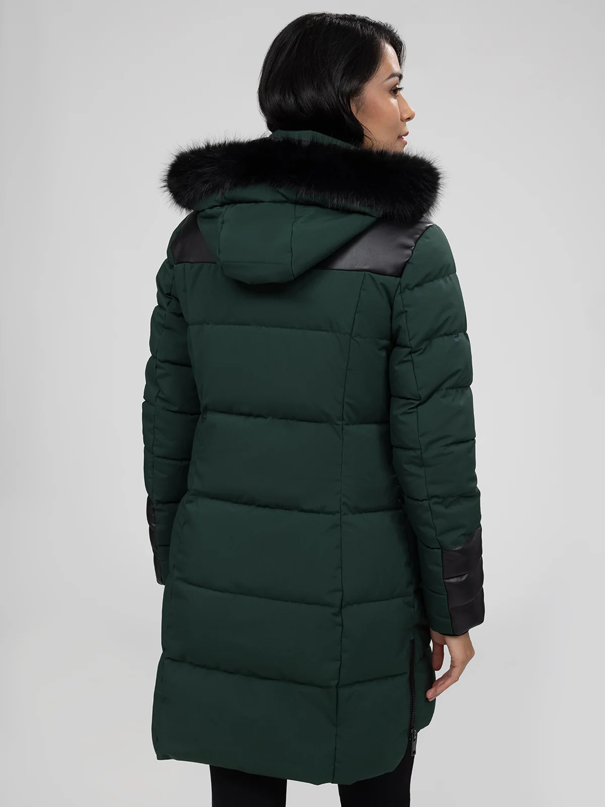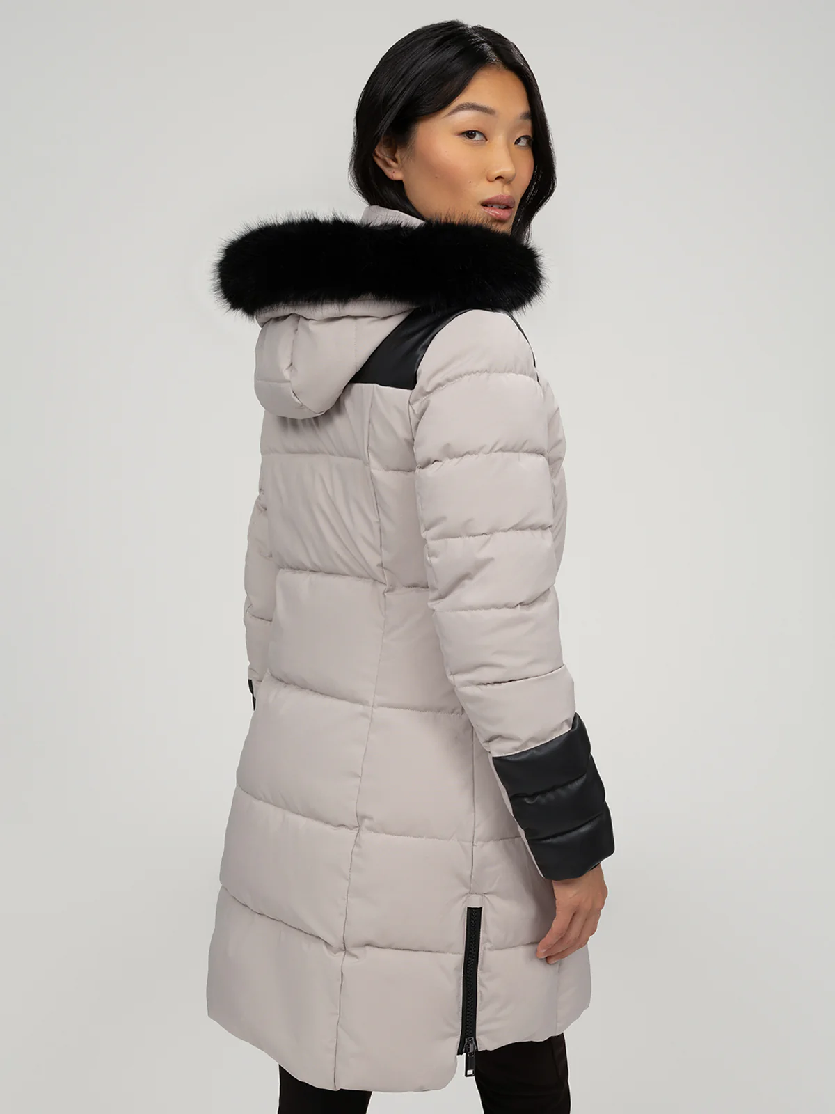Manteau matelassé de longueur au-dessus du genou avec capuche bordée de fausse fourrure. Le modèle présente des empiècements contrastants aux épaules et aux bas de manches, deux poches à rabat à l’avant et des fentes latérales zippées.