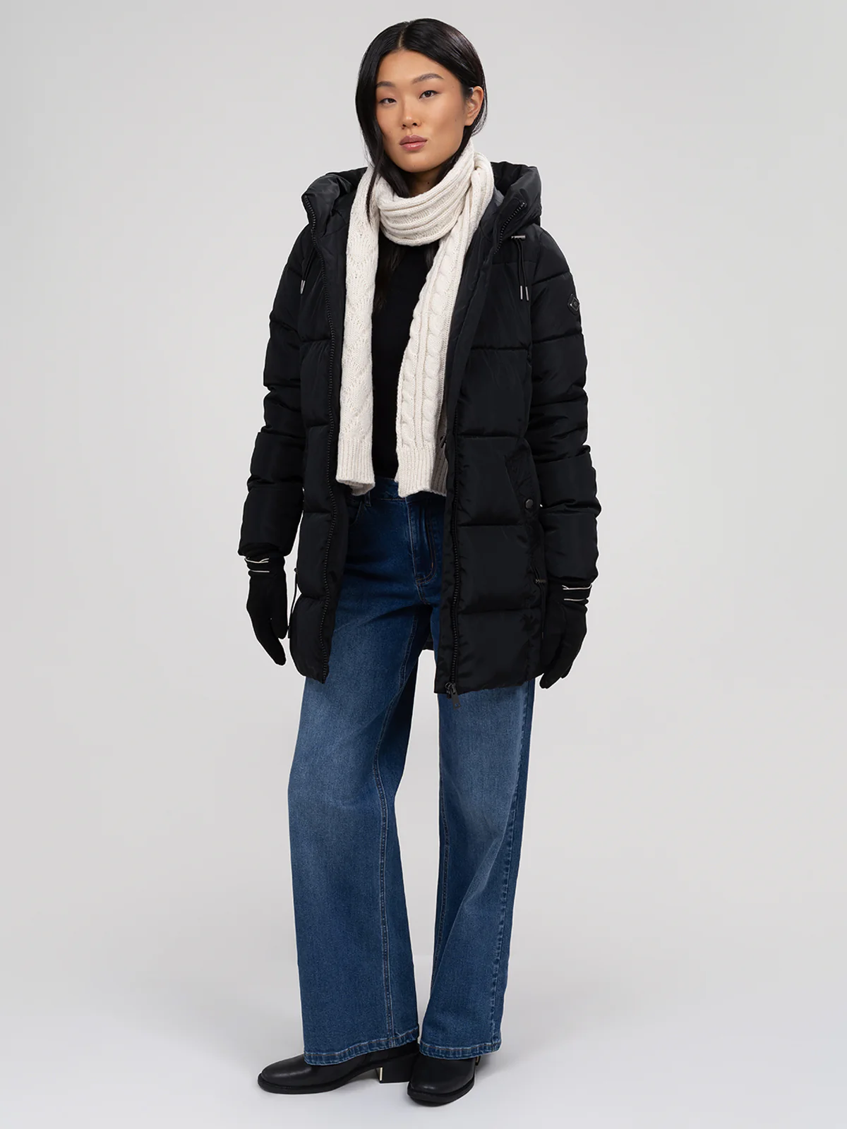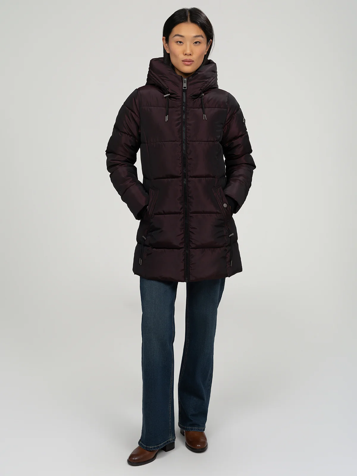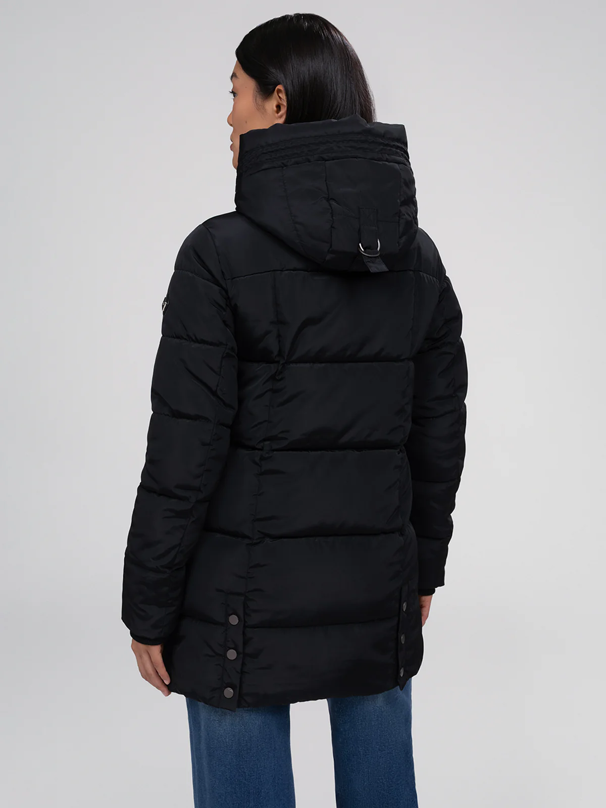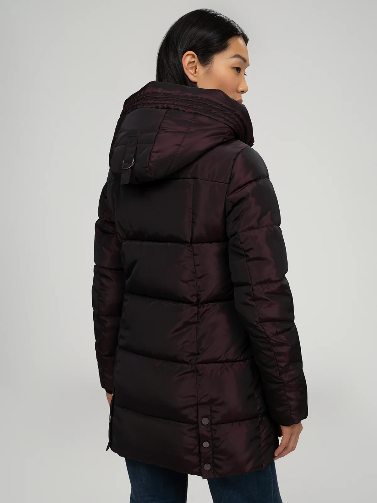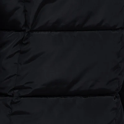 Manteau dans un textile matelassé à surpiqûres horizontales avec une capuche ajustable par cordons. Elle comprend une fermeture zippée frontale et deux poches latérales fermées par un rabat pressionné et un cordon réglable.