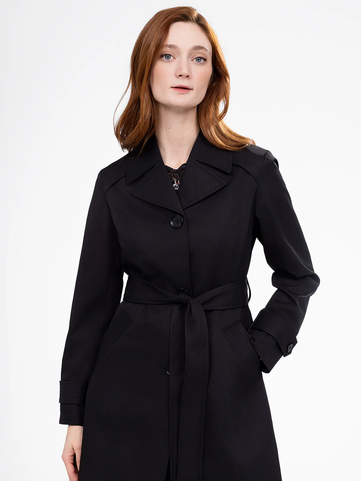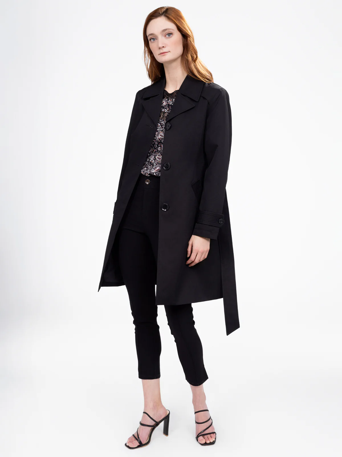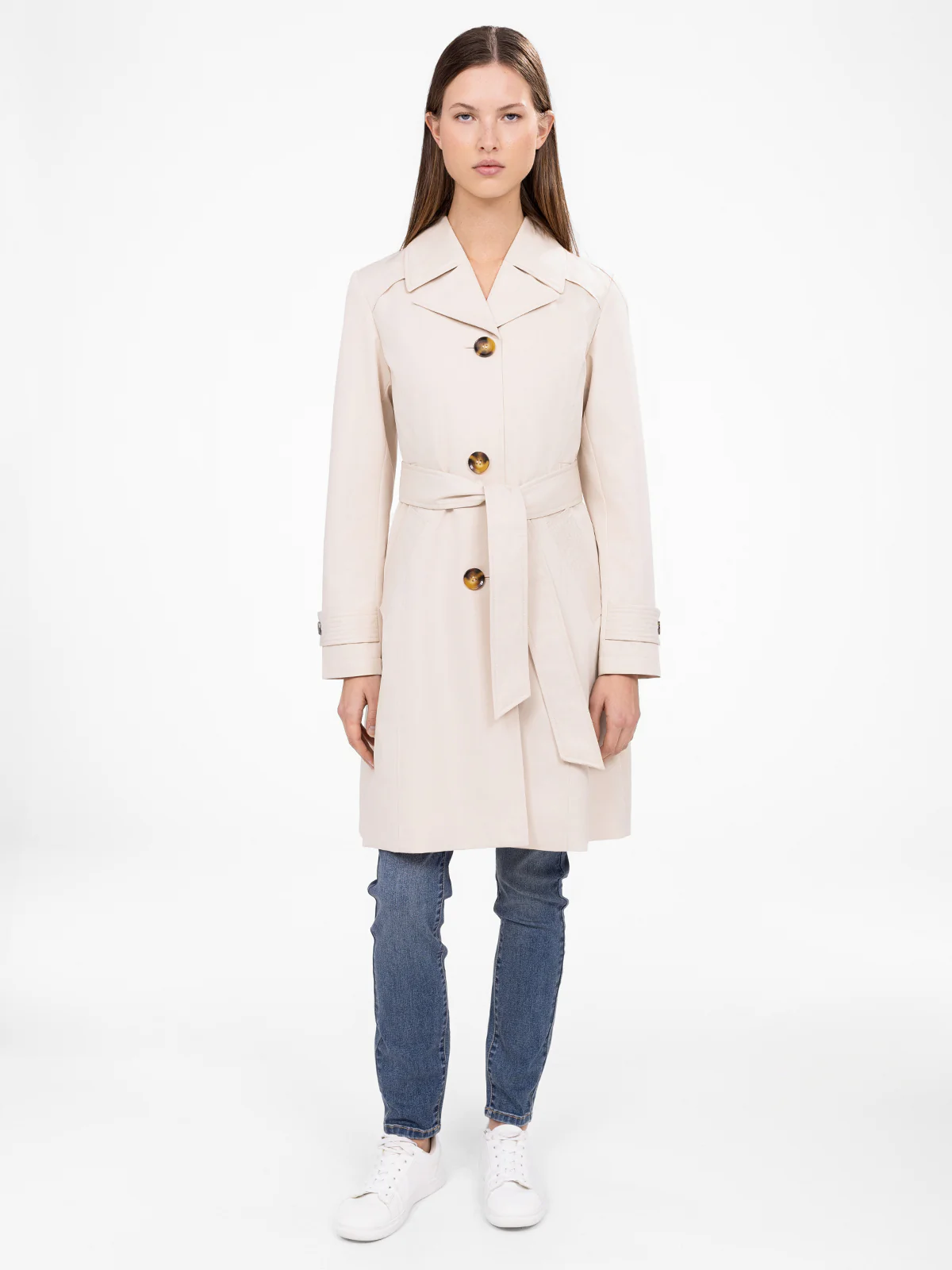 Ce trench mi-cuisse revisite un classique avec des détails soigneusement pensés : un col tailleur structuré, de grands boutons et une ceinture nouée pour souligner la taille. Son dos travaillé avec un empiècement boutonné et des plis profonds apporte une touche sophistiquée, tandis que les pattes boutonnées aux poignets permettent un ajustement précis. Fonctionnel et élégant, il dispose de poches latérales discrètes qui allient confort et praticité.