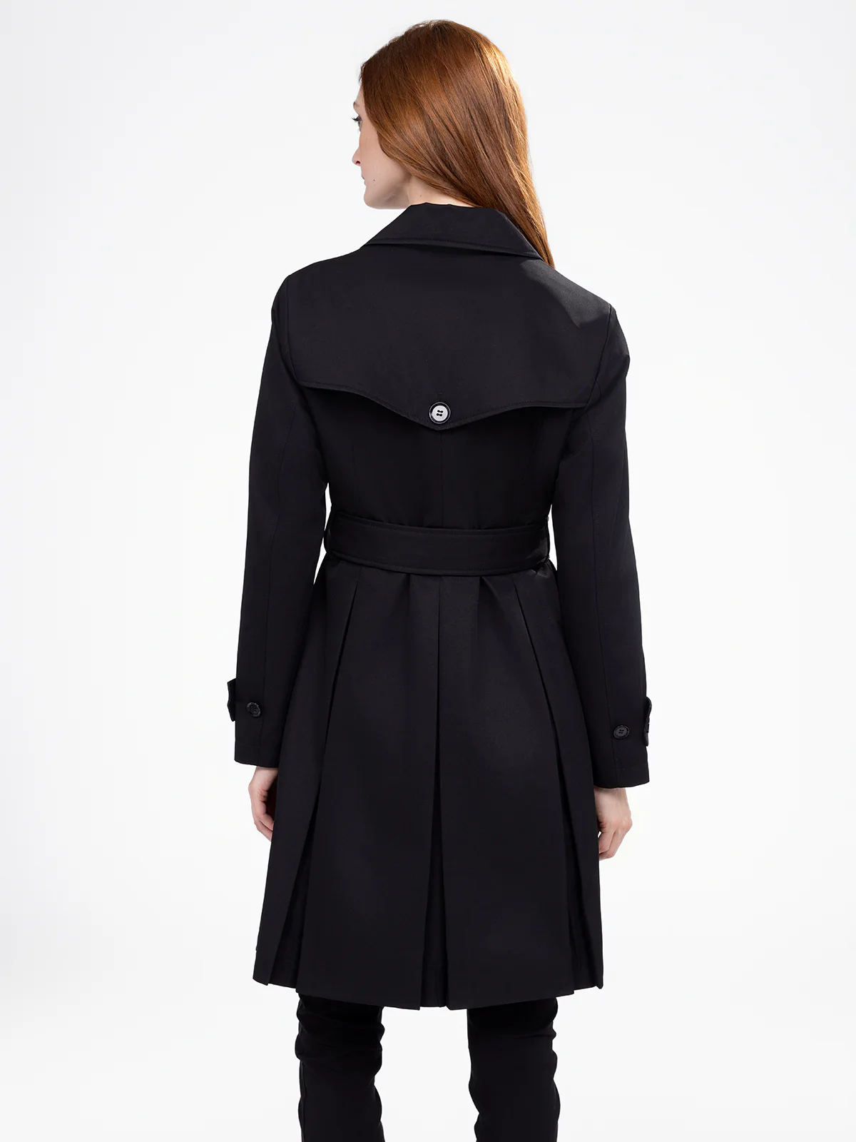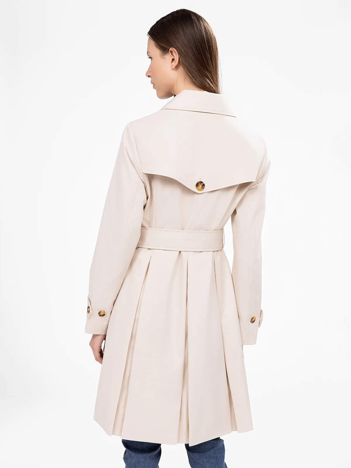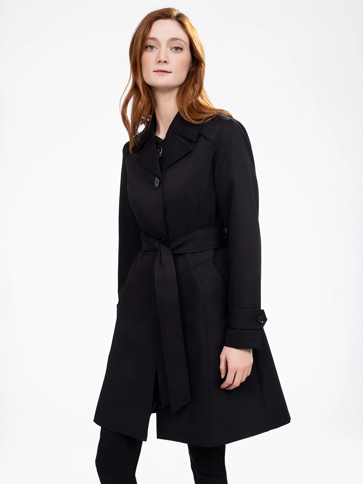 Ce trench mi-cuisse revisite un classique avec des détails soigneusement pensés : un col tailleur structuré, de grands boutons et une ceinture nouée pour souligner la taille. Son dos travaillé avec un empiècement boutonné et des plis profonds apporte une touche sophistiquée, tandis que les pattes boutonnées aux poignets permettent un ajustement précis. Fonctionnel et élégant, il dispose de poches latérales discrètes qui allient confort et praticité.