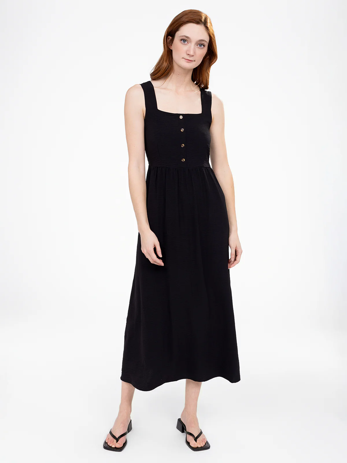 L’allure légère de cette robe est accentuée par un haut ajusté et un dos élastiqué, offrant un équilibre parfait entre maintien et fluidité. Les petits boutons ajoutent une touche charmante.