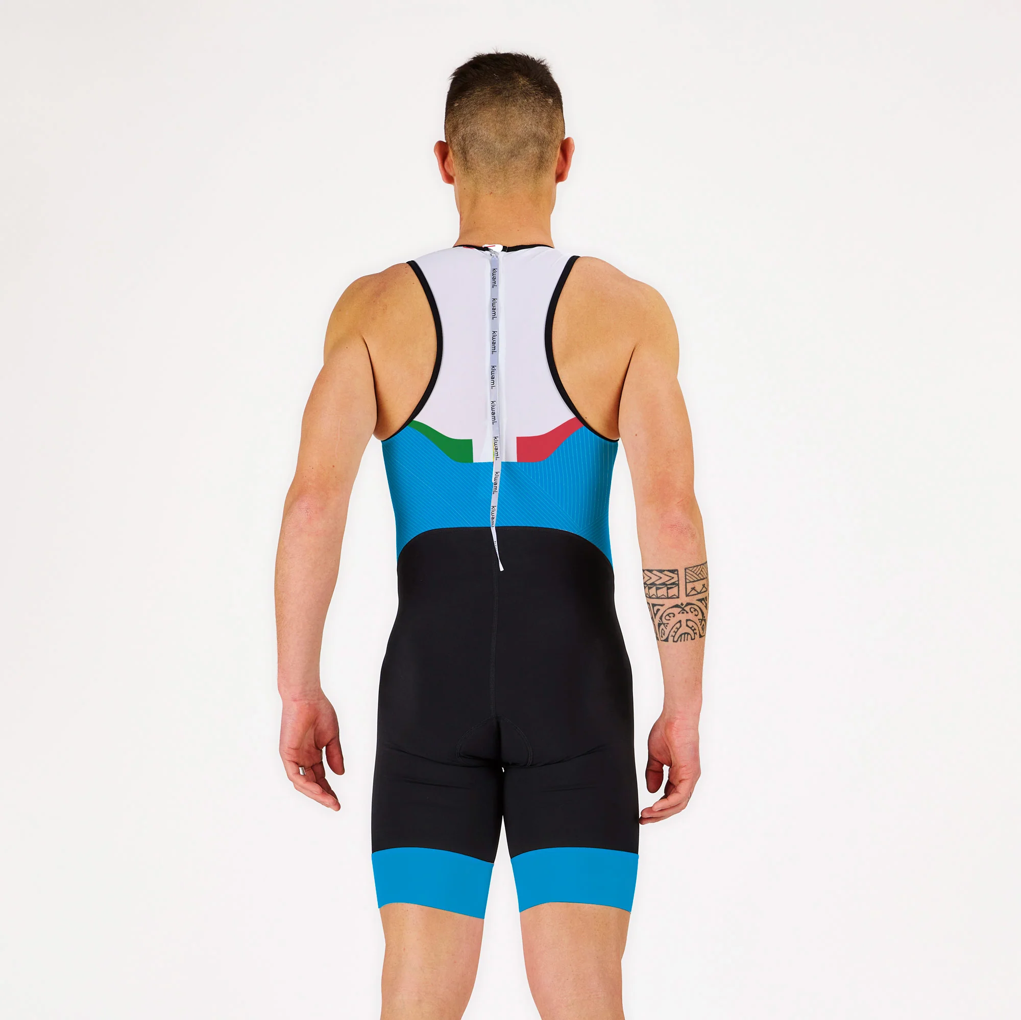 Ultra-légère, cette trifonction ne possède pas de poche pour un hydrodynamisme optimal en cas de natation sans néoprène. Sa chamoisine « mono-pad » ne retient pas l’eau et se fait oublier lors de votre course à pied ! Kiwami fabrique les NATION aux couleurs de TOUS les pays: demandez le vôtre à [email protected].