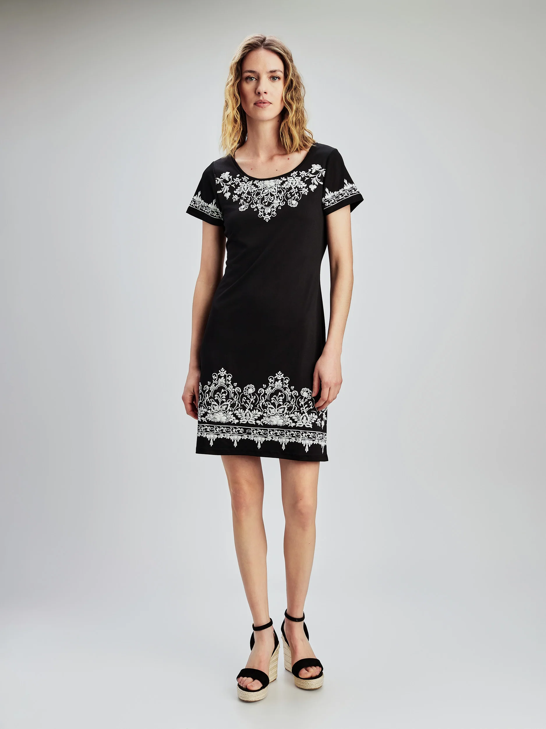 Optez pour cette robe imprimée à manches courtes. L’encolure ronde et la silhouette en ligne A restent simples, tandis que le motif ajoute un intérêt.