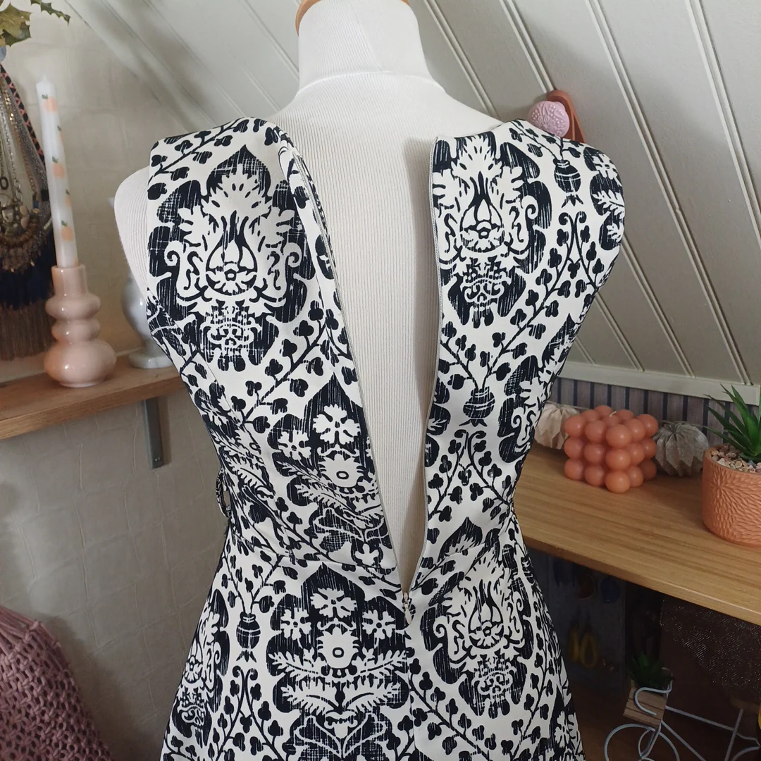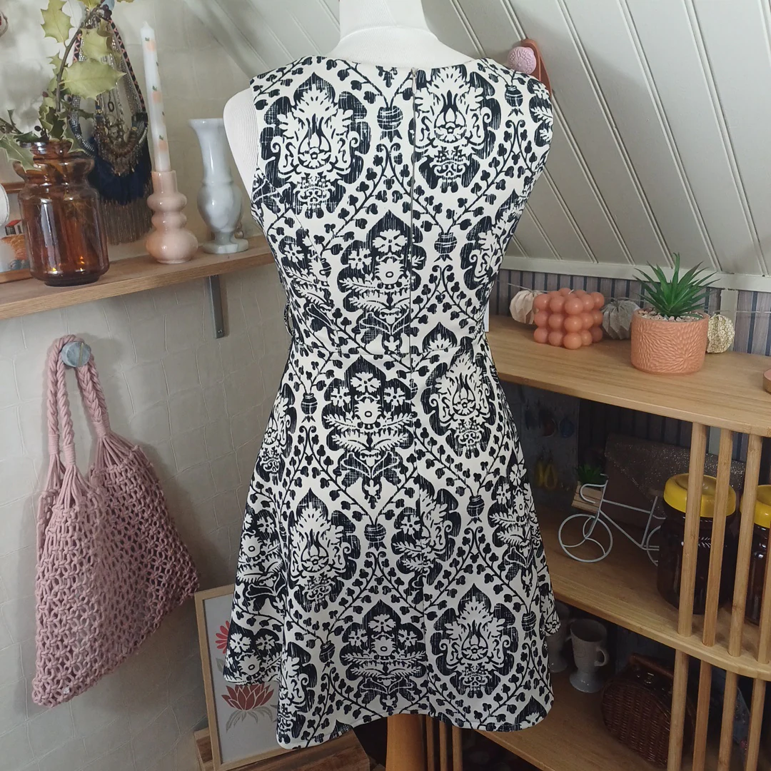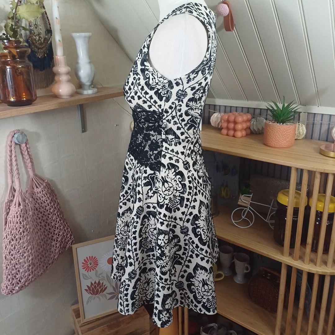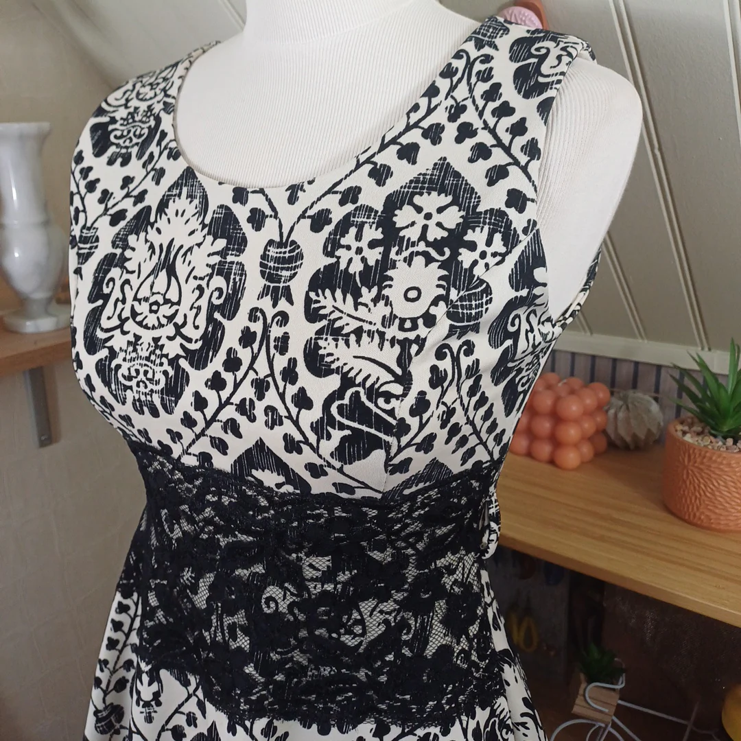 Robe blanche et noire ,empiècement en dentelle sur le devant, marque non indiquée, taille non indiquée conviendra pour une taille XS. Il n’y a pas la ceinture. Fermeture éclair sur l’arrière. Mesures: Tour de poitrine 80 cm Tour de taille 68 cm Épaule à épaule 33 cm Longueur 86 cm