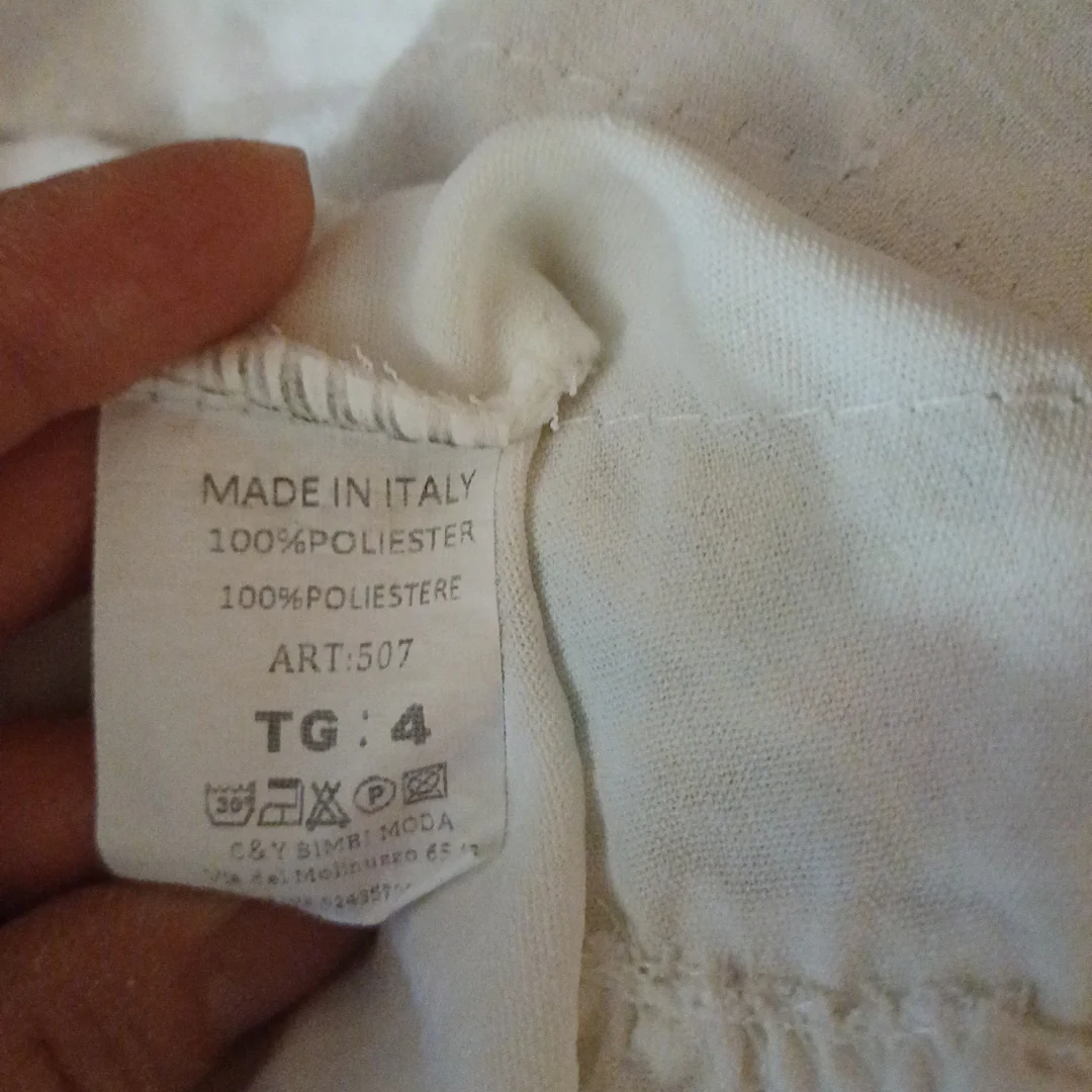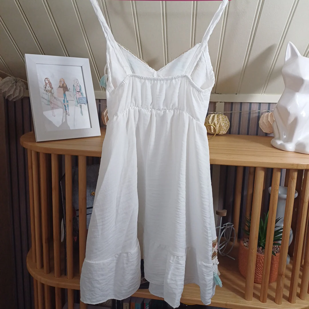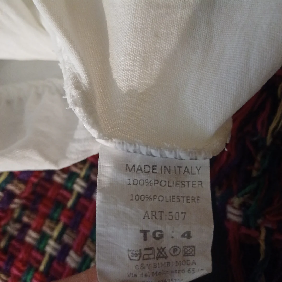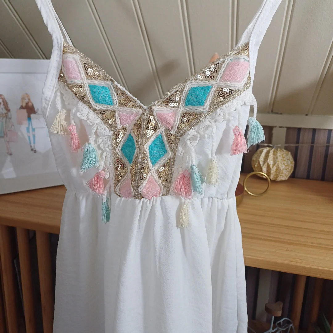 Robe blanche à motifs et pompons rose et bleu, marque non indiquée, taille indiquée 4 ans.