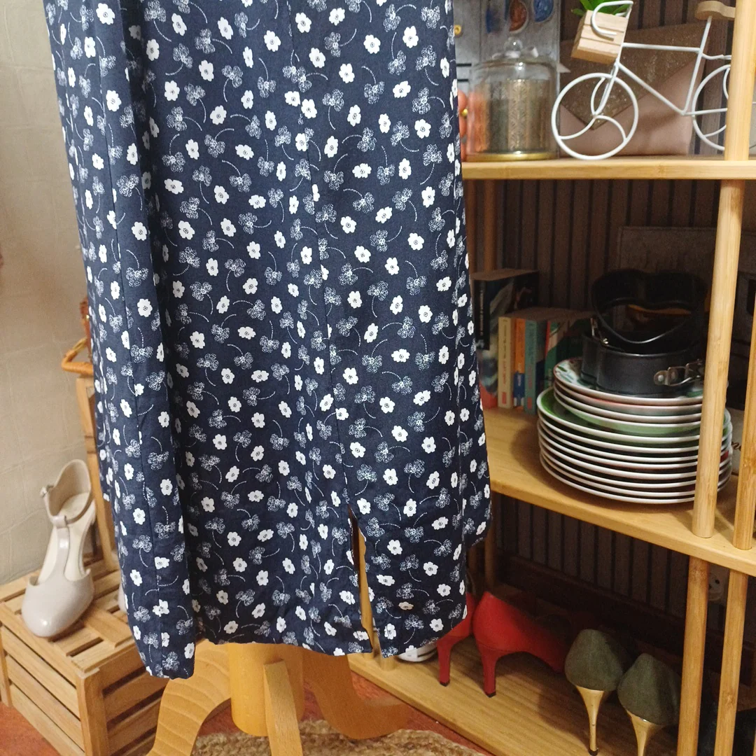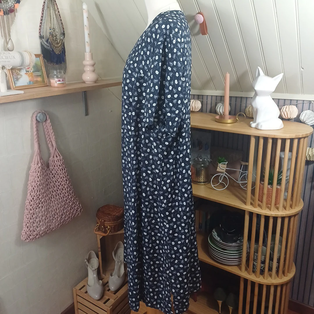 Robe boutonnée bleue à motifs blanches, marque non indiquée, taille non indiquée conviendra pour une taille 54/56. Mesures: Tour de poitrine 134 cm Épaule à épaule 44 cm Longueur 107 cm