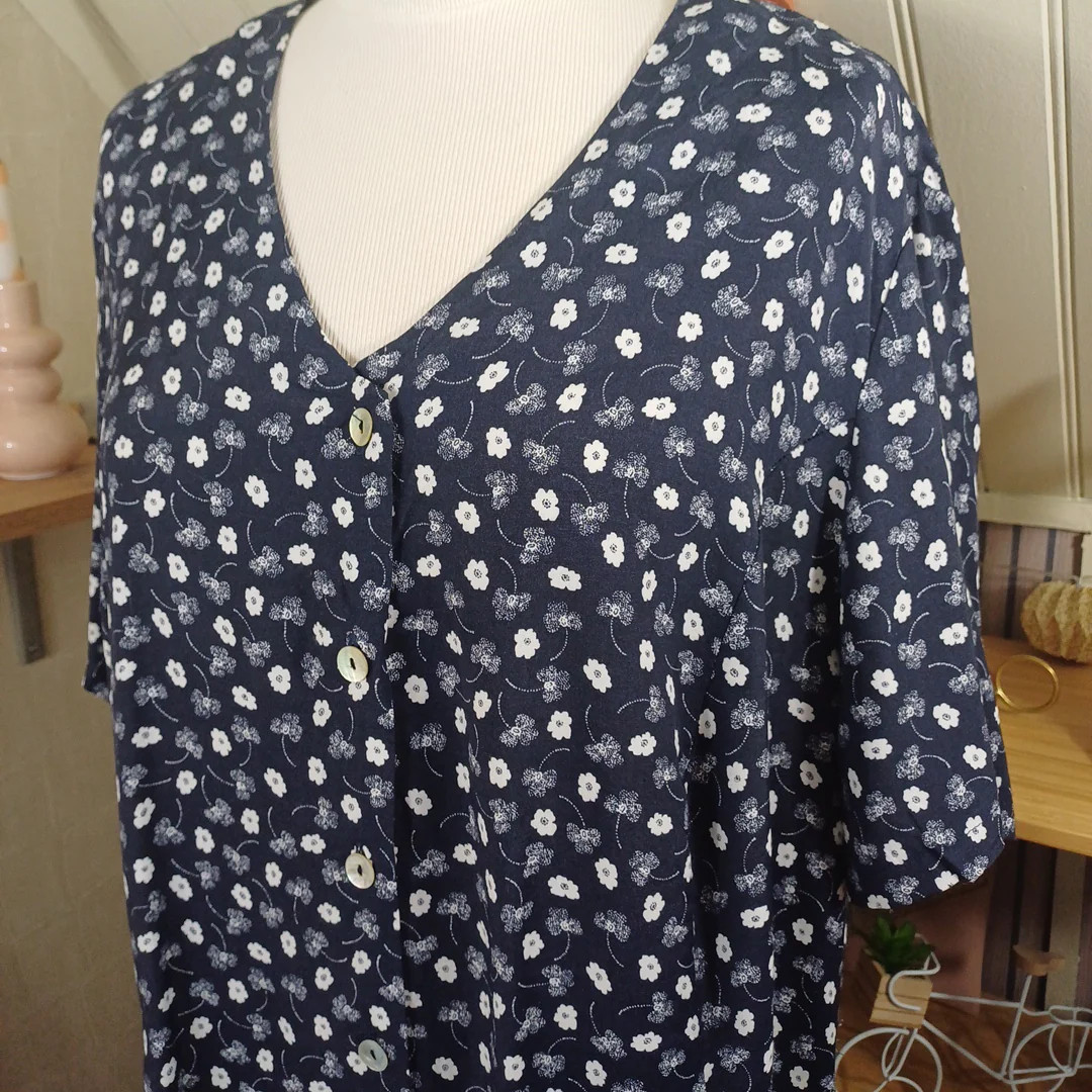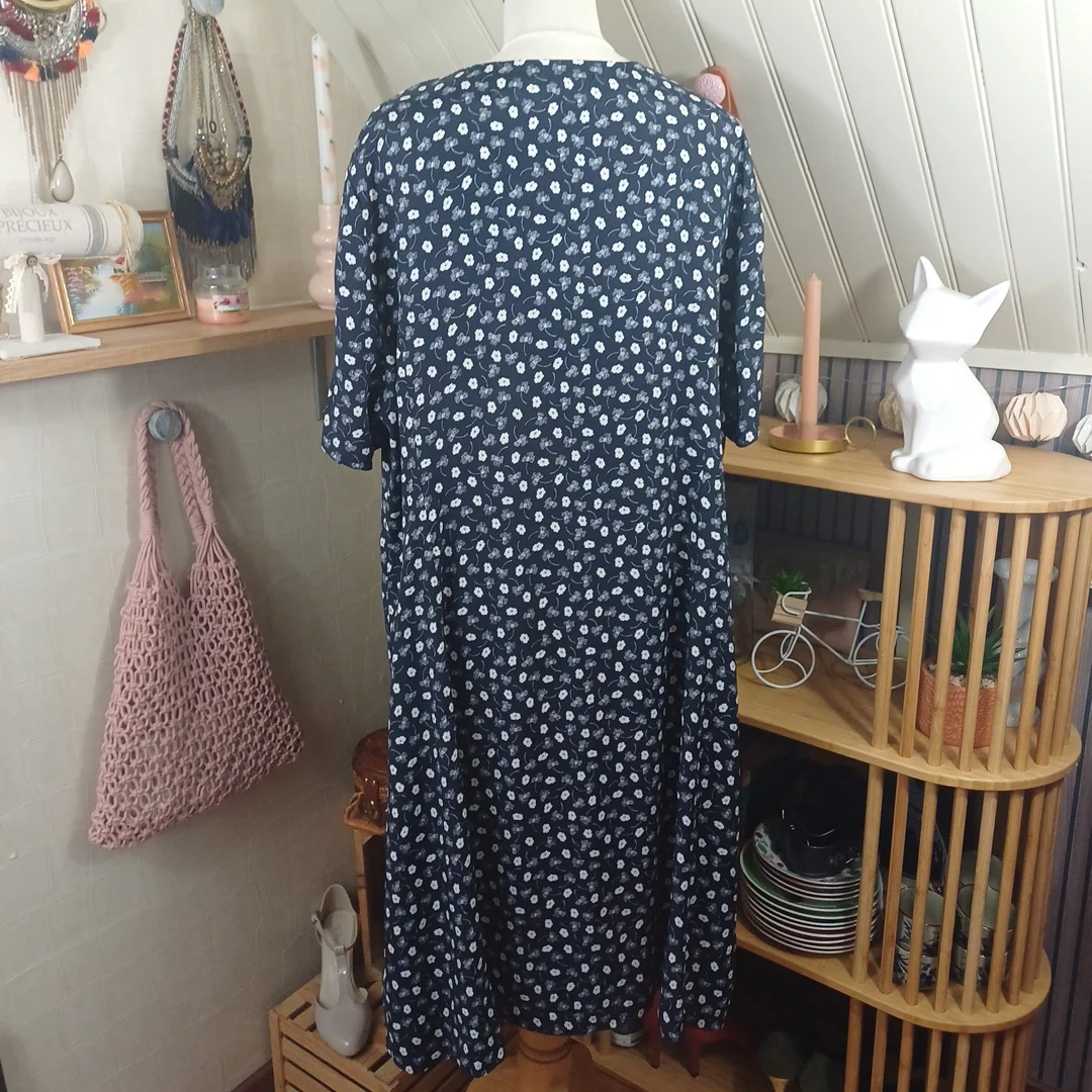 Robe boutonnée bleue à motifs blanches, marque non indiquée, taille non indiquée conviendra pour une taille 54/56.