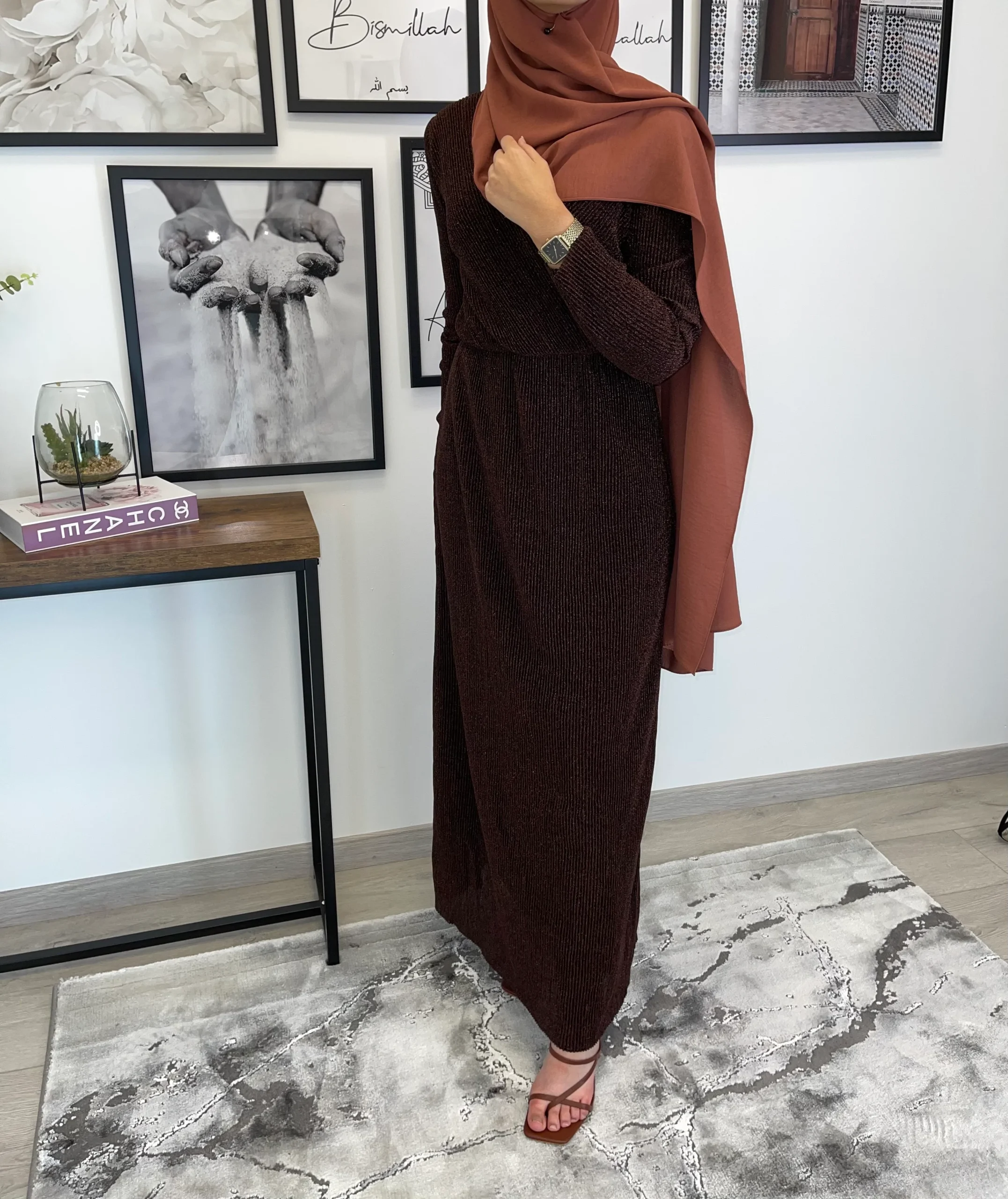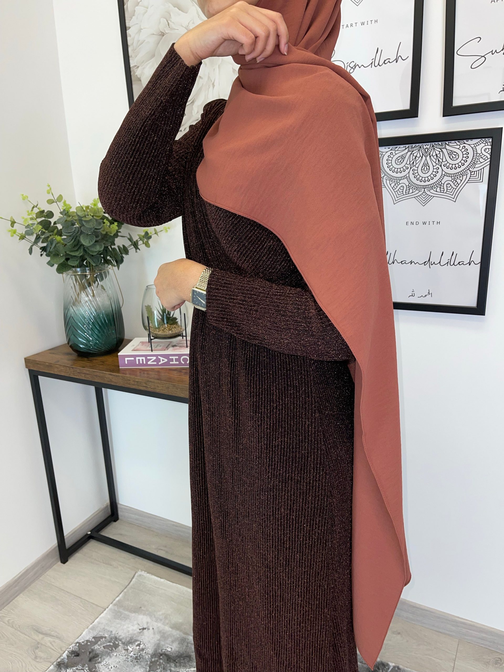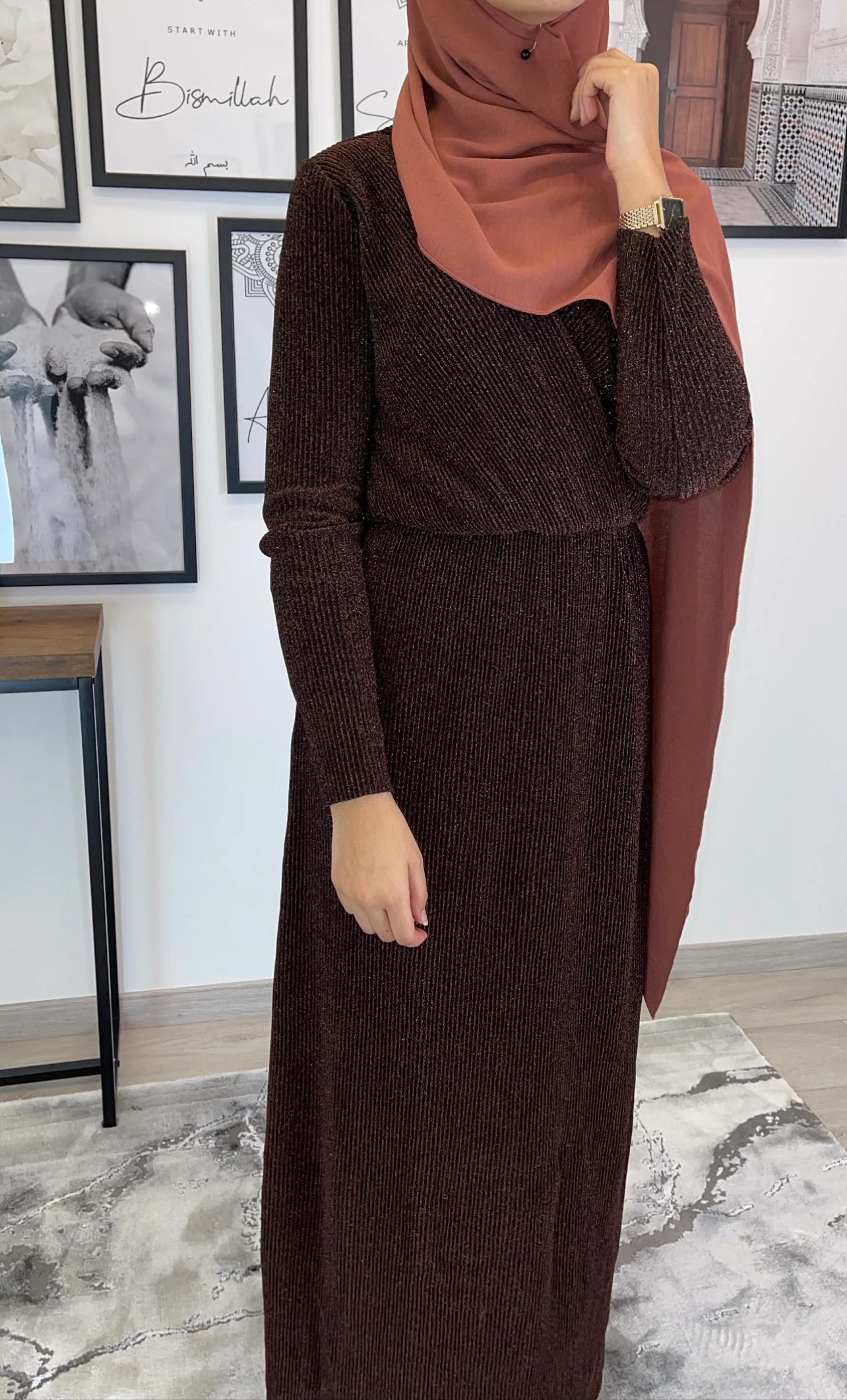 Magnifique robe longue avec décolleté cache cœur brillante plissée . Tissu doublé sauf les bras (reste néanmoins opaque), élastique sur la taille . Longueur de la robe 150cm. Tailles disponibles : S/M : 36/38 M/L : 40/42 L/XL: 42/44. Le mannequin porte du S/M , mesure 170 cm et porte habituellement du 36. h1541