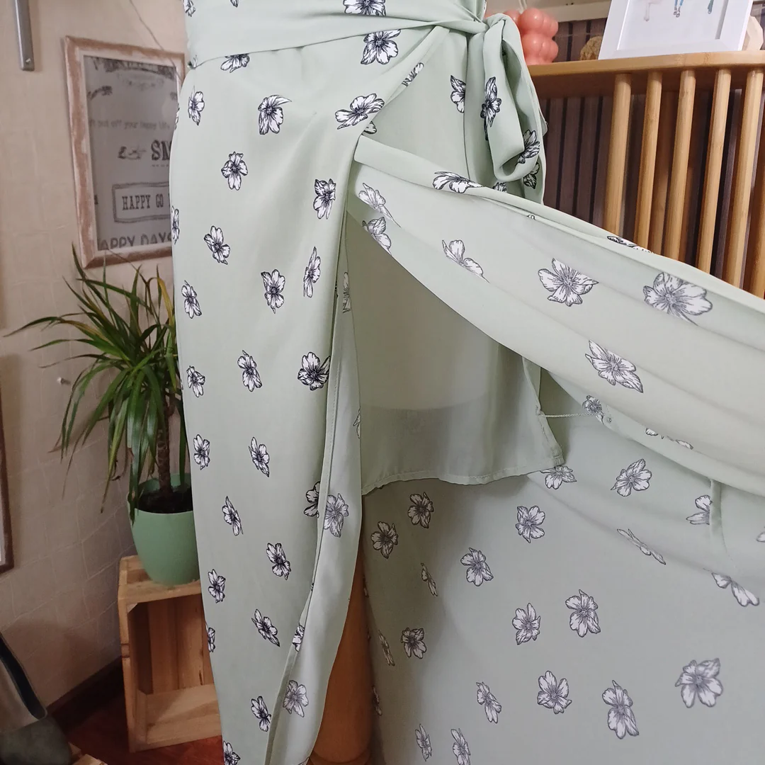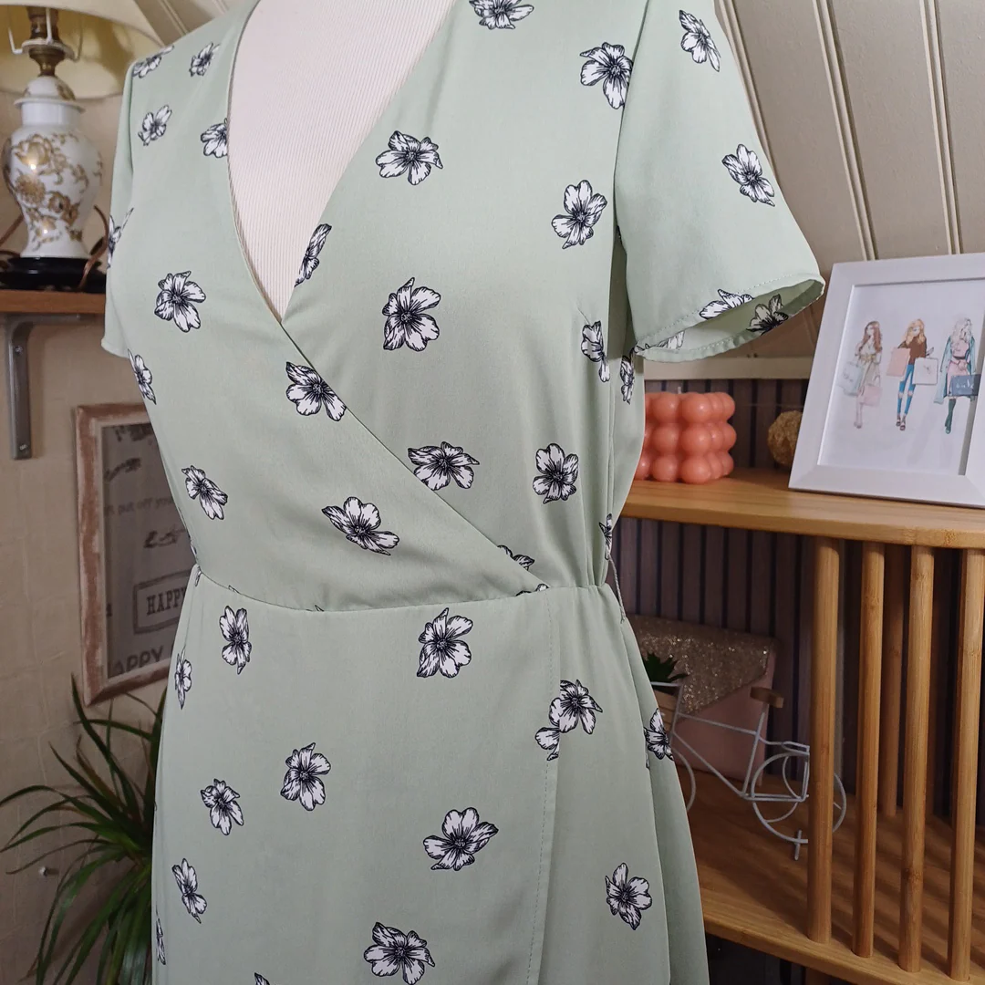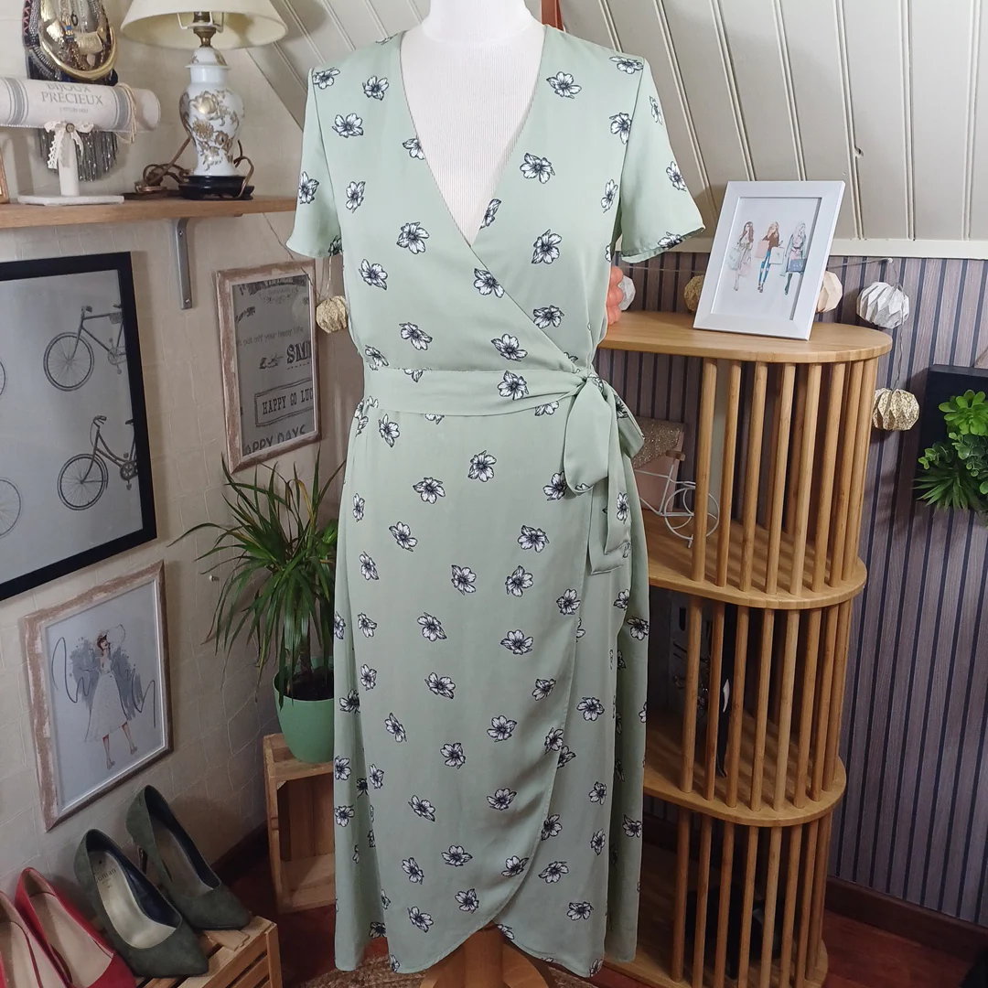 Robe de couleur vert amande à motifs fleurs avec un lien à nouer autour de la taille, H&M, taille indiquée 34