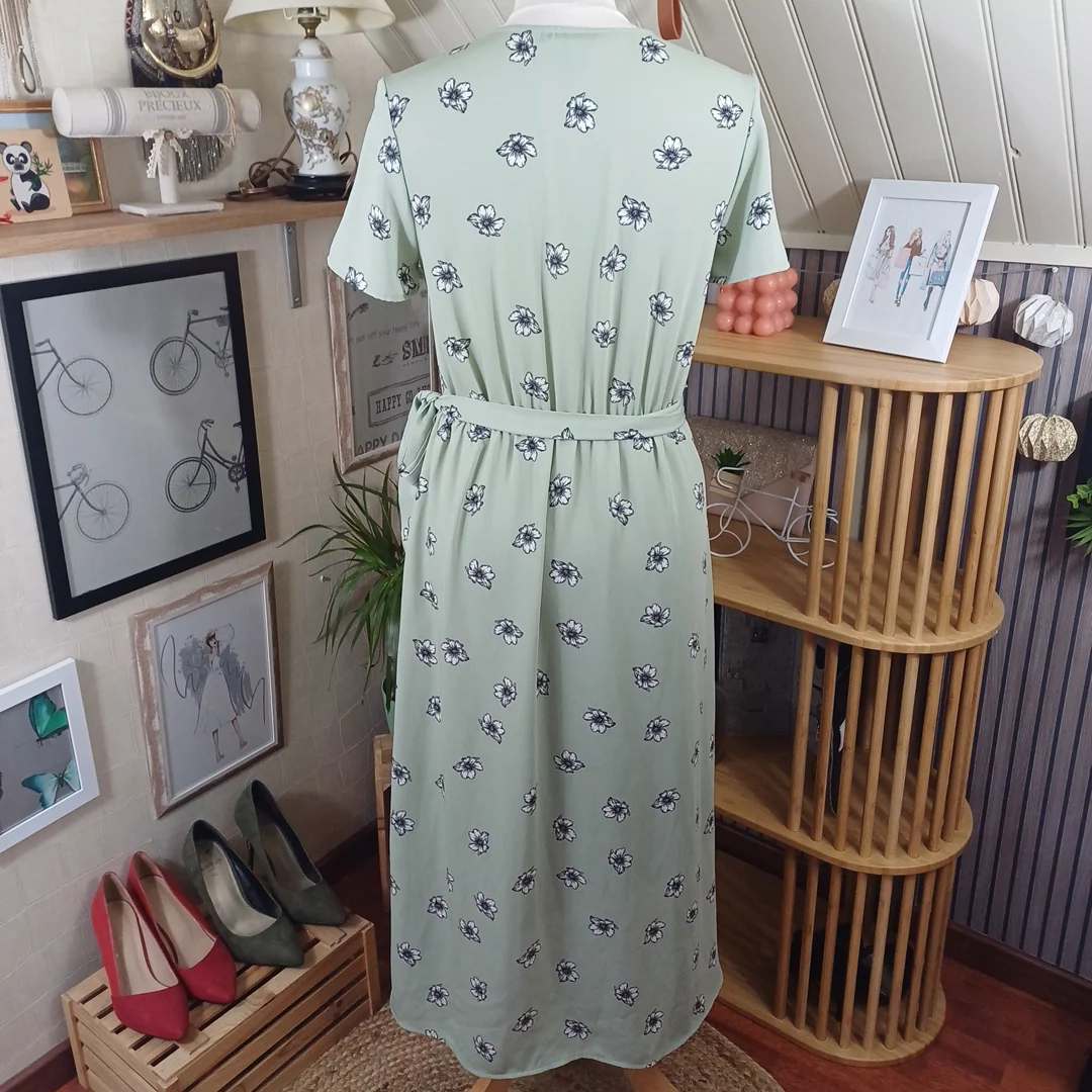Robe de couleur vert amande à motifs fleurs avec un lien à nouer autour de la taille, H&M, taille indiquée 34 Mesures: Tour de poitrine 82 cm Longueur 116 cm